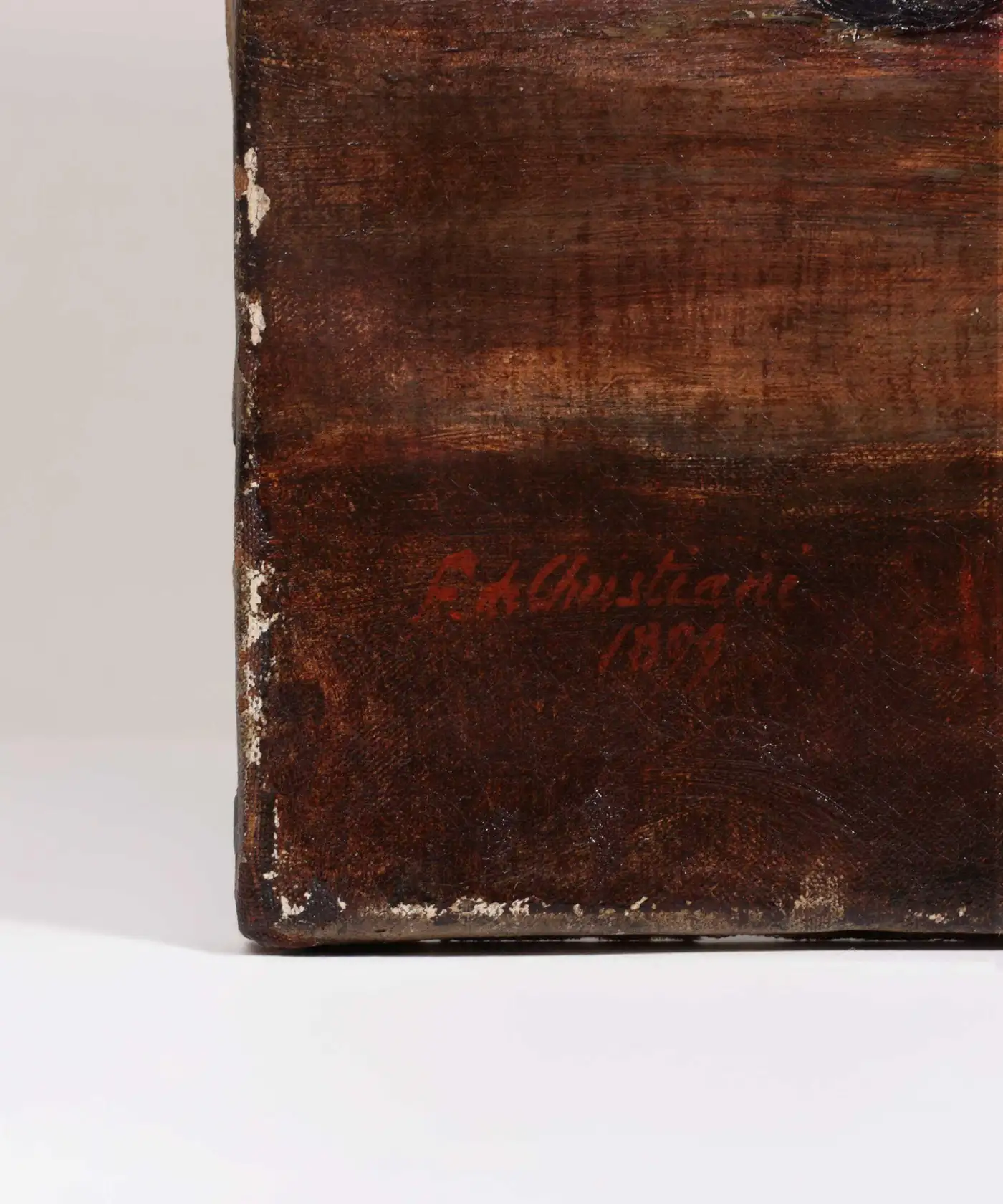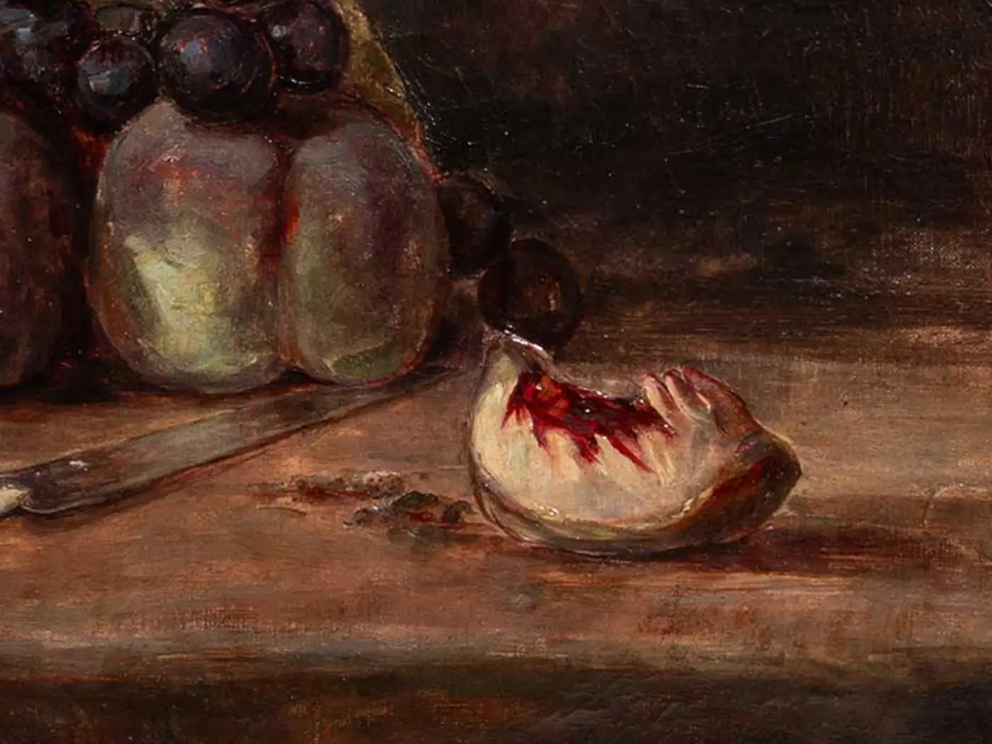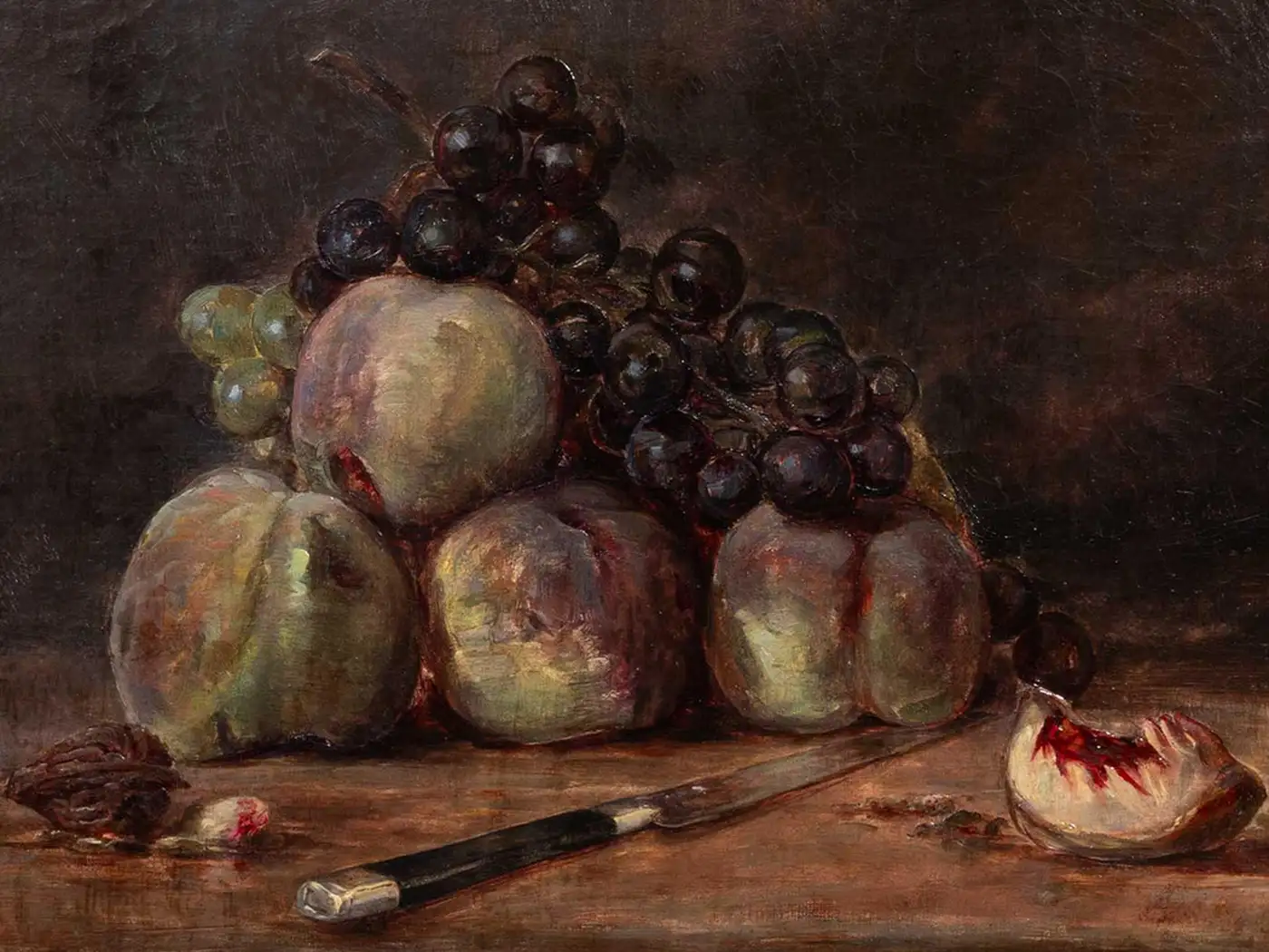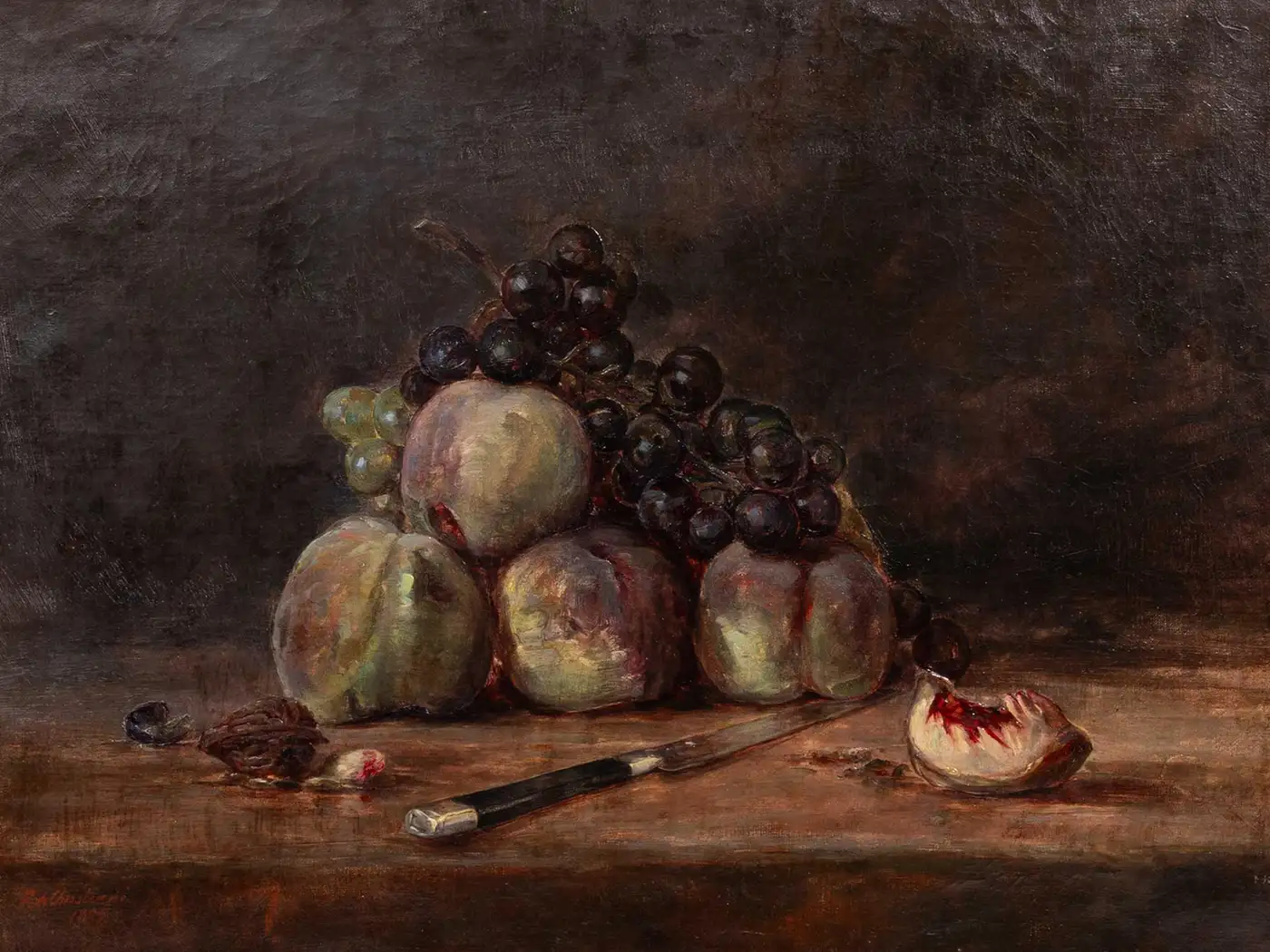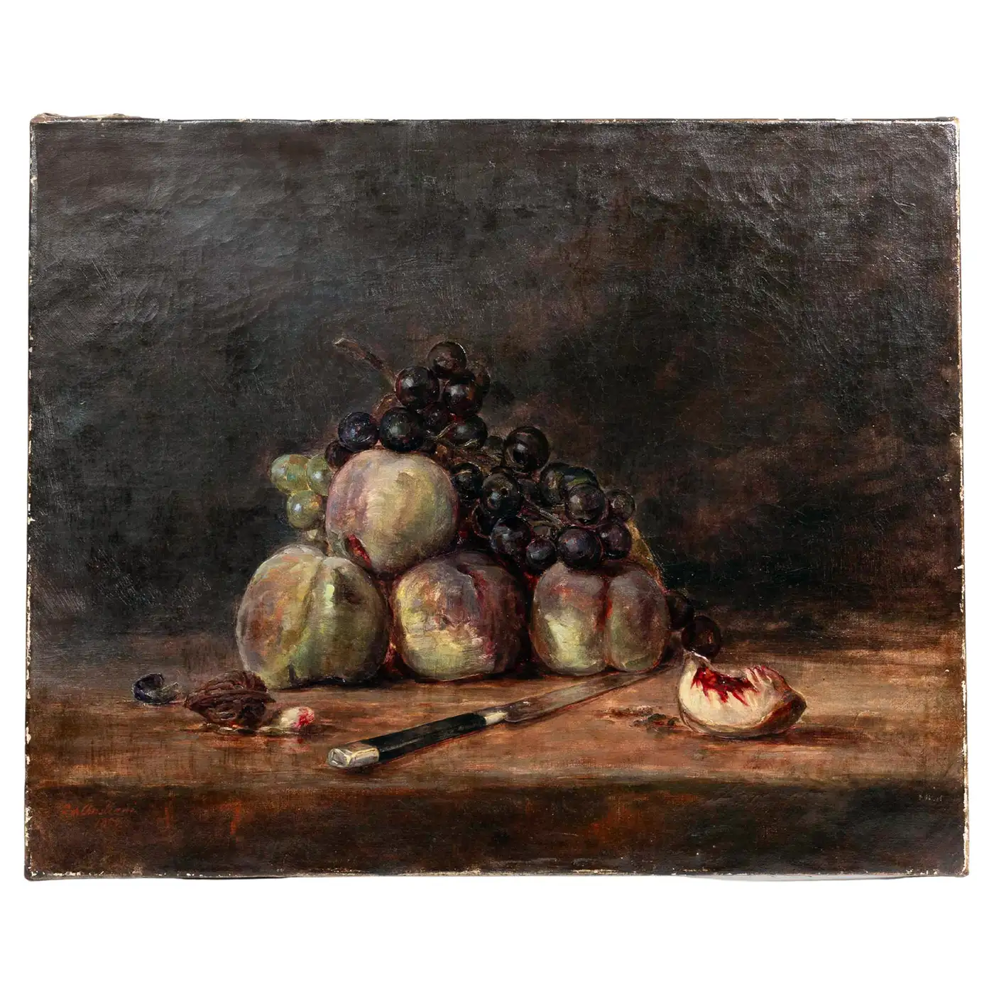 A refined 19th-century still life by the artist E. de Christiani, depicting a sumptuous arrangement of ripe peaches and dark grapes, meticulously rendered in oil on canvas. A paring knife and a split peach rest on a rustic tabletop, evoking both abundance and ephemerality. The rich chiaroscuro background highlights the warm, tactile quality of the fruit and the subtle nuances of the palette. Painted in 1899, this composition reflects the lingering influence of academic realism with hints of naturalism, and would appeal to collectors of traditional still lifes and period continental painting. Condition: Overall in very good condition for its age, with minor wear to the edges consistent with age and handling. Unframed.