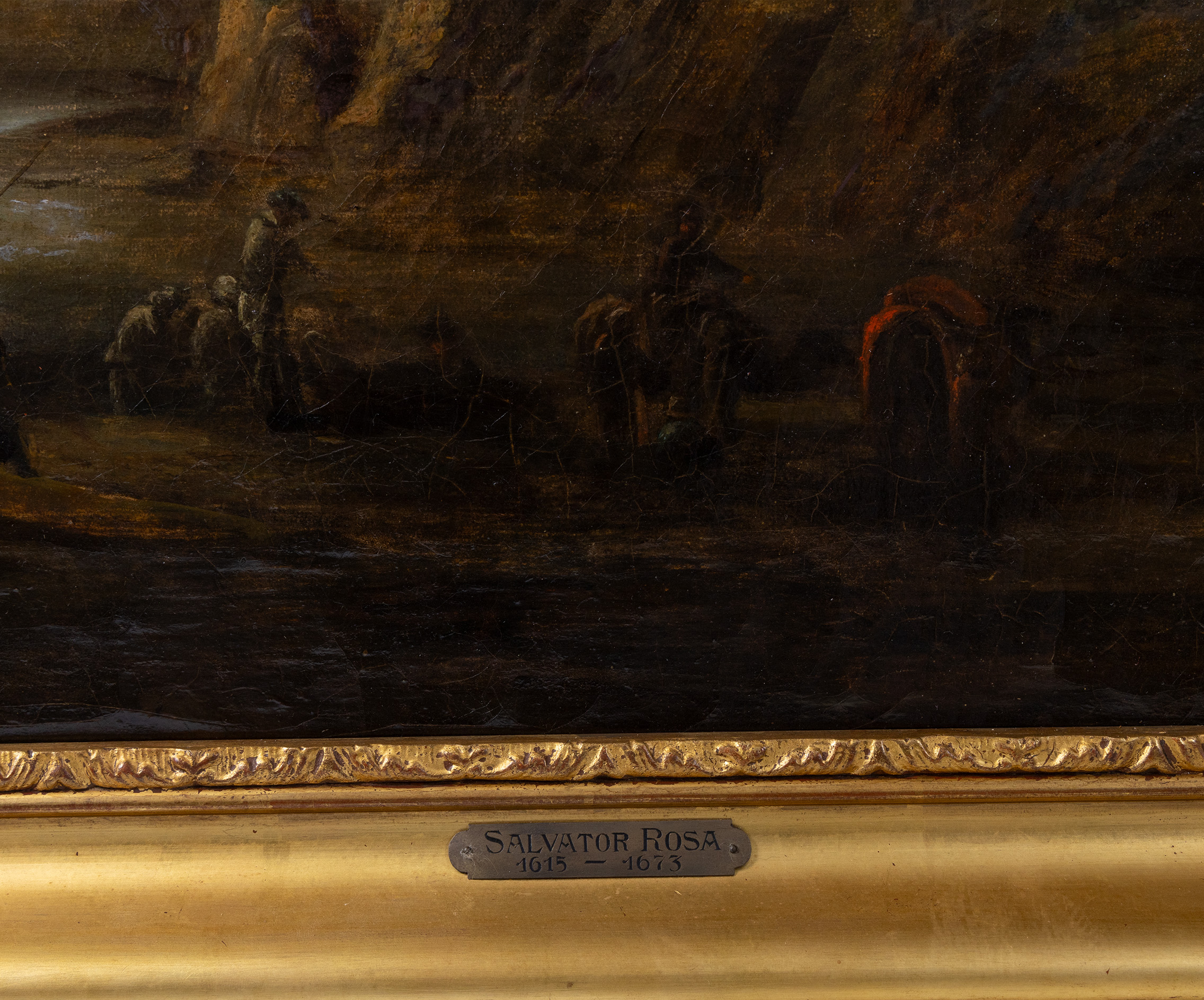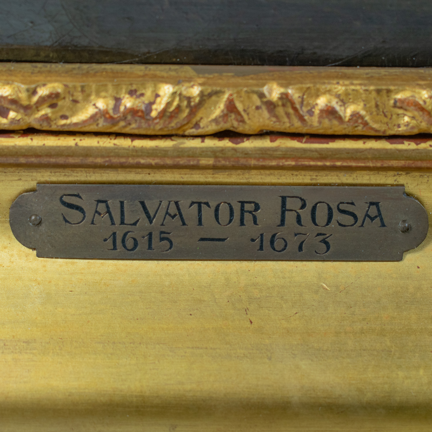 The painting carries a plaque with the name of the attributed artist Salvator Rosa (1615-1673), an artist renowned for his dramatic landscapes and compelling narrative compositions. While attributed to Rosa, the painting is likely the work of a talented follower or artist within his circle. It captures the essence of his distinctive style and thematic focus.