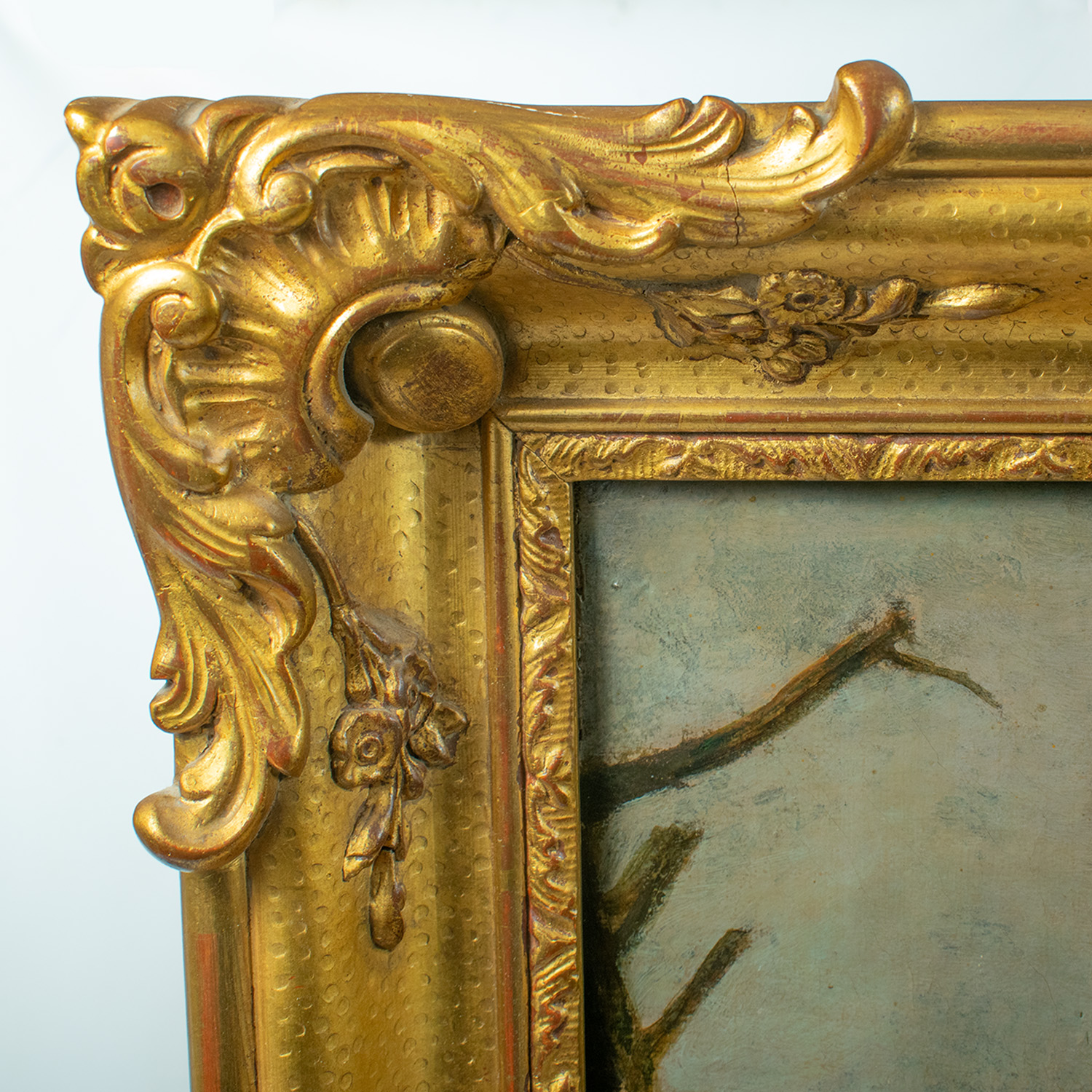 The painting is in good condition but show signs of some minimal old restorations. It shows craquelure overall and is in very good condition for it’s age. The frame is also in very good condition with some age related wear as you would expect.