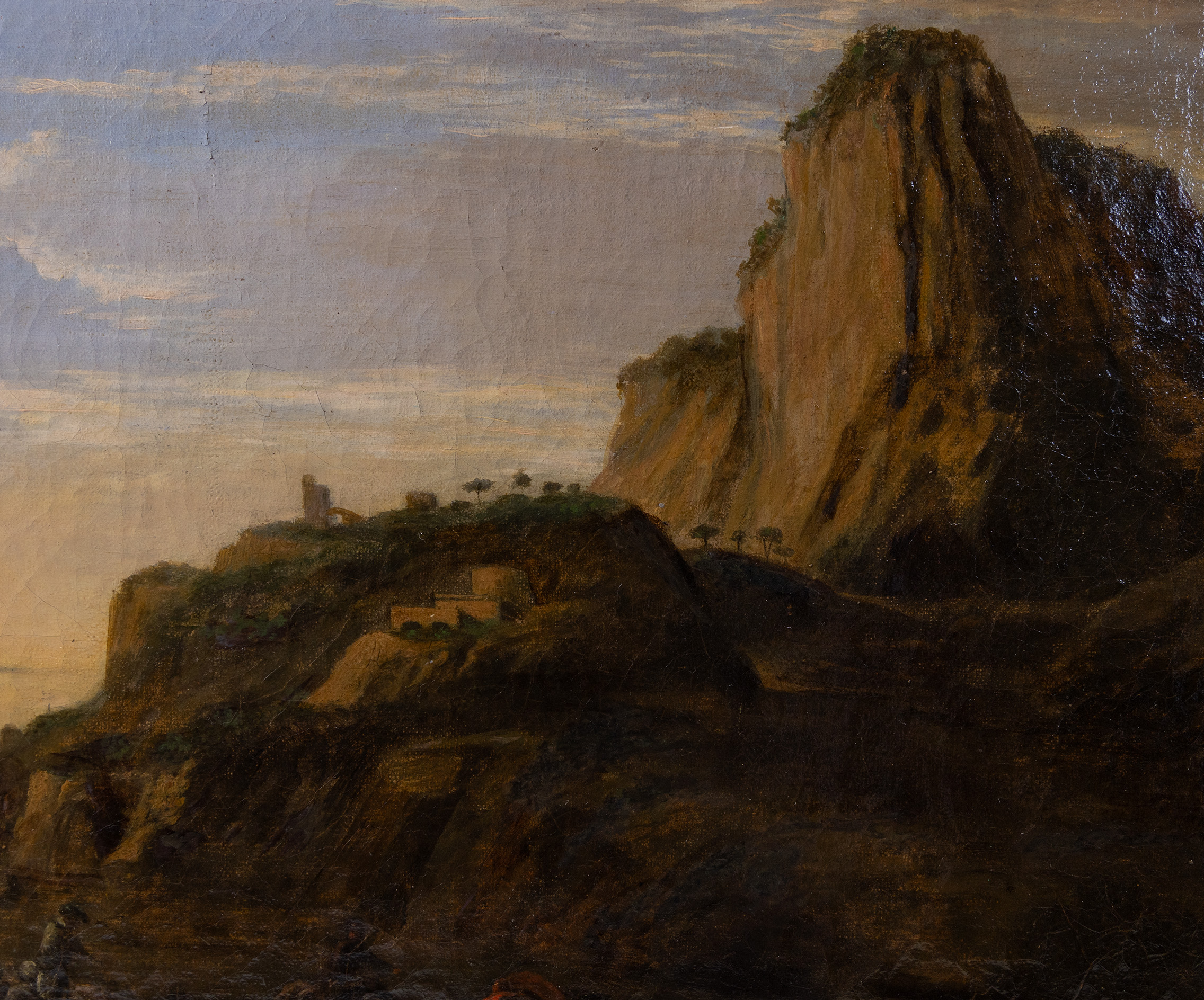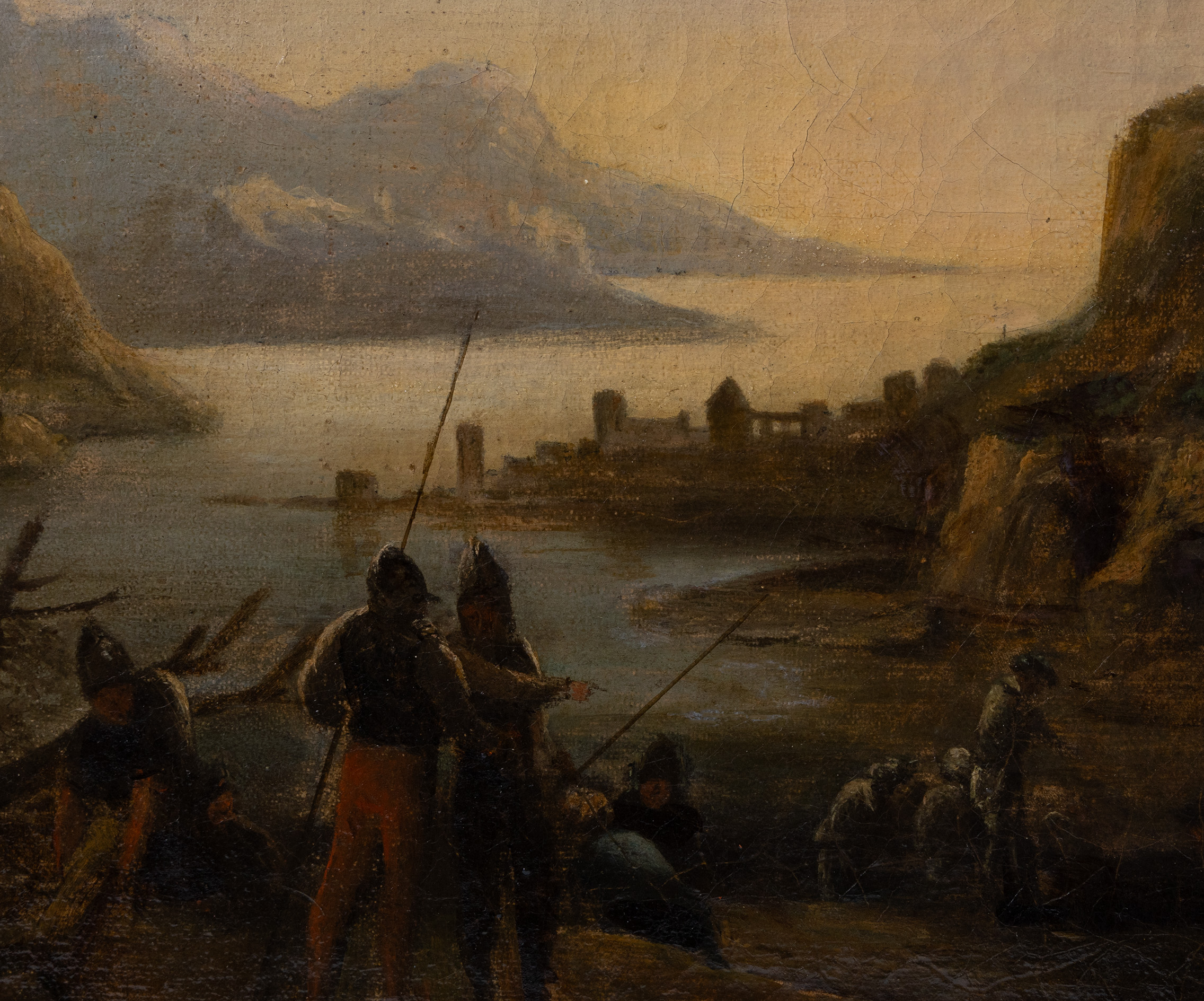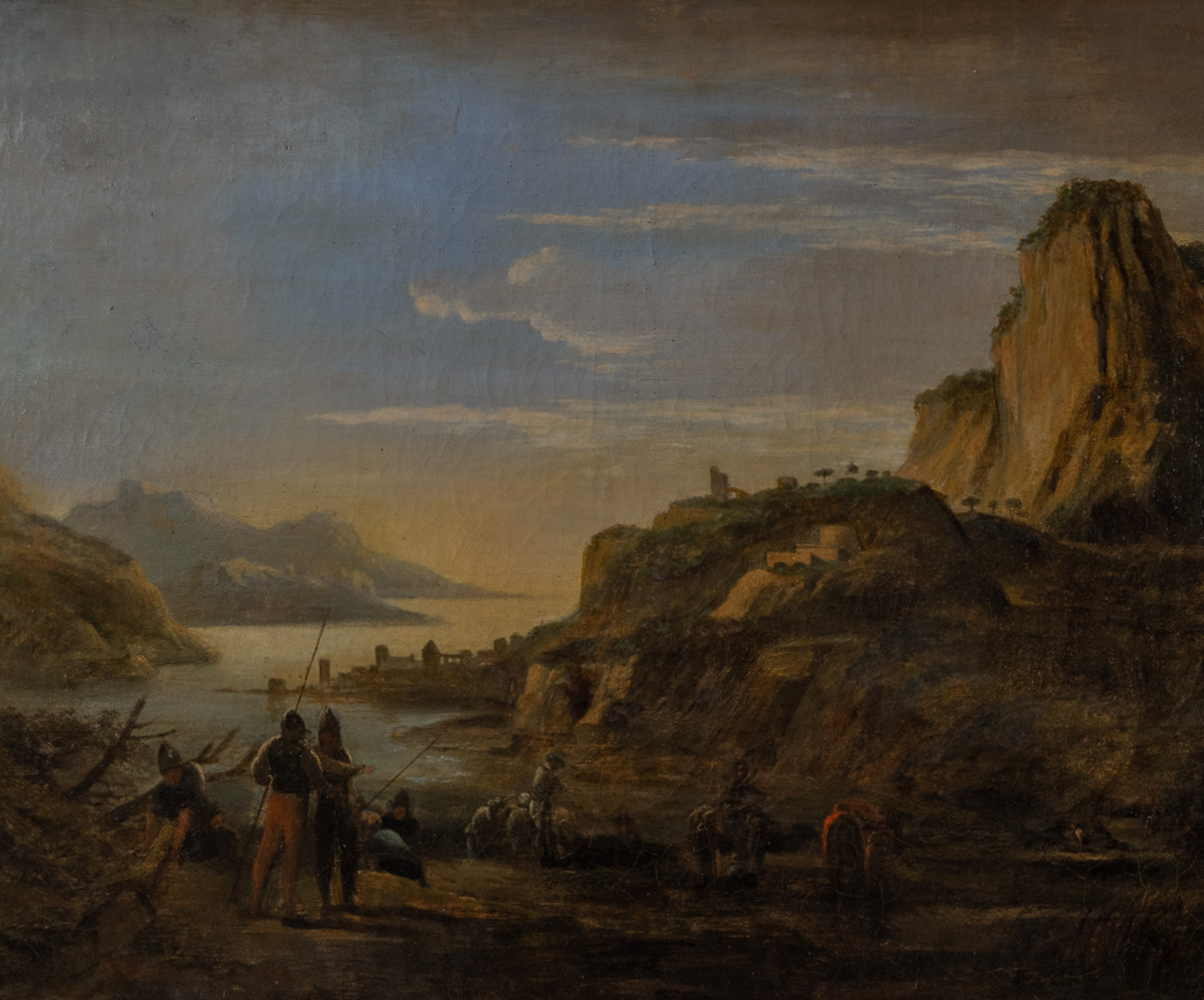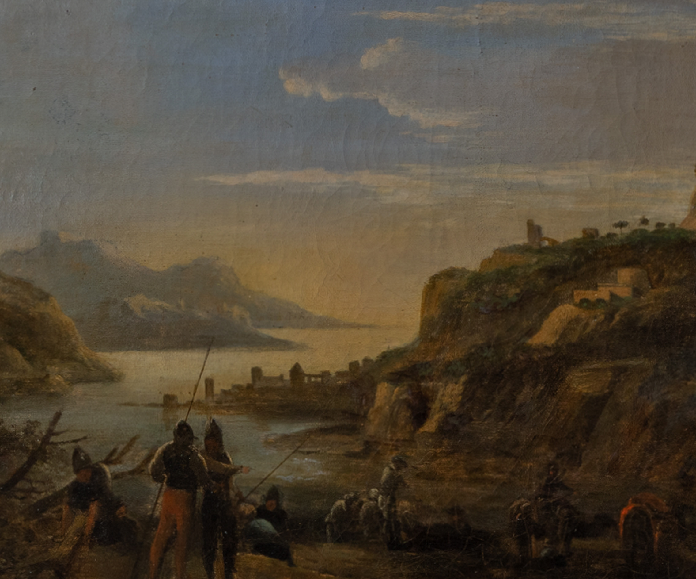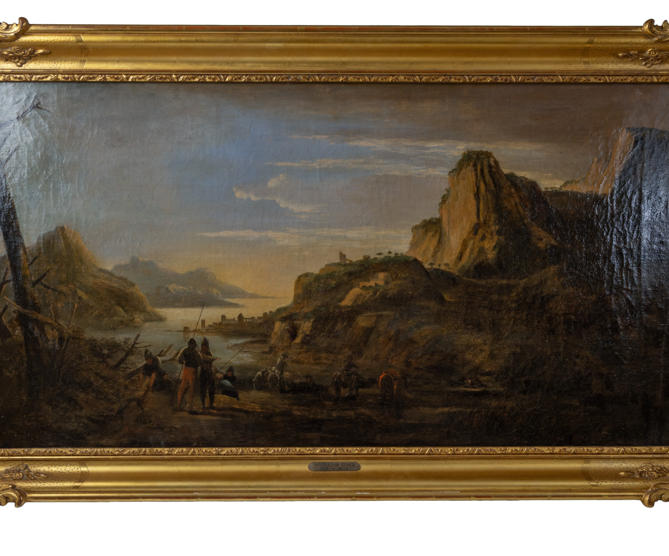A romantic and captivating scene from the Italian Baroque period, the painting depicts soldiers and travellers resting amidst a rocky coastal landscape. Executed in oil on canvas, the canvas measures 50 x 93 cm. It iss presented in a splendid gilt frame, bearing a label from a renowned framer P Loretti SA in Geneva.