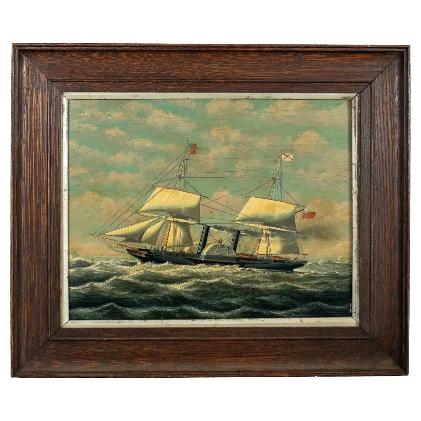 This is a superb painting of this paddle steam ship in full sale in open sea. The painting shows intricate details of a piece of maritime history. It is framed in its original oak frame. Both frame and painting are in very good condition.
