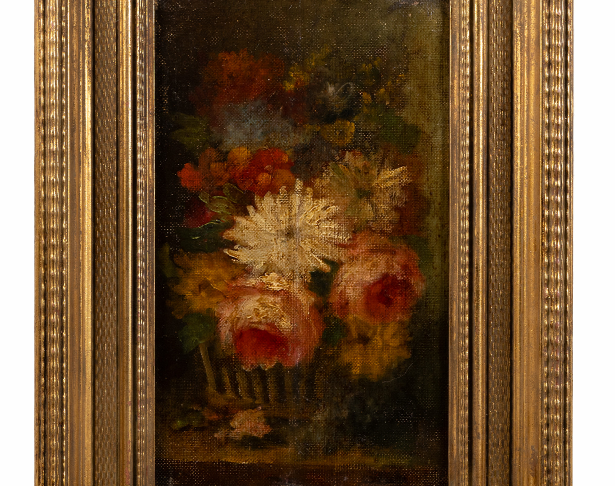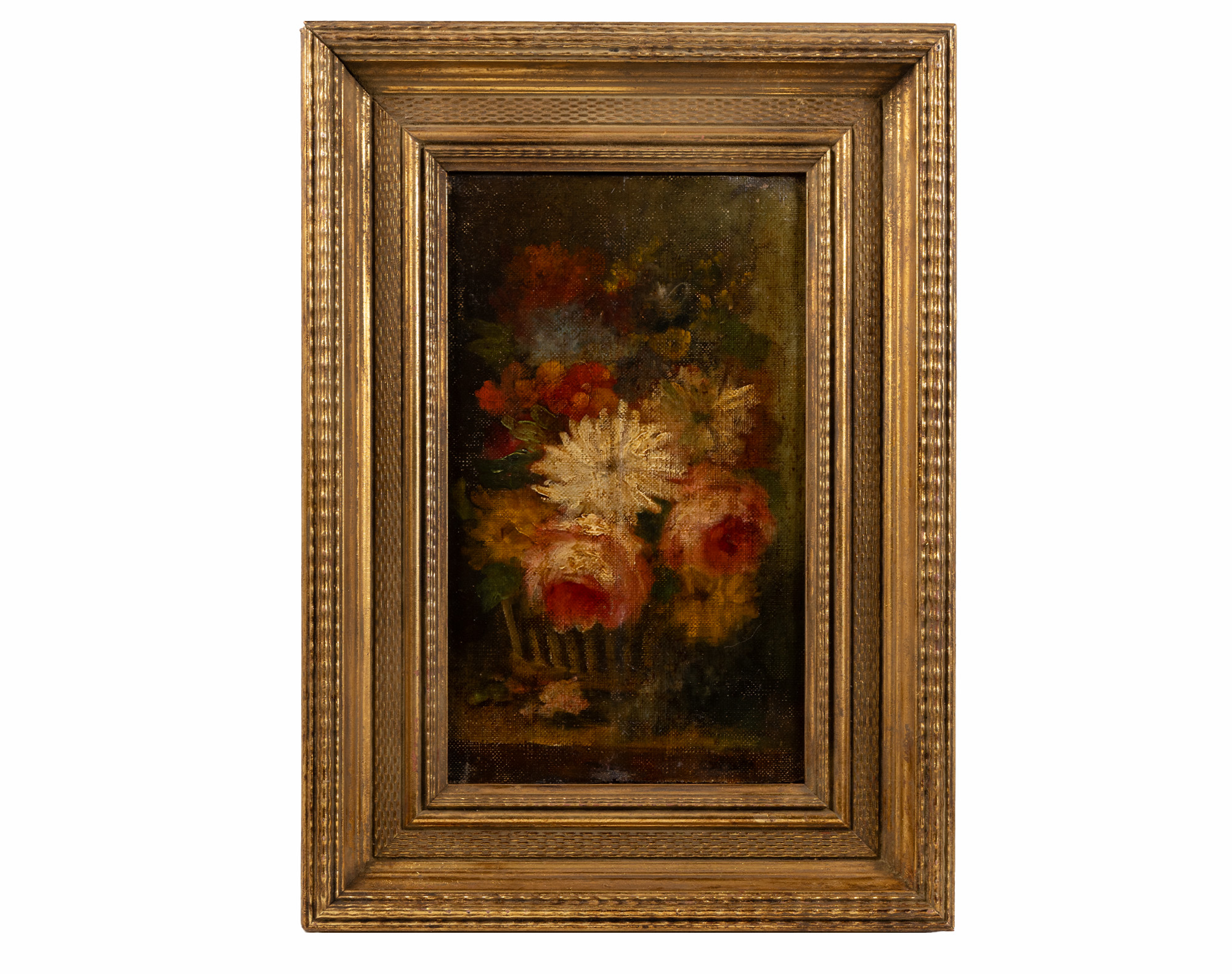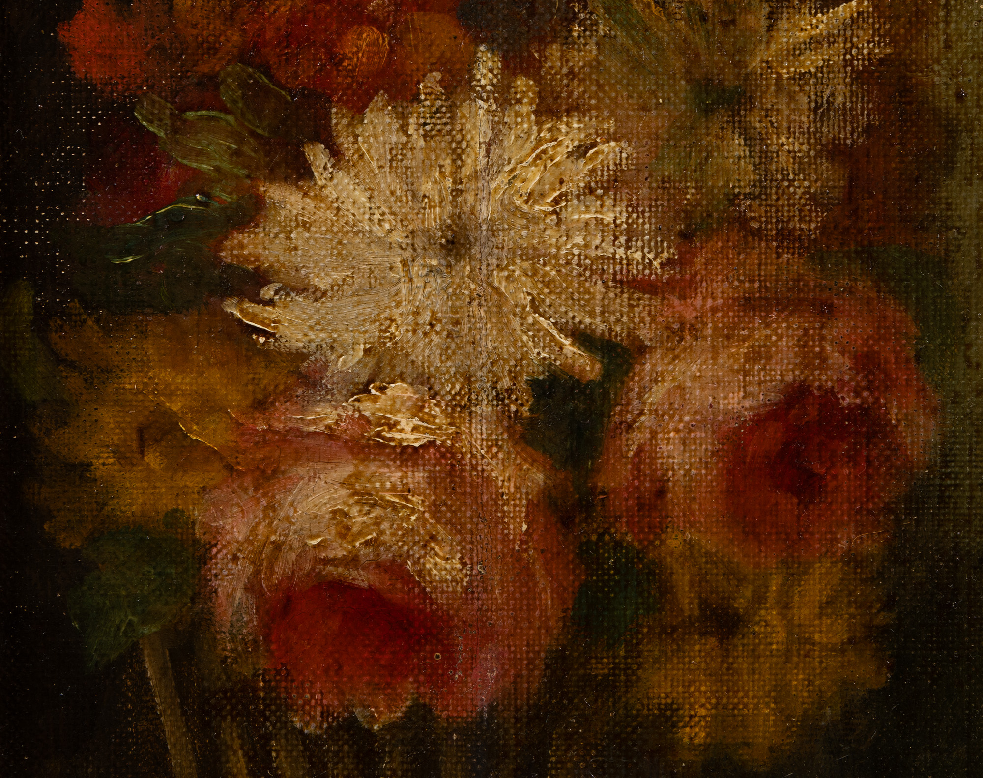 A beautifully atmospheric antique oil on canvas mounted on to oak panel depicting a floral still life, composed with a rich and moody palette. The arrangement features a variety of blooms—likely chrysanthemums and roses—painted in warm tones of cream, deep red, and soft ochre, set against a dark, softly blended background.