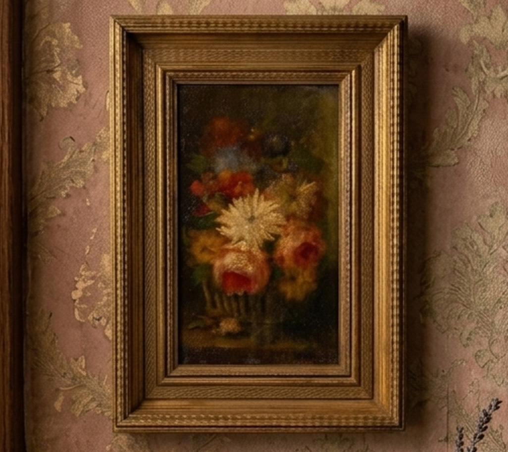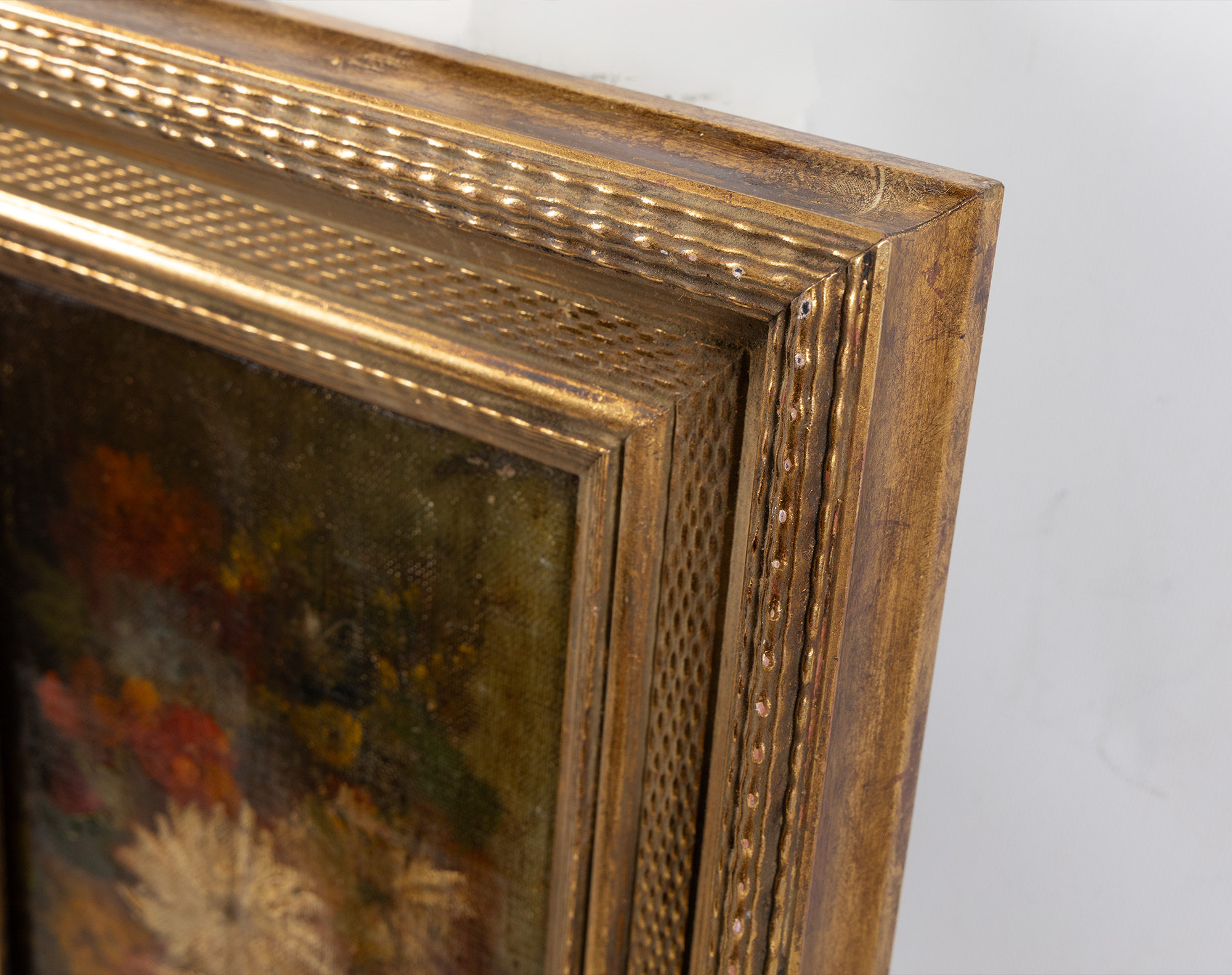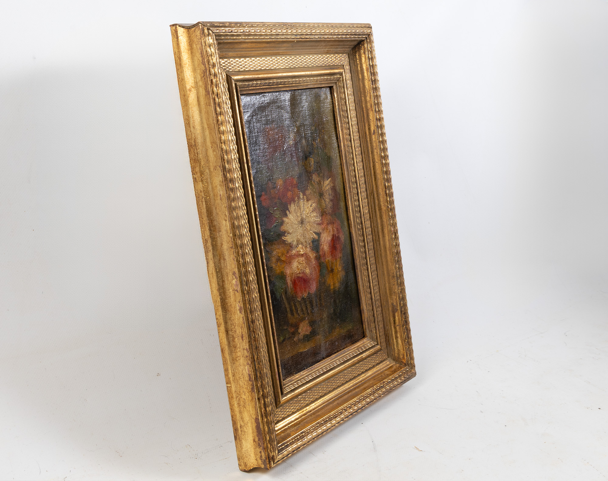 A beautifully atmospheric antique oil on canvas mounted on to oak panel depicting a floral still life, composed with a rich and moody palette. The arrangement features a variety of blooms—likely chrysanthemums and roses—painted in warm tones of cream, deep red, and soft ochre, set against a dark, softly blended background.
