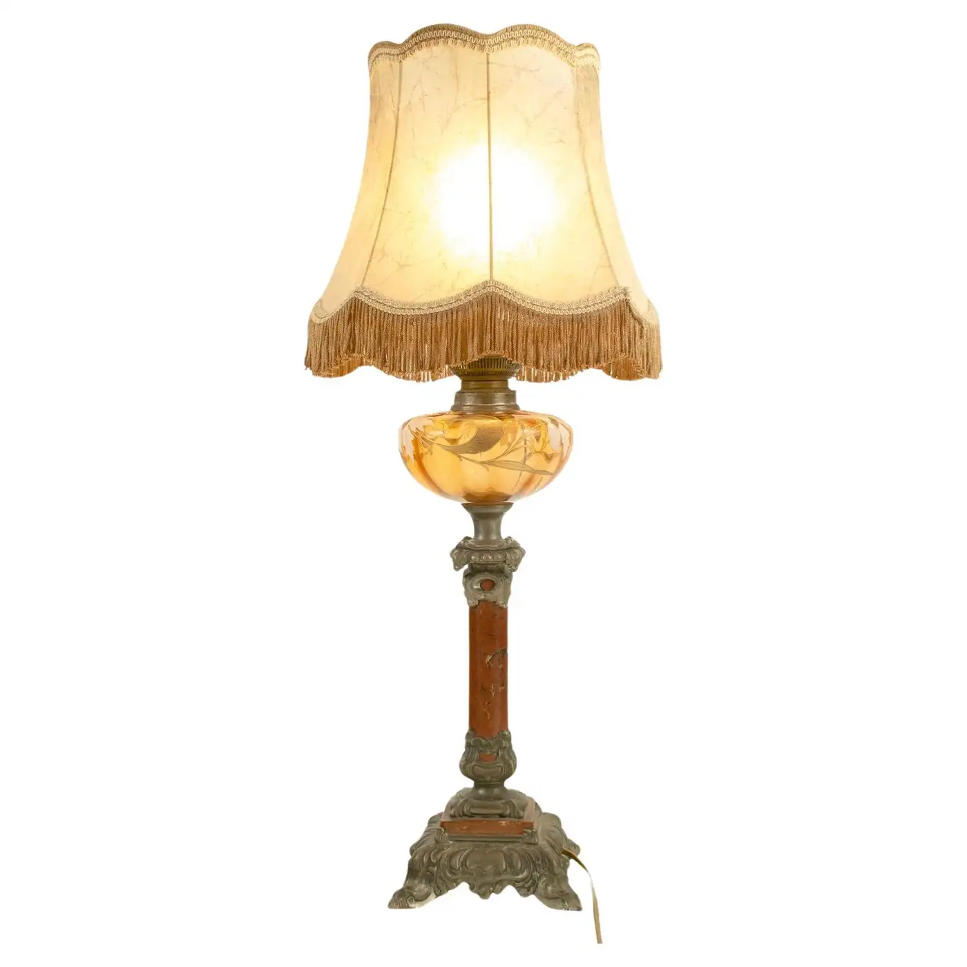 Large Traditional French Art Nouveau petrol lamp converted to electricity with original lamp shade, circa 1900. With red marble and spelter base and glass bowl with hand painted floral decoration. The wiring is in good working order. Height 73cm