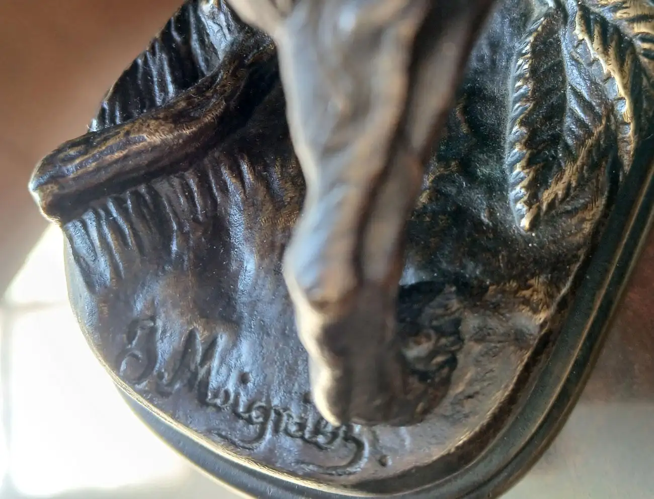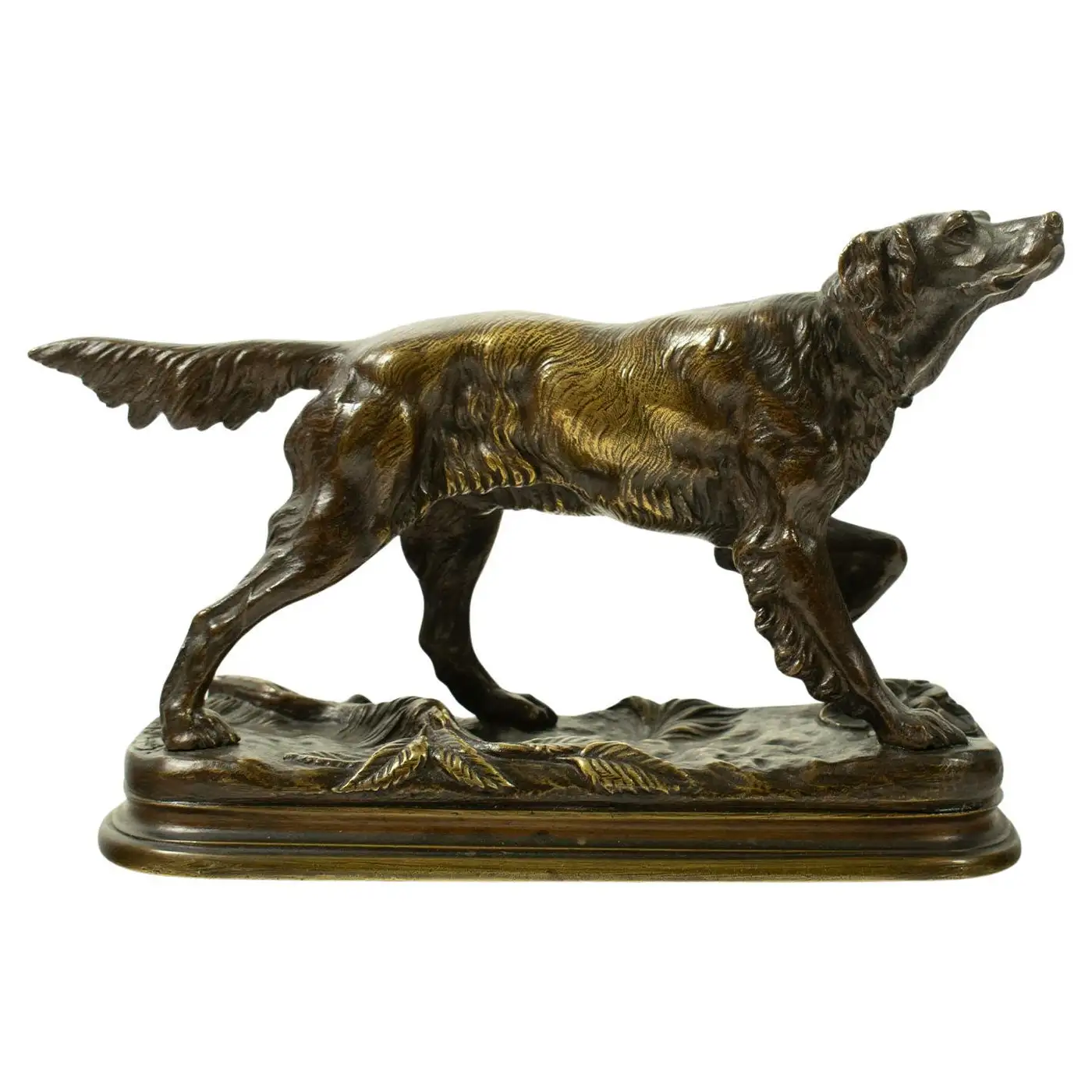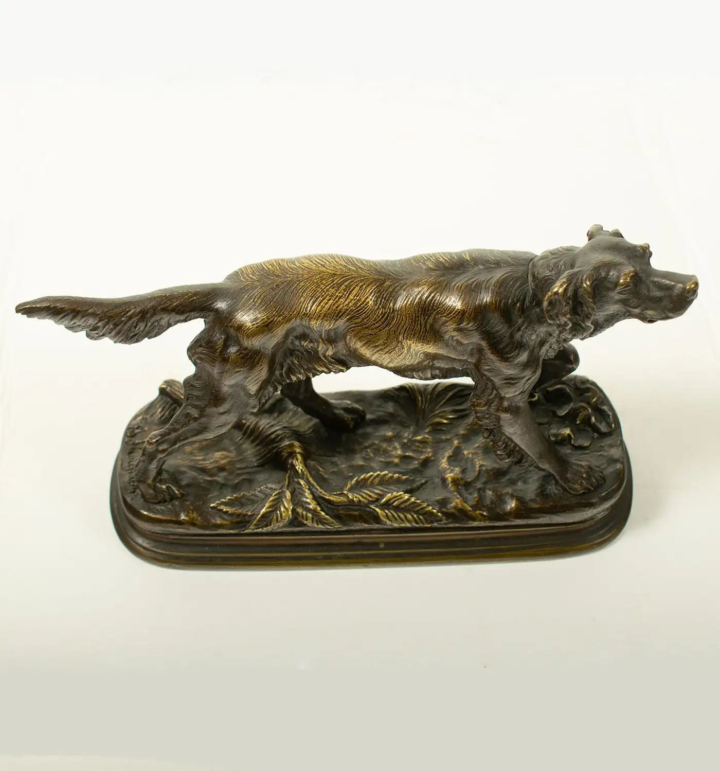 An old cast bronze Sculpture by Jules Moigniez (1835–1894) – Hunting Spaniel 19th Century: This bronze sculpture represents a stationary hunting dog (a spaniel) and is signed “J. Moigniez” on the base. This example illustrates Moigniez’s dedication to realism and his significant contribution to 19th-century animal sculpture. The spaniel’s natural stance, with careful attention to its muscular structure and posture, exemplifies Moigniez’s ability to convey lifelike energy in his works. His animal sculptures are celebrated for their realism and the emotional expression captured in the posture Jules Moigniez (1835–1894) was a French sculptor renowned for his detailed bronze sculptures of animals, particularly dogs in hunting poses and this piece exemplifies Moigniez’s skill in capturing the naturalistic details and expressions of animals.