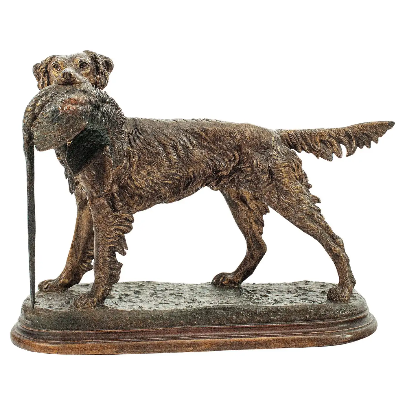 Large Statue in patinated spelter. Hunting dog holding a pheasant, signed Jules MOIGNIEZ (1835-1894). 31 cm high x 37 cm width. Jules Moigniez was a 19th-century French animal sculptor. His work was primarily cast in bronze, and he frequently exhibited his sculptures at the Paris Salon. His skill and versatility enabled him to produce quality bird subjects, horse sculptures (mainly racehorses), dog sculptures and hunting scenes.