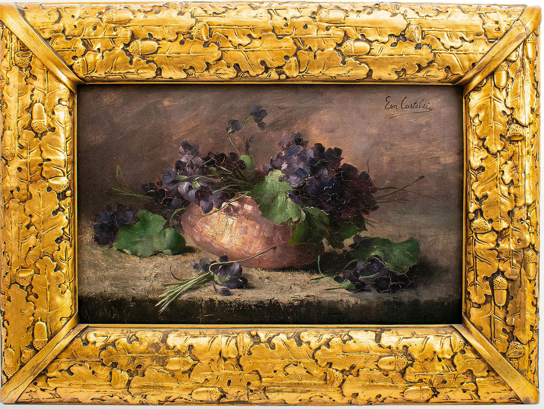 Ernest Castelein (1881-1945) – Nature morte avec un vase en cuivre et violettes.