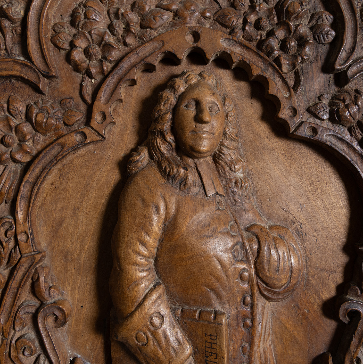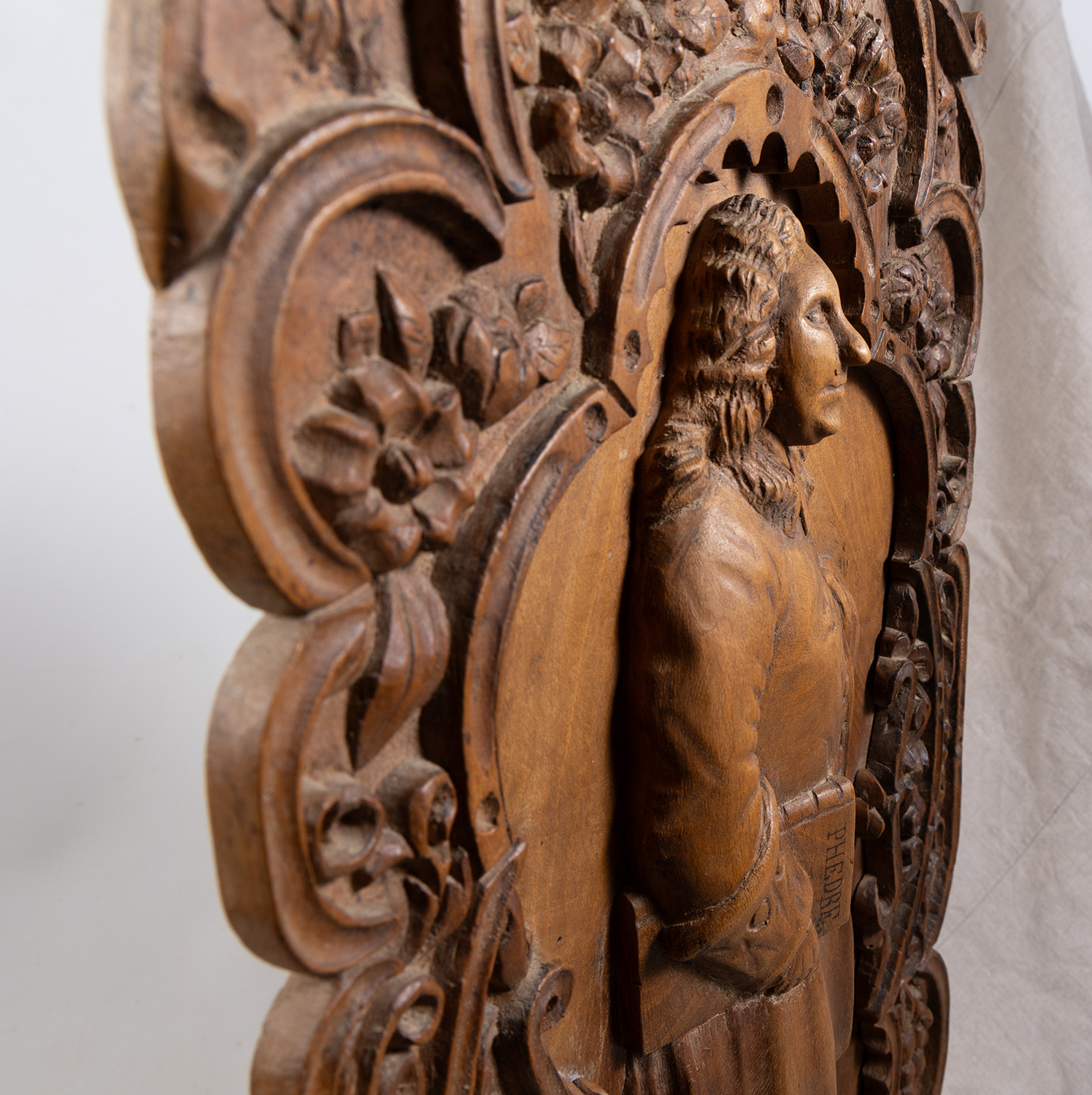 Exceptional French walnut relief panel depicting Jean Racine (1639–1699), signed and dated 1889 by J. Stephanière.