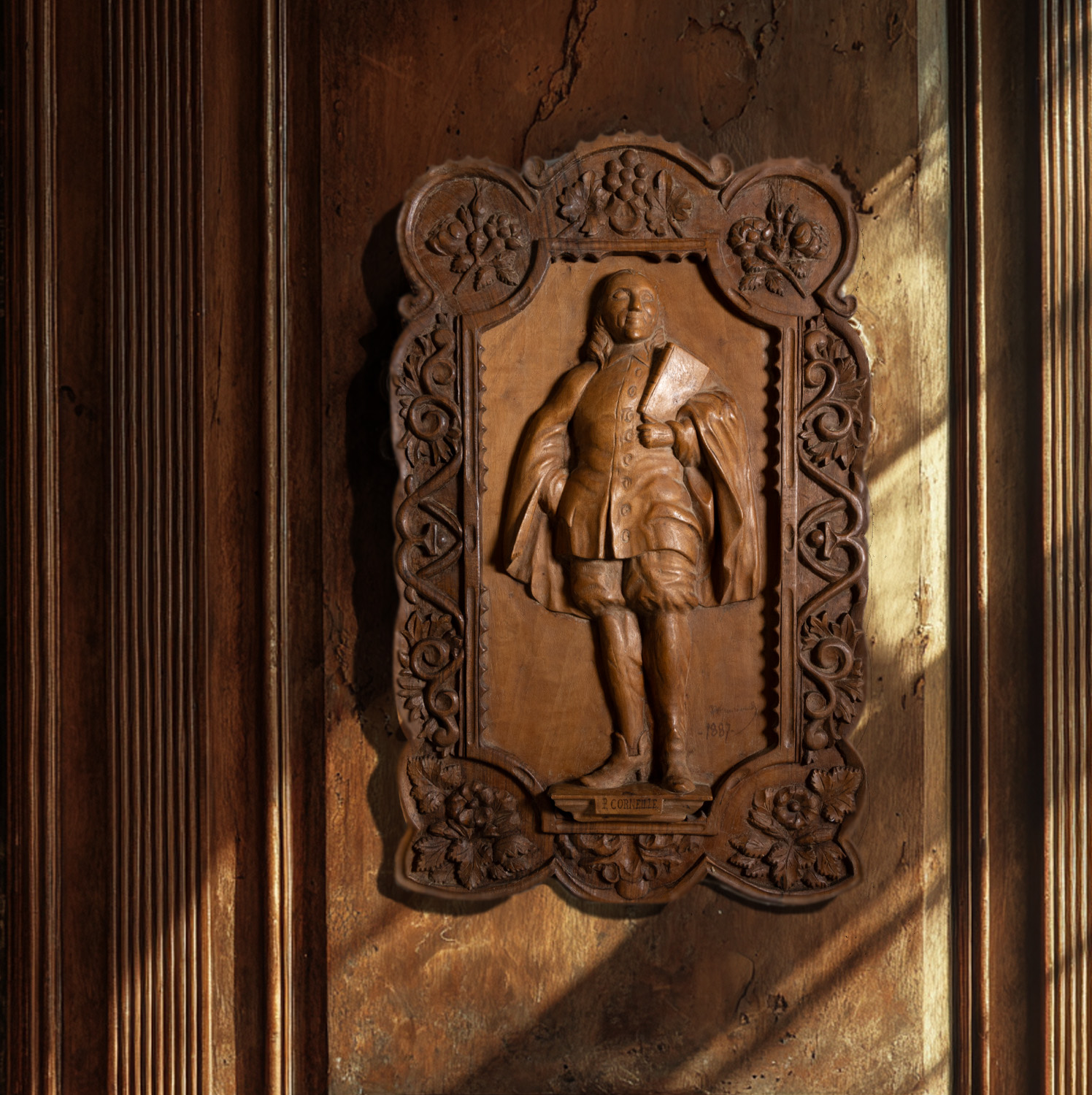 This beautifully hand-carved work shows the celebrated 17th-century playwright holding a manuscript of Phèdre, framed by deeply carved foliage, grapes, and flowers.