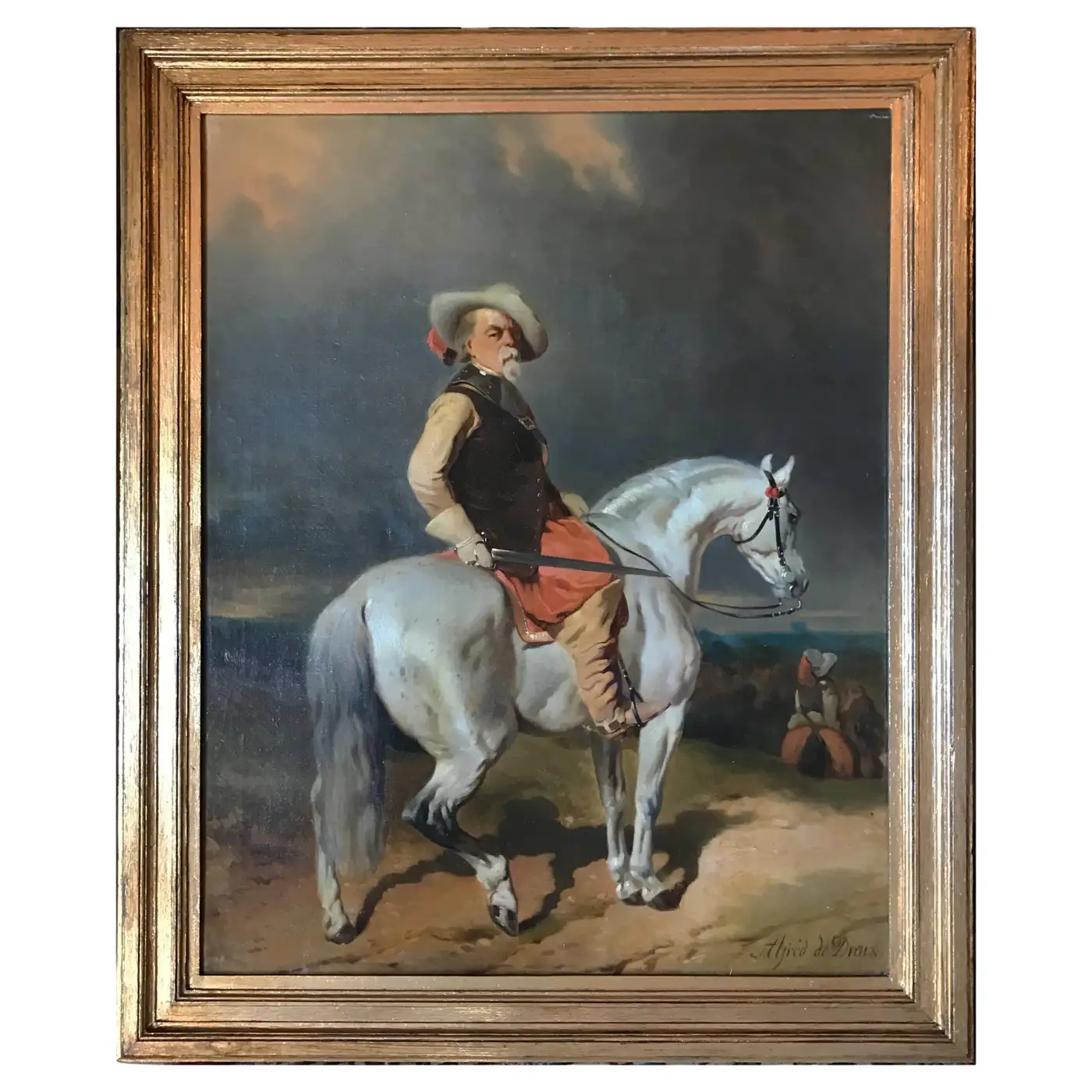 A beautiful 19th-century oil on canvas Capitaine des mousquetaires se retournant (Captain of the Musketeers Turning Back). This work is an almost identical copy of de Dreux’s original confirmed composition, and painted contemporaneously with the original, and of the same dimensions. It captures the powerful presence of the mounted musketeer, his grey horse, and the atmosphere of the original.