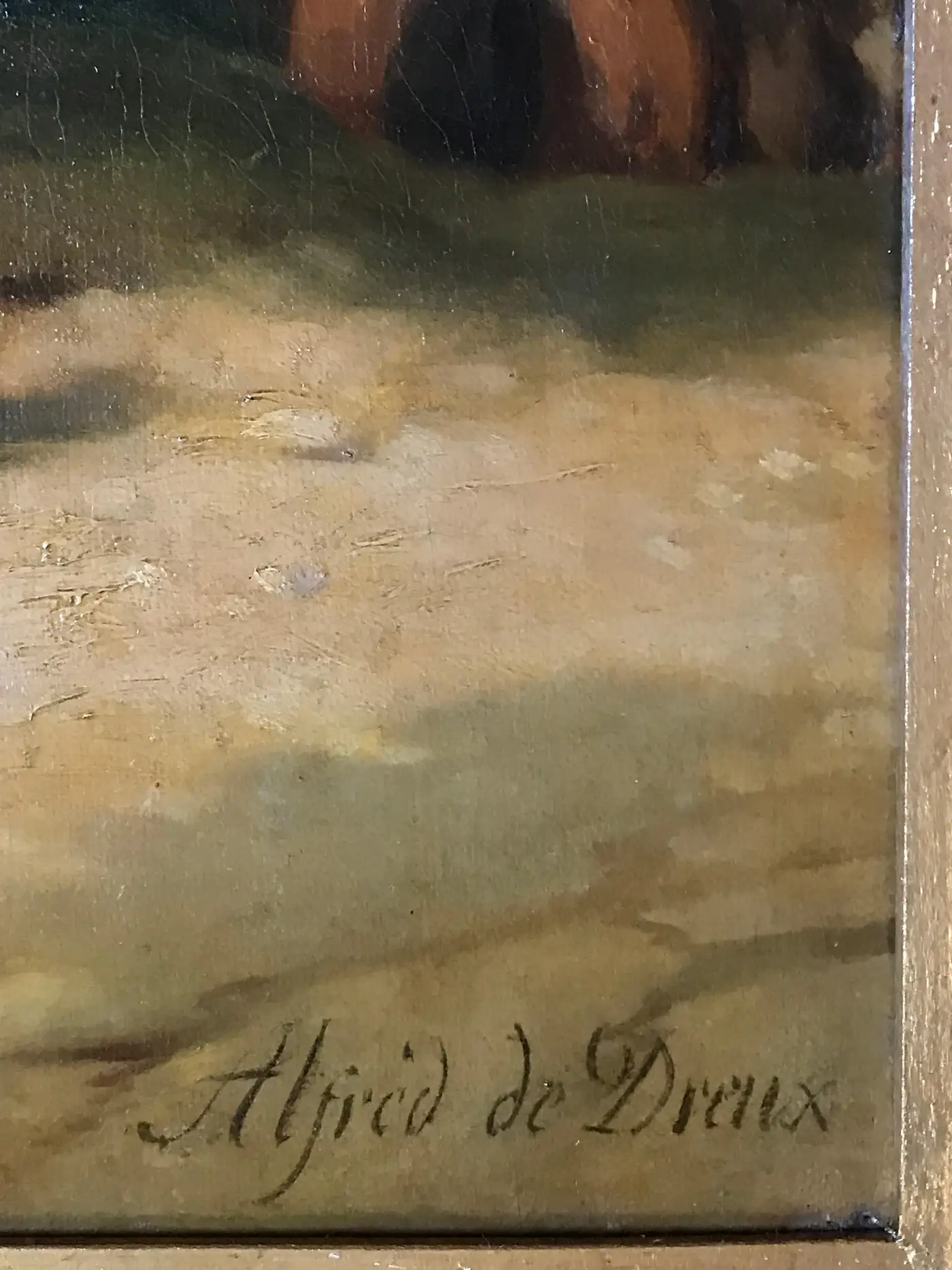 The painting is signed Alfred de Dreux lower right, however, the signature is apocryphal; the painting most likely not by de Dreux himself, but an artist or student in his circle or a follower of the same period. Such copies were highly sought after at the time, reflecting the immense popularity of de Dreux’s equestrian works.