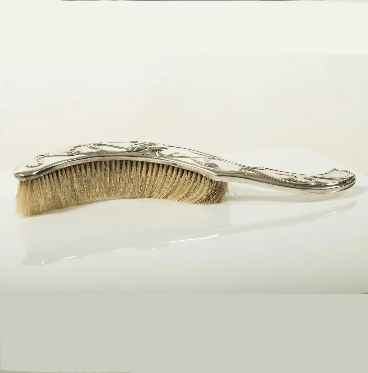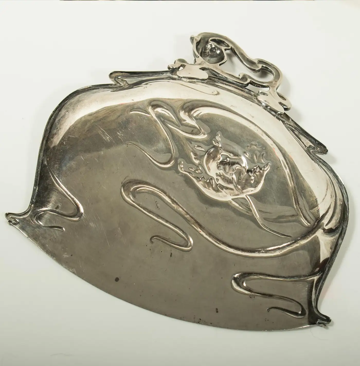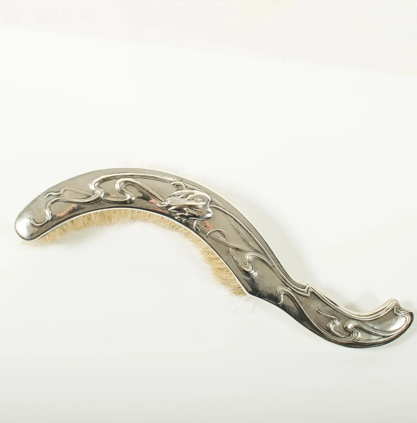 This beautiful Art Nouveau crumb brush and pan set, crafted in silver plate by Victor Saglier, is an elegant example of the period’s iconic design. Known for his contributions to the Art Nouveau movement, Saglier’s works are celebrated for their intricate, organic motifs, which often feature flowing lines and naturalistic elements. Saglier was a prominent French silversmith active in the late 19th and early 20th centuries, renowned for his craftsmanship in silverware and decorative objects. The set is in excellent condition, with approximately 95% of the original silver plating intact, showing only minor blemishes from age, which adds character to the piece. The brush is fitted with horse hair bristles, ideal for gently sweeping crumbs, while the pan is perfectly shaped to collect them. Both pieces are beautifully decorated with embossed tulips and flowing stems, capturing the essence of Art Nouveau’s love for nature and curvilinear design. The delicate, floral embossing on both the brush and pan is a testament to Saglier’s refined attention to detail. This set is a charming and functional example of Art Nouveau design, offering both aesthetic beauty and practicality. It would make a stunning addition to any collection of period silverware or as a unique decorative piece for a stylish home.