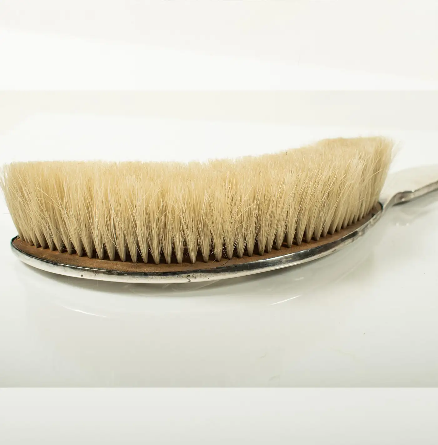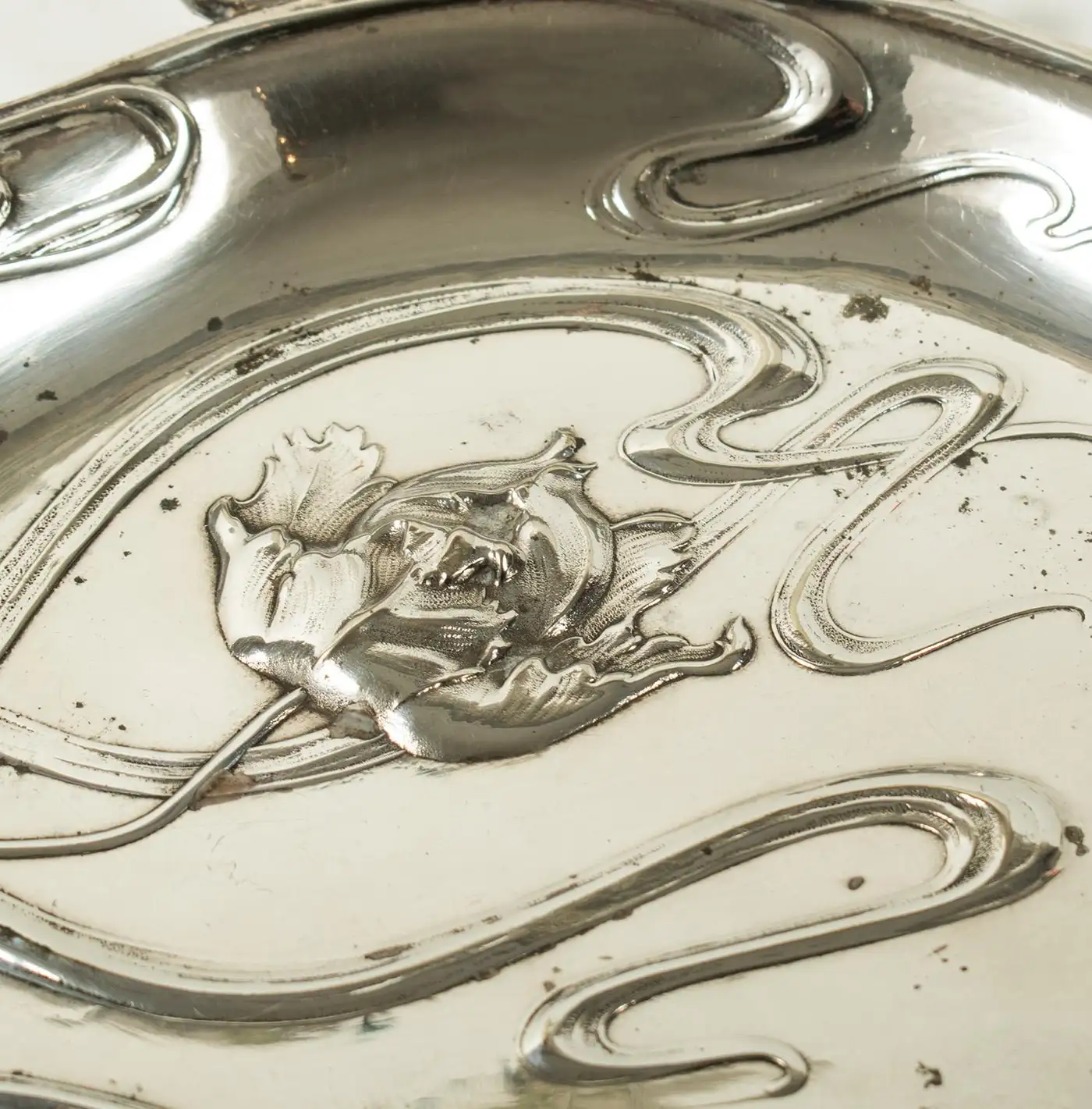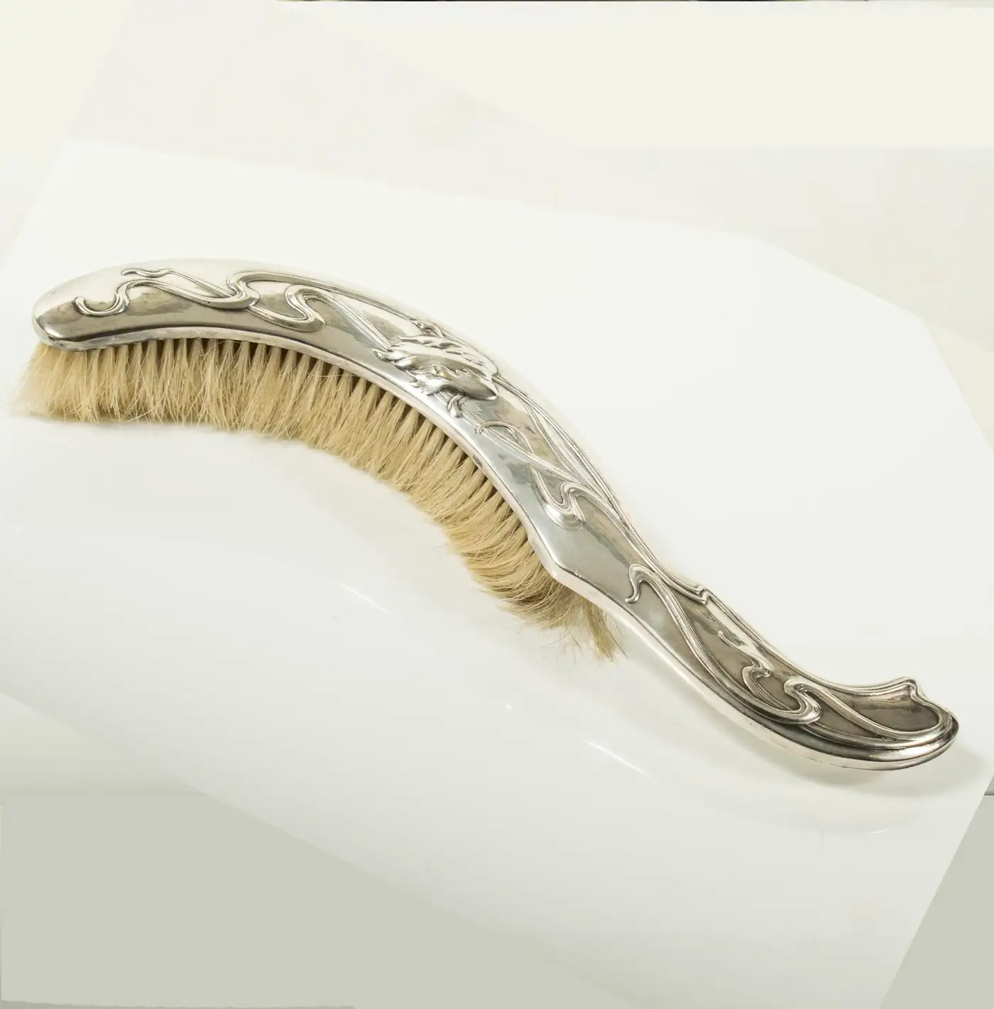 This beautiful Art Nouveau crumb brush and pan set, crafted in silver plate by Victor Saglier, is an elegant example of the period’s iconic design. Known for his contributions to the Art Nouveau movement, Saglier’s works are celebrated for their intricate, organic motifs, which often feature flowing lines and naturalistic elements. Saglier was a prominent French silversmith active in the late 19th and early 20th centuries, renowned for his craftsmanship in silverware and decorative objects. The set is in excellent condition, with approximately 95% of the original silver plating intact, showing only minor blemishes from age, which adds character to the piece. The brush is fitted with horse hair bristles, ideal for gently sweeping crumbs, while the pan is perfectly shaped to collect them. Both pieces are beautifully decorated with embossed tulips and flowing stems, capturing the essence of Art Nouveau’s love for nature and curvilinear design. The delicate, floral embossing on both the brush and pan is a testament to Saglier’s refined attention to detail. This set is a charming and functional example of Art Nouveau design, offering both aesthetic beauty and practicality. It would make a stunning addition to any collection of period silverware or as a unique decorative piece for a stylish home.