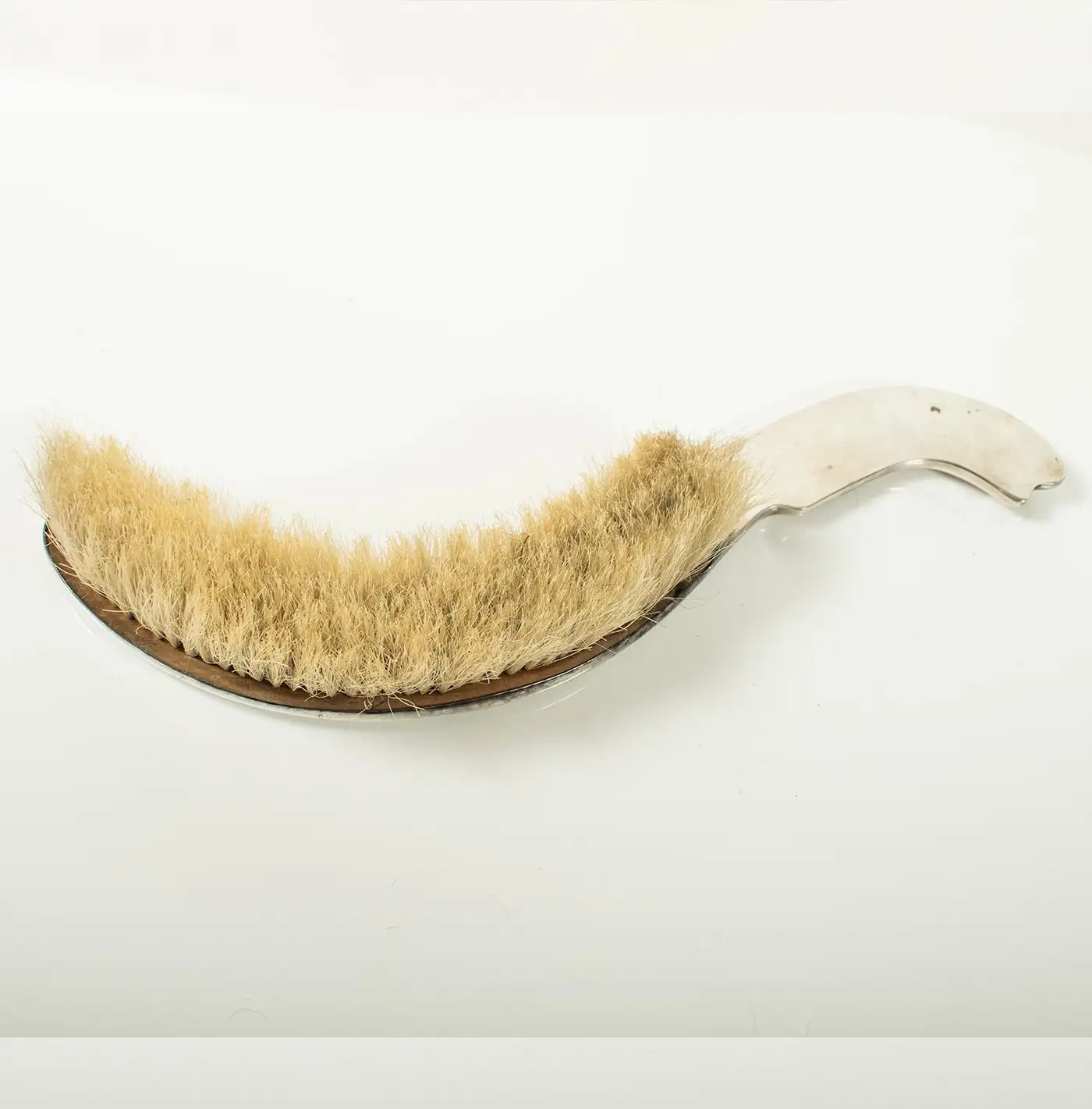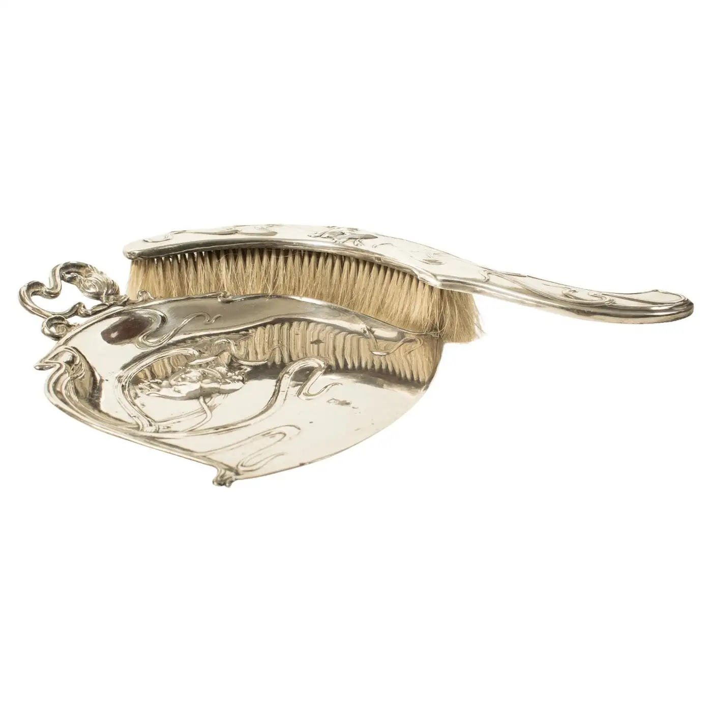 French Art Nouveau Silver-Plated Crumb Brush and Pan Set by Victor Saglier Brush length 34cm, pan width 22cm.