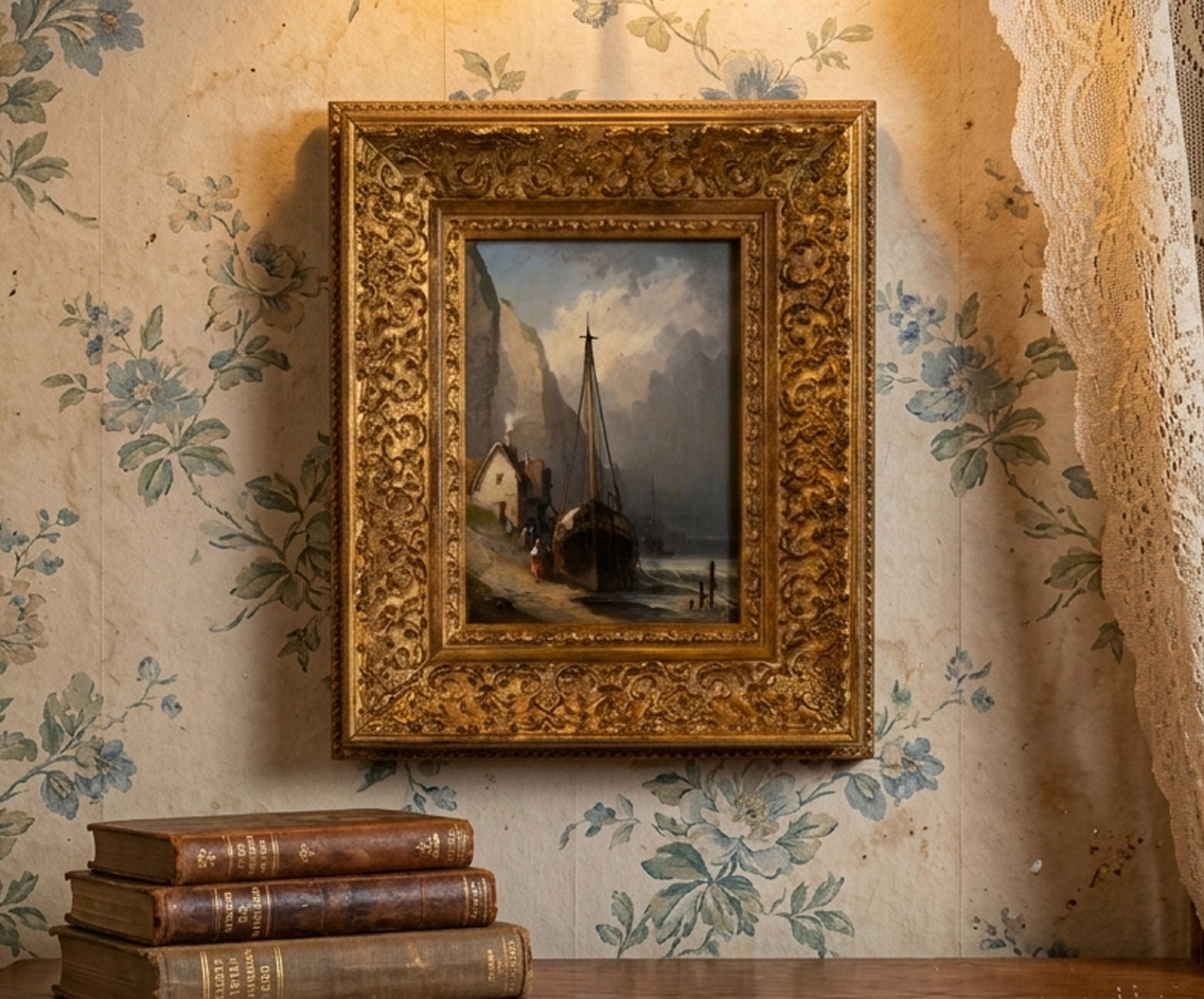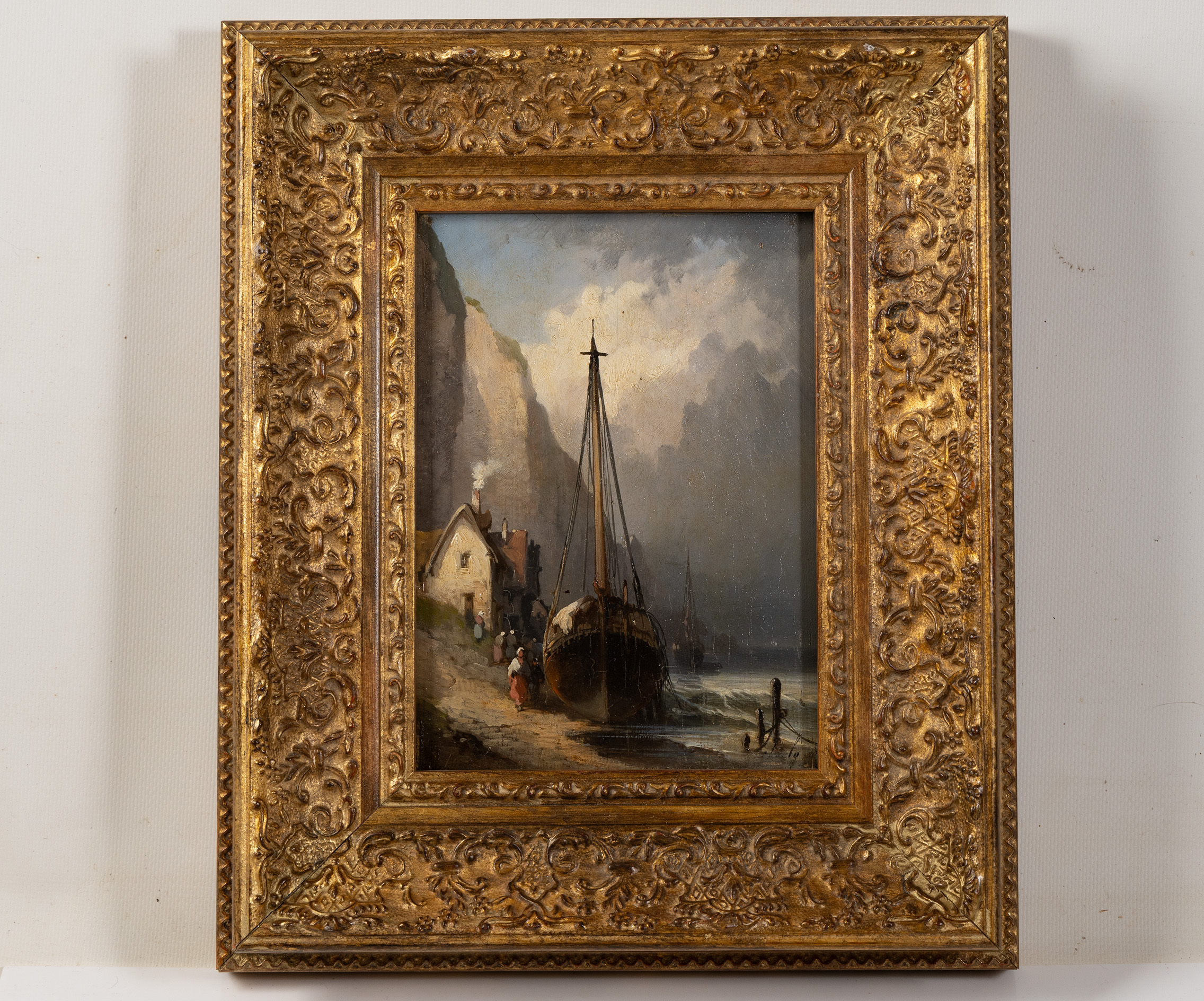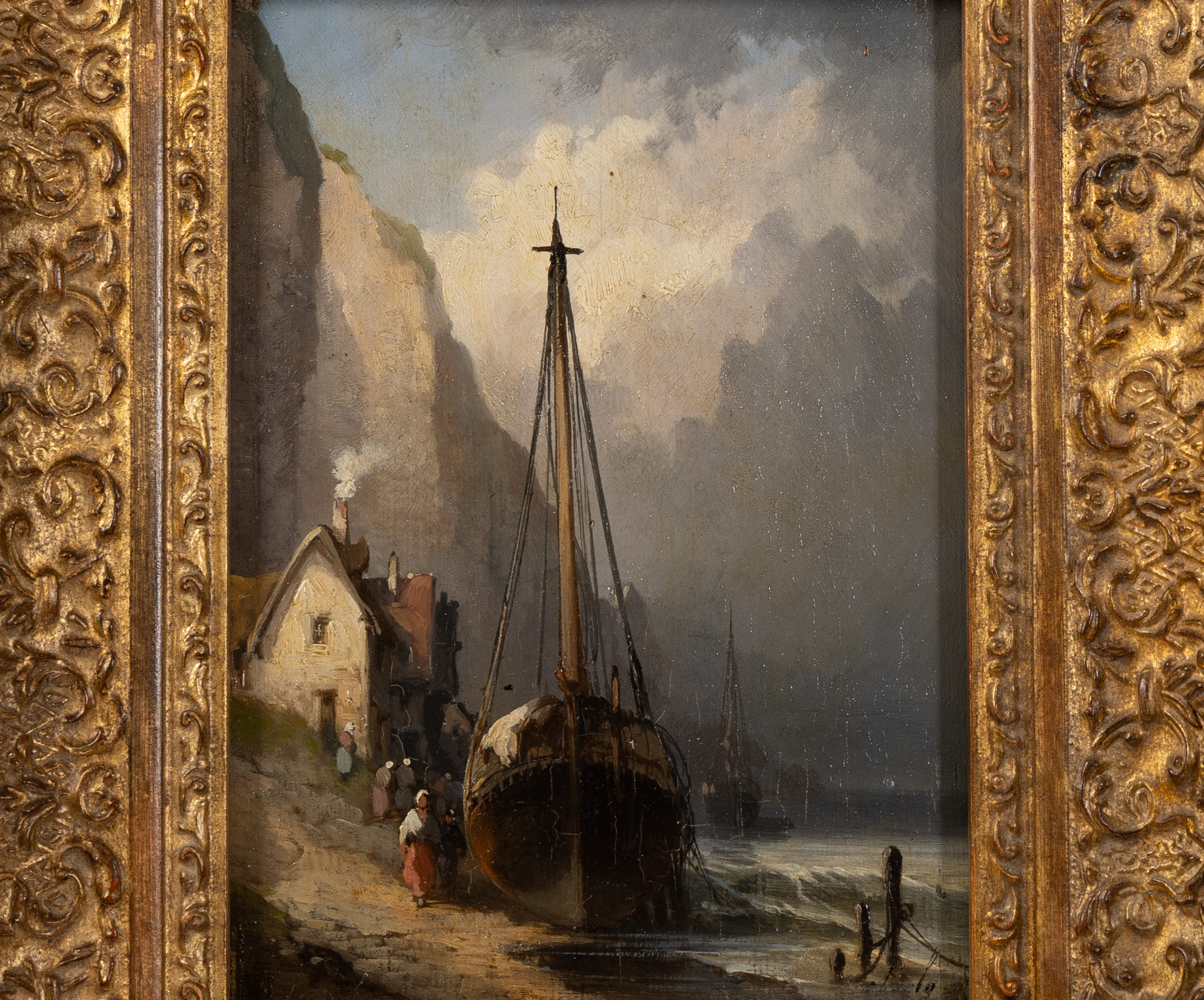 The piece is presented in a magnificent, hand-made Italian gilt frame, whose intricate scrollwork and gold-leaf finish perfectly complement the classical maritime aesthetic. With its petite size and grand presence, this painting offers a window into the romantic realism of 1800s Brittany or Normandy.