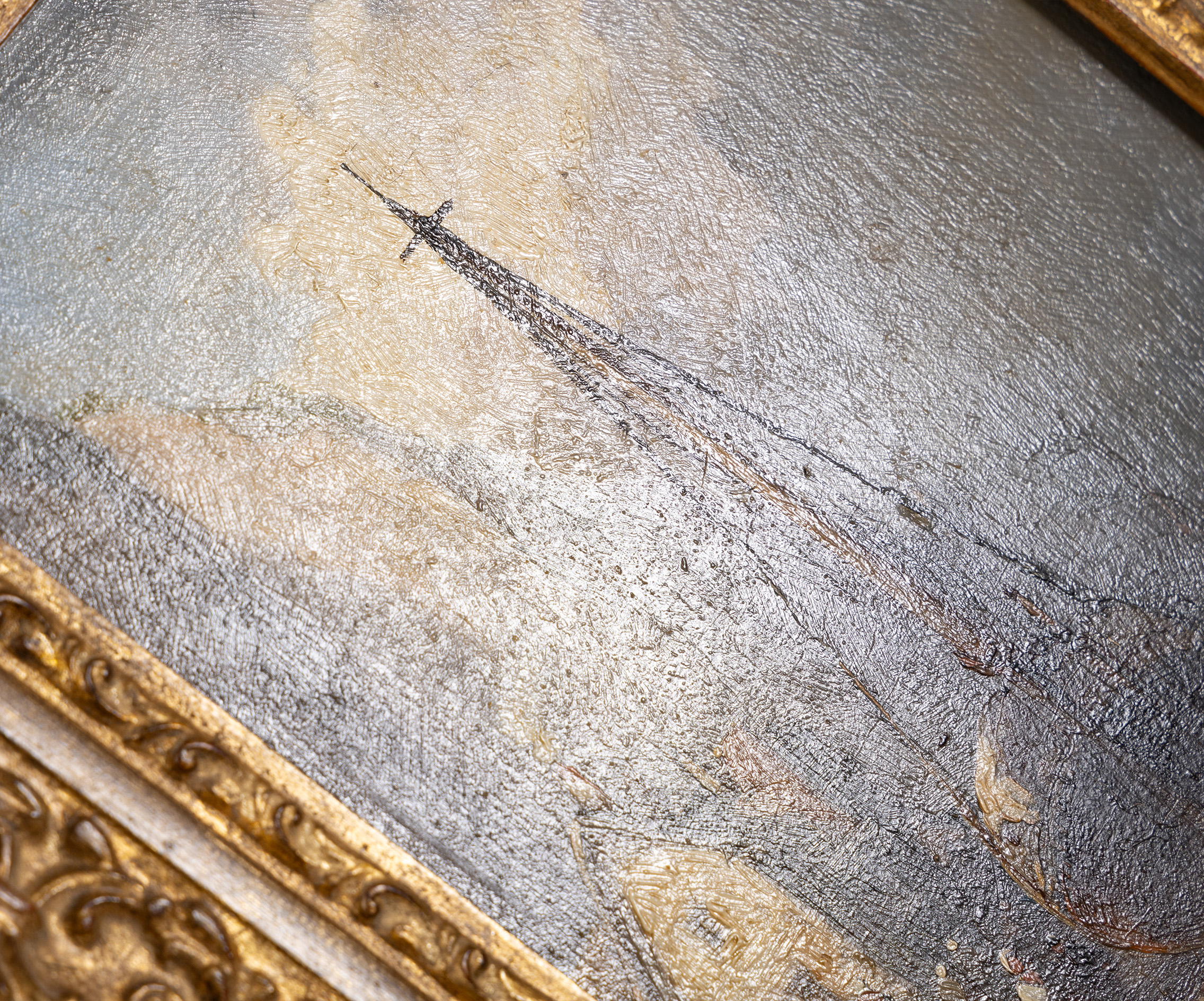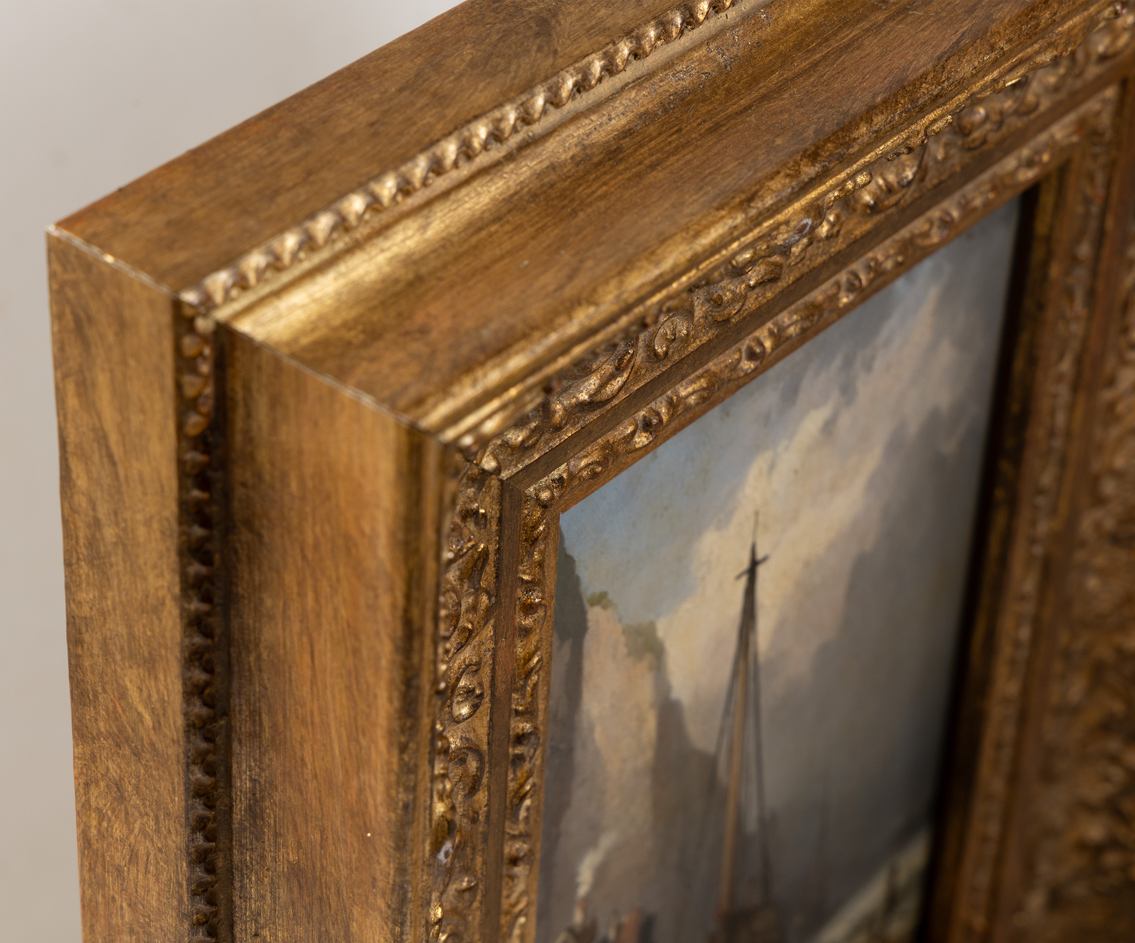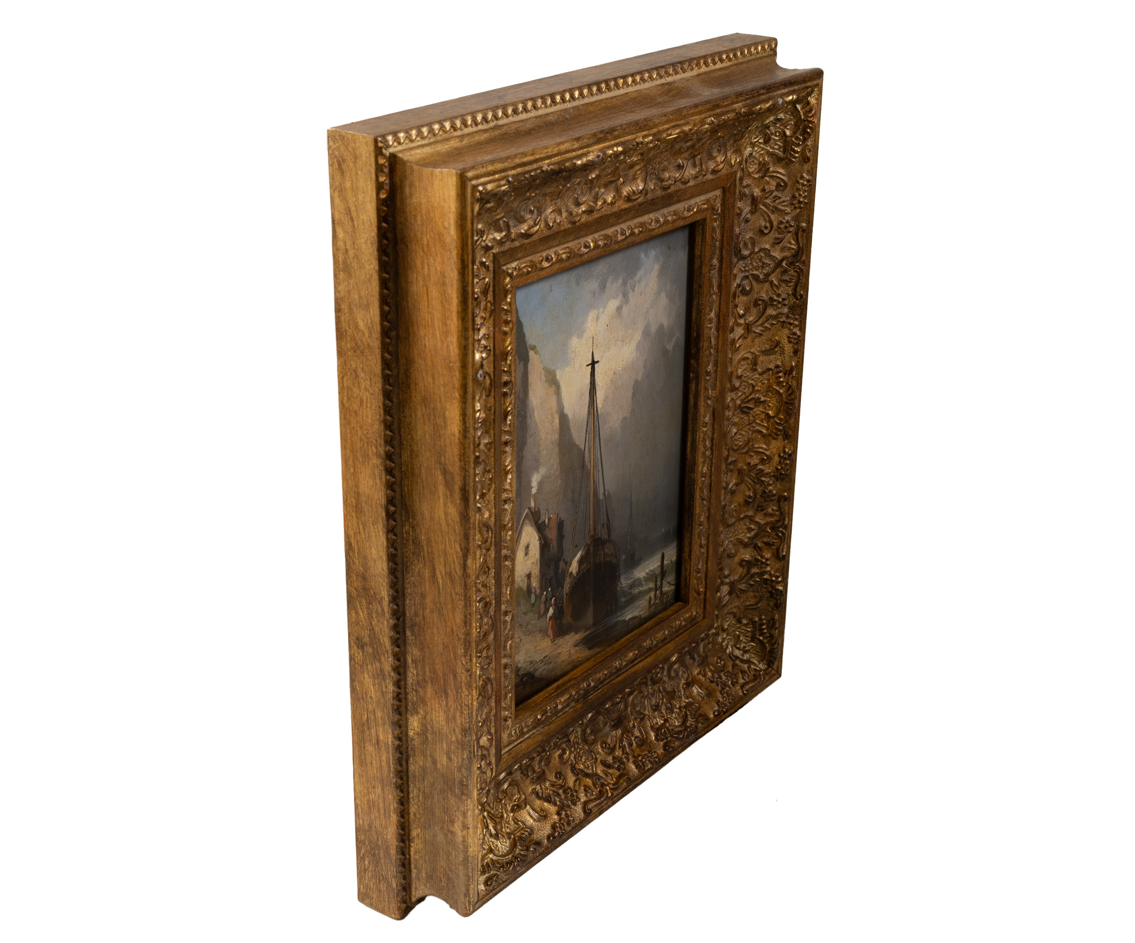 The piece is presented in a magnificent, hand-made Italian gilt frame, whose intricate scrollwork and gold-leaf finish perfectly complement the classical maritime aesthetic. With its petite size and grand presence, this painting offers a window into the romantic realism of 1800s Brittany or Normandy.
