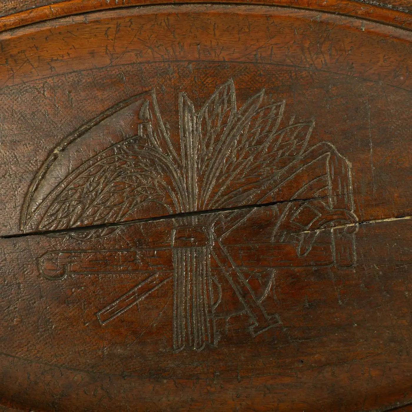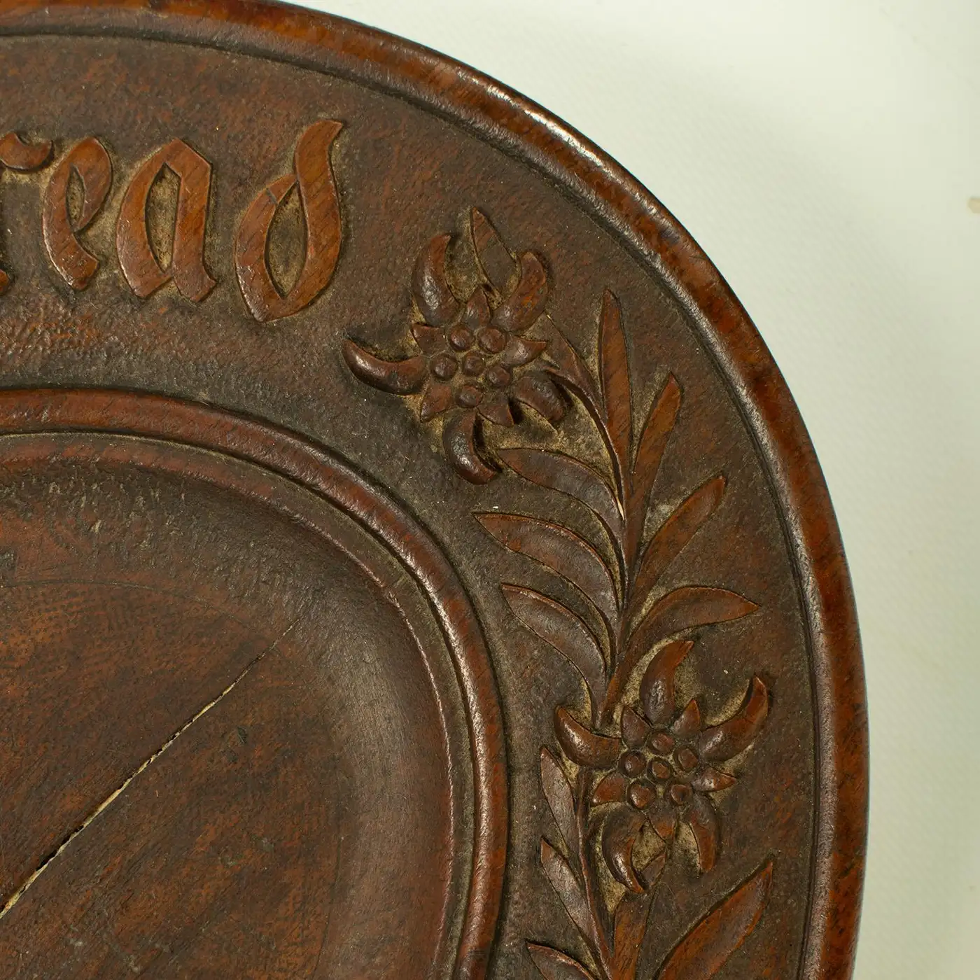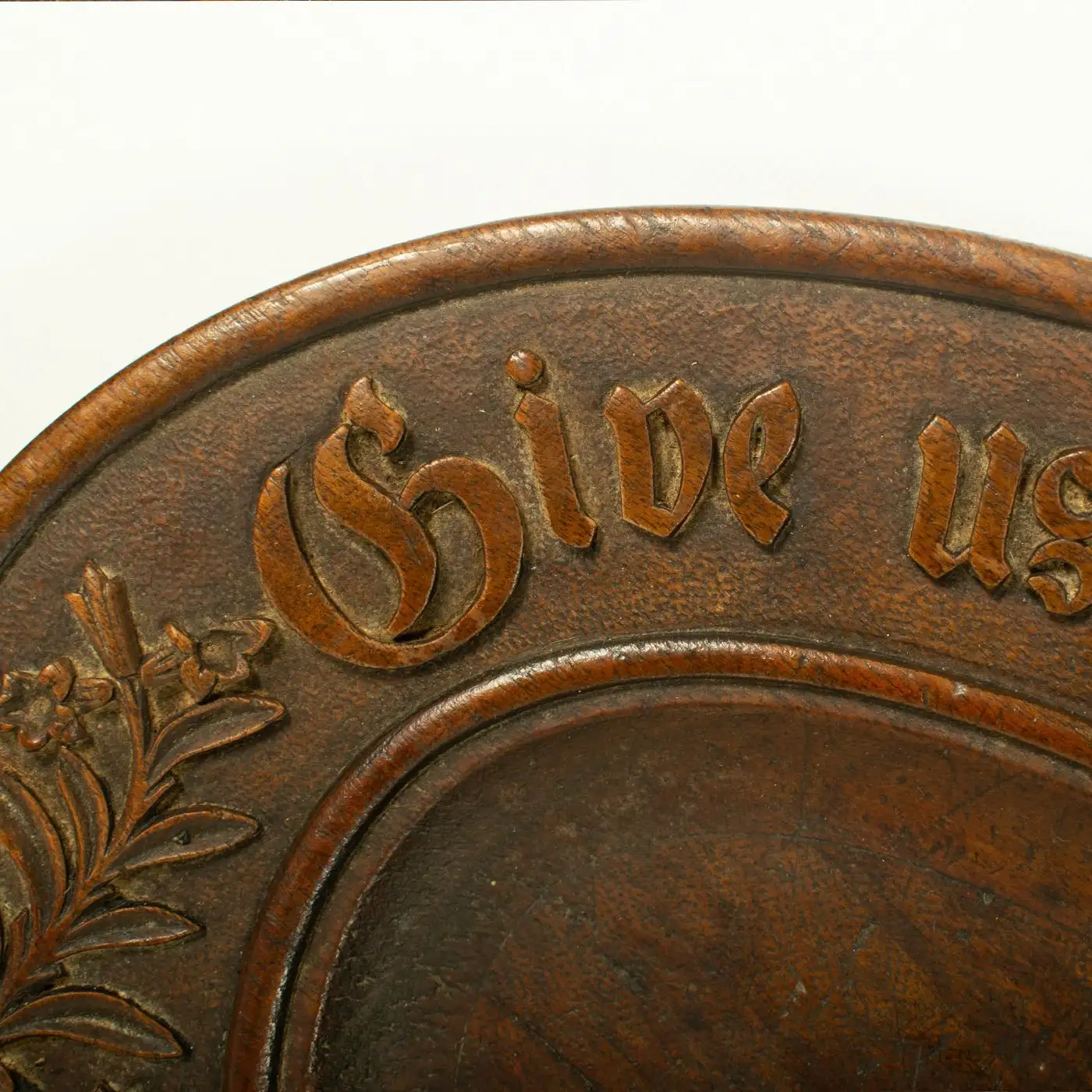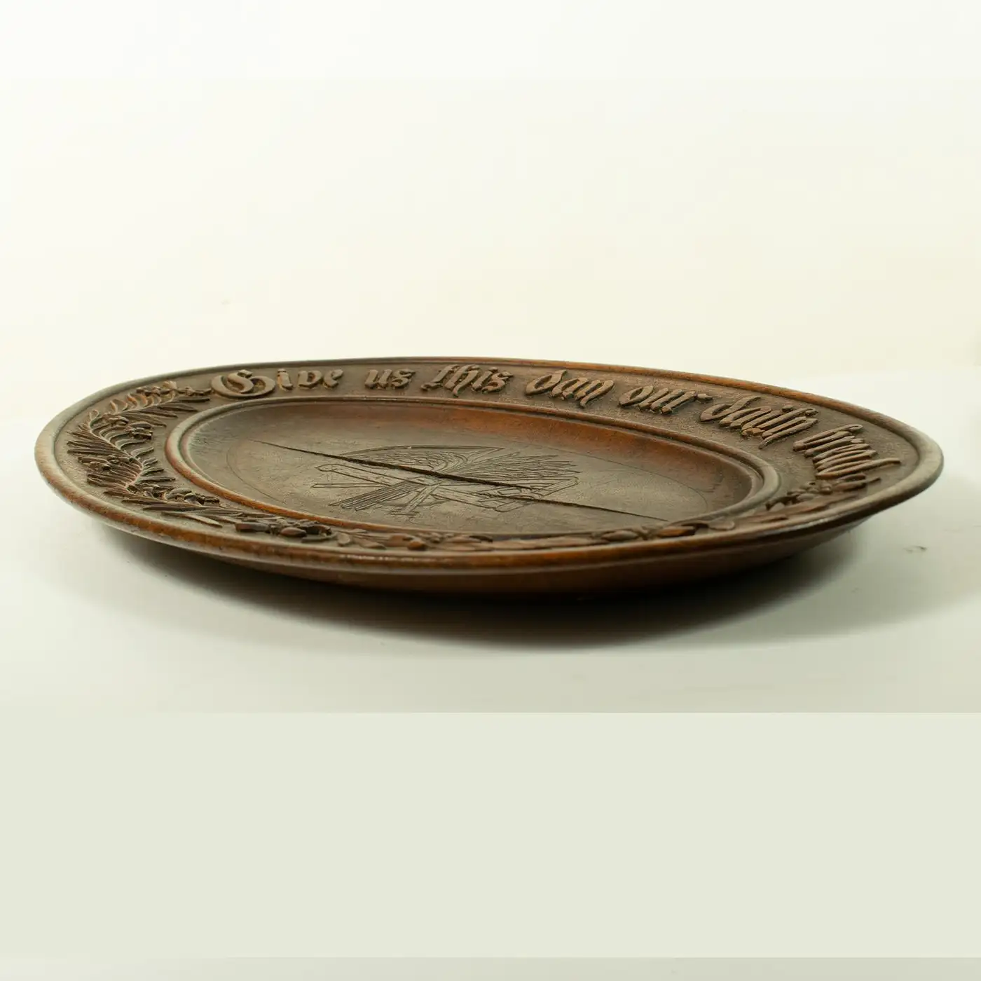 The wheat sheaf is a symbol of abundance and harvest, often used to evoke ideas of prosperity and sustenance. The phrase “Give us this day our daily bread” was likely carved to reflect religious or agricultural values, reminding those who used the platter of the importance of daily provisions. The carving of such motifs was common in handcrafted items, particularly in the 19th century, when artisans would carve platters or trays for both practical and decorative purposes.
