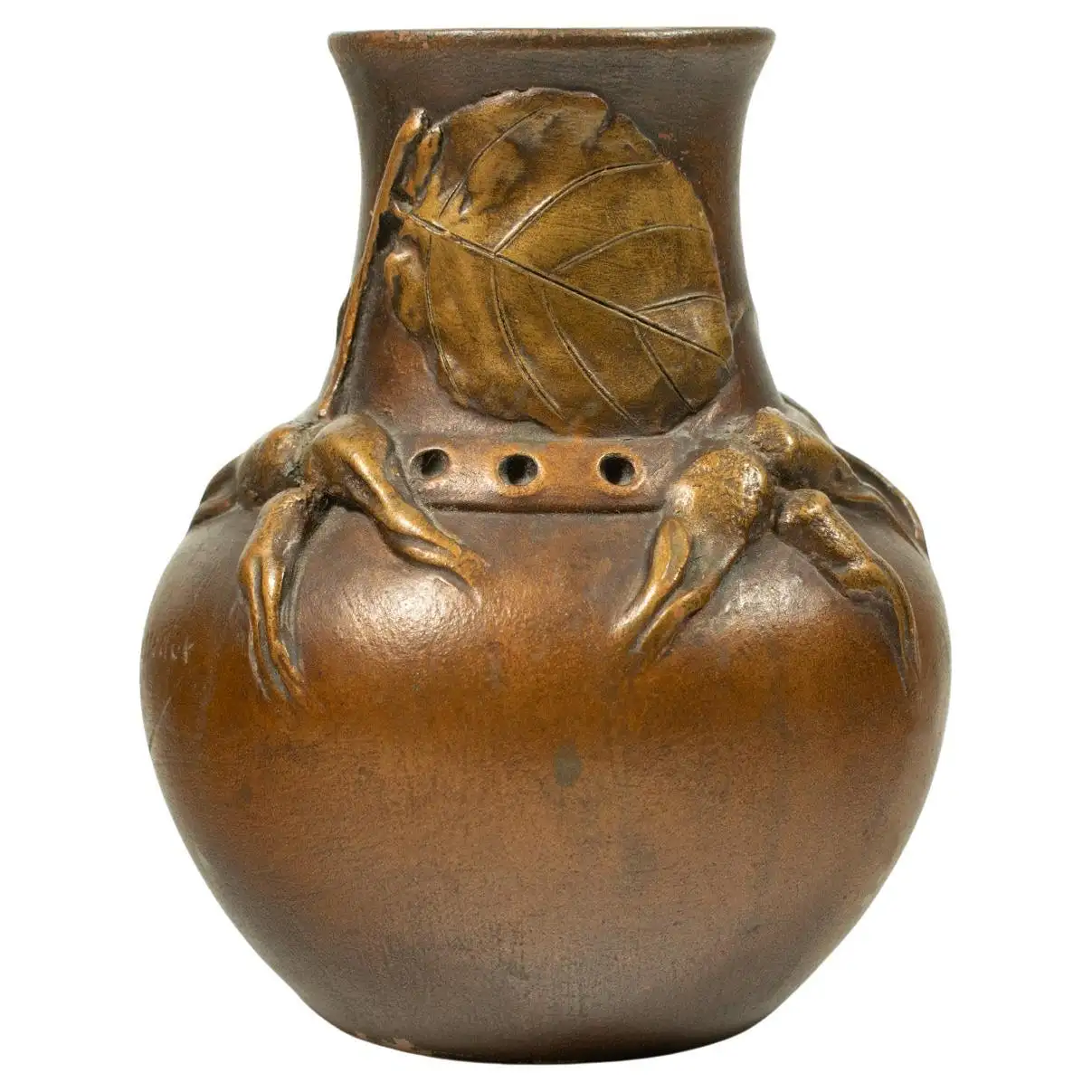 Henri-Laurent DESROUSSEAUX (1862-1906), L’Isle Adam: Art Nouveau vase in terracotta with an enamel finish, featuring a relief decoration of branches and hazel leaves with a bronze patina. Signed in the base.