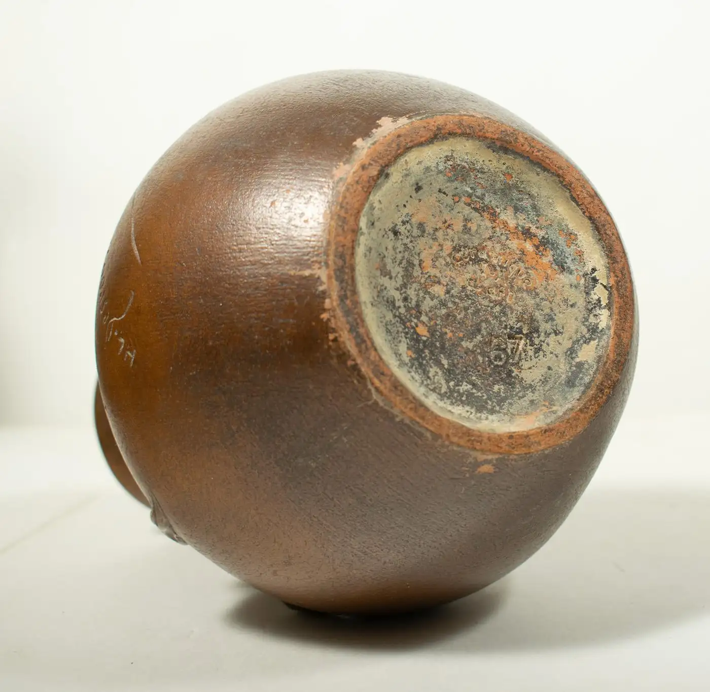Henri-Laurent Desrousseaux (1862-1906) was a French painter, ceramist, and illustrator. After meeting Camille Moreau Nélaton (1840-1897), a painter and ceramist, he decided to dedicate himself primarily to ceramics. He sometimes used the pseudonym Henri-Léon Charles Robalbhen to sign his works. Towards the end of his life, he settled in Valmondois, near L’Isle-Adam, in the Val d’Oise. This baluster-shaped vase, made of enameled ceramic, features a light relief decoration of branches and hazel leaves—finished with a bronze and gold patina, inspired by the Art Nouveau style. It is finely crafted and bears the mark of the L’Isle-Adam pottery factory beneath, dating it to around 1900. The terracotta factories of L’Isle-Adam developed their activity between 1890 and 1908. These Art Nouveau-inspired pieces—an influential movement at the turn of the century in the field of decorative arts, alongside some sculptures by Joseph Le Guluche (e.g., “Vase à la ronde de sirène et tritons,” between 1890 and 1908)—show the variety of works produced in the terracotta factories of L’Isle-Adam, which contributed to the town’s reputation and growth at the end of the 19th century and the beginning of the 20th century. The Louis-Senlecq Museum of Art and History holds a pair of floral-decorated vases, also made by Henri-Laurent Desrousseaux, in its collection.