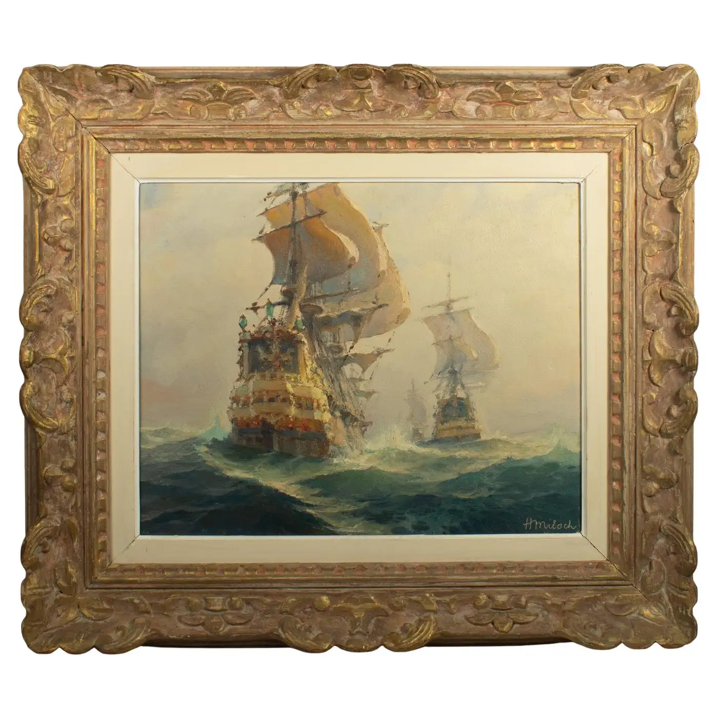 Henri Miloch was born in Trieste, Italy, in 1898. He studied at the École des Beaux-Arts in Paris and became a member of the Société des artistes français. Miloch’s life and artistic activities were primarily anchored in Brittany, a region in northwestern France, where he captured the essence of Breton maritime life through his paintings of various local ports and towns. Much of his work focused on the Concarneau region, where he lived and exhibited extensively throughout his career. In 1959, he expanded his creative space by opening a studio in Tours (Loire Valley).