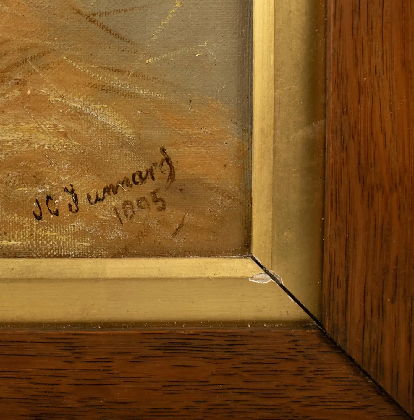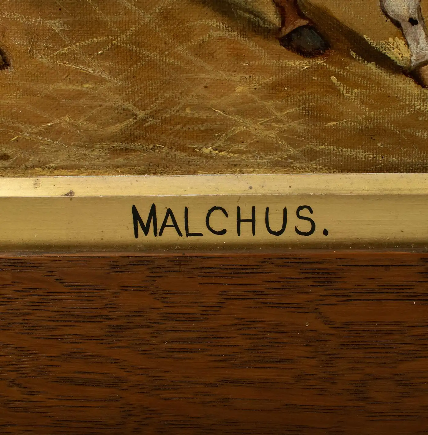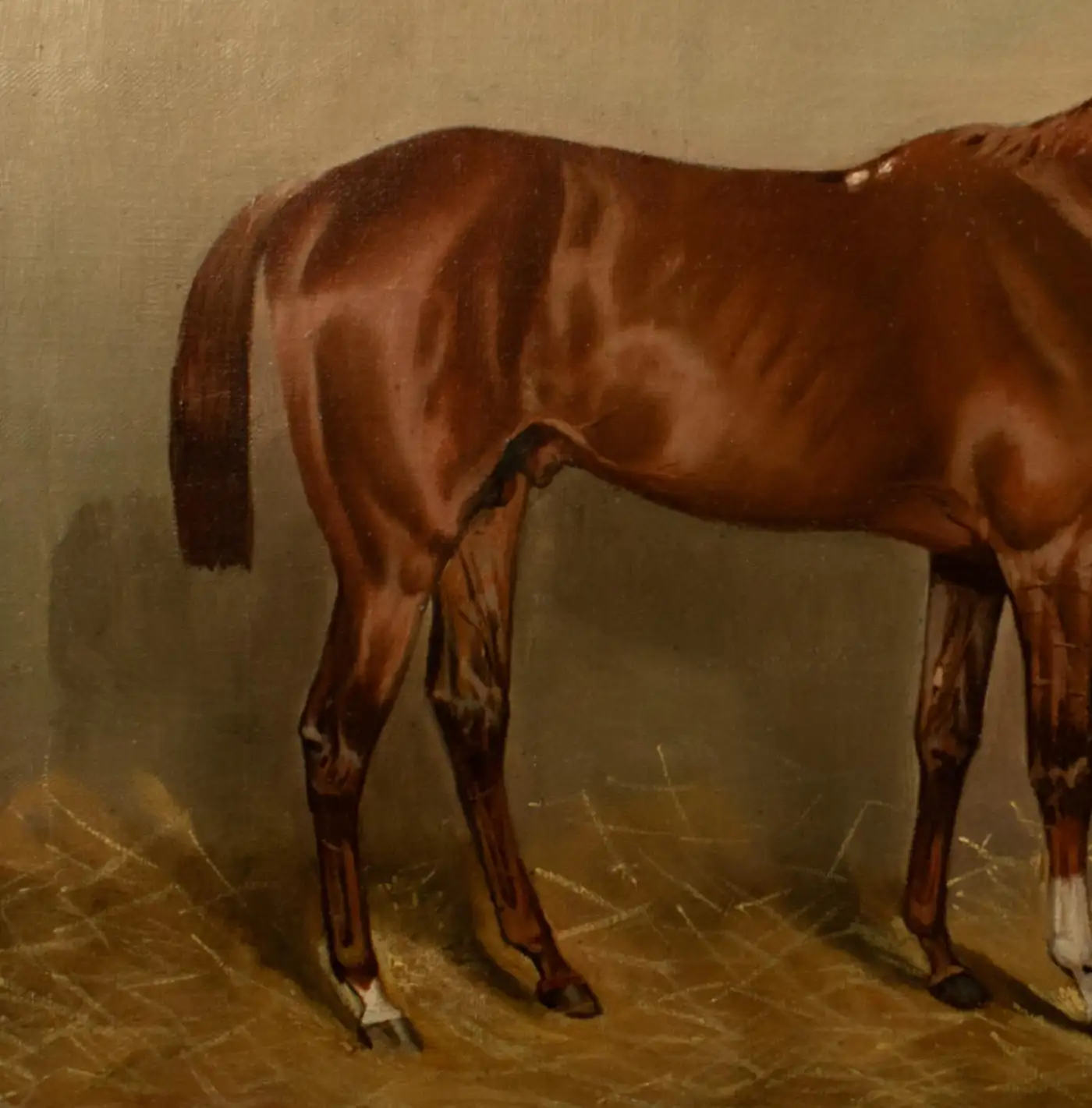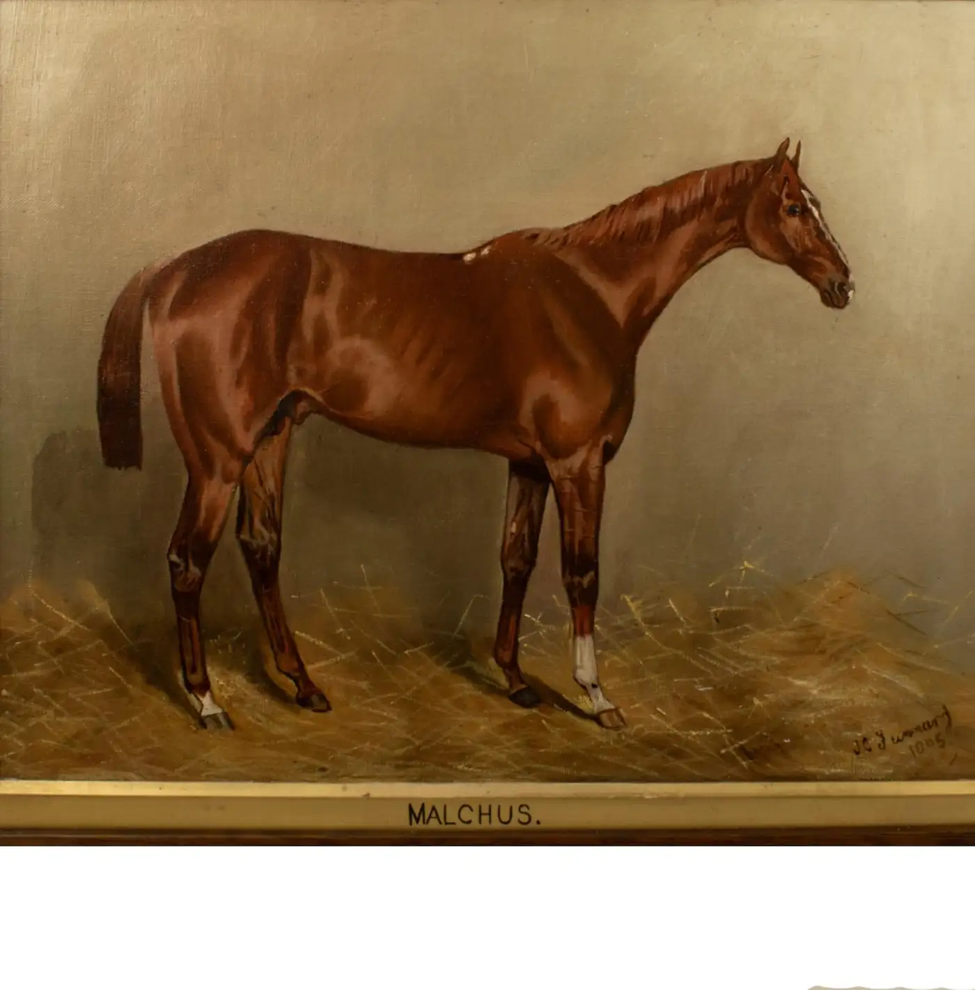 John Charles Tunnard (British, 1873–1960) Portrait of the Chestnut Thoroughbred Stallion and Racehorse “Malchus” in Stable Oil on canvas, signed and dated 1895 Canvas dimensions unframed: 34 cm × 44 cm A finely detailed equestrian portrait by British artist John Charles Tunnard, depicting the chestnut thoroughbred stallion and racehorse Malchus standing in a stable. Tunnard’s skilled brushwork captures the stallion’s powerful musculature, glossy chestnut coat, and distinctive white markings, all set against a soft, neutral background that keeps the viewer’s attention firmly on the horse. Painted in 1895, this work reflects precision, anatomical accuracy and quiet dignity typical of the artist’s style and also seen in the sporting art of other artists of the period such as Lucas Lucas, an artist known for similar portraits of racehorses and hunting scenes. About the Artist: John Charles Tunnard (1873–1960) was a British painter specialising in equestrian, hunting, and animal subjects. Based in Bedfordshire, he produced commissions for prominent families, and his portraits were valued for their lifelike representation and understanding of equine form. His work often appeared in country-house collections, and he is recognised as the father of the celebrated British modernist painter John Tunnard (1900–1971). Examples of his paintings are held in private collections and occasionally appear at auction, where his racehorse portraits are particularly sought after. Signed lower right and dated 1895. Presented in a period oak frame with gilt slip, inscribed with the horse’s name. This painting is a superb example of late-19th-century British sporting art and will appeal to collectors of equestrian portraiture and admirers of fine thoroughbreds.