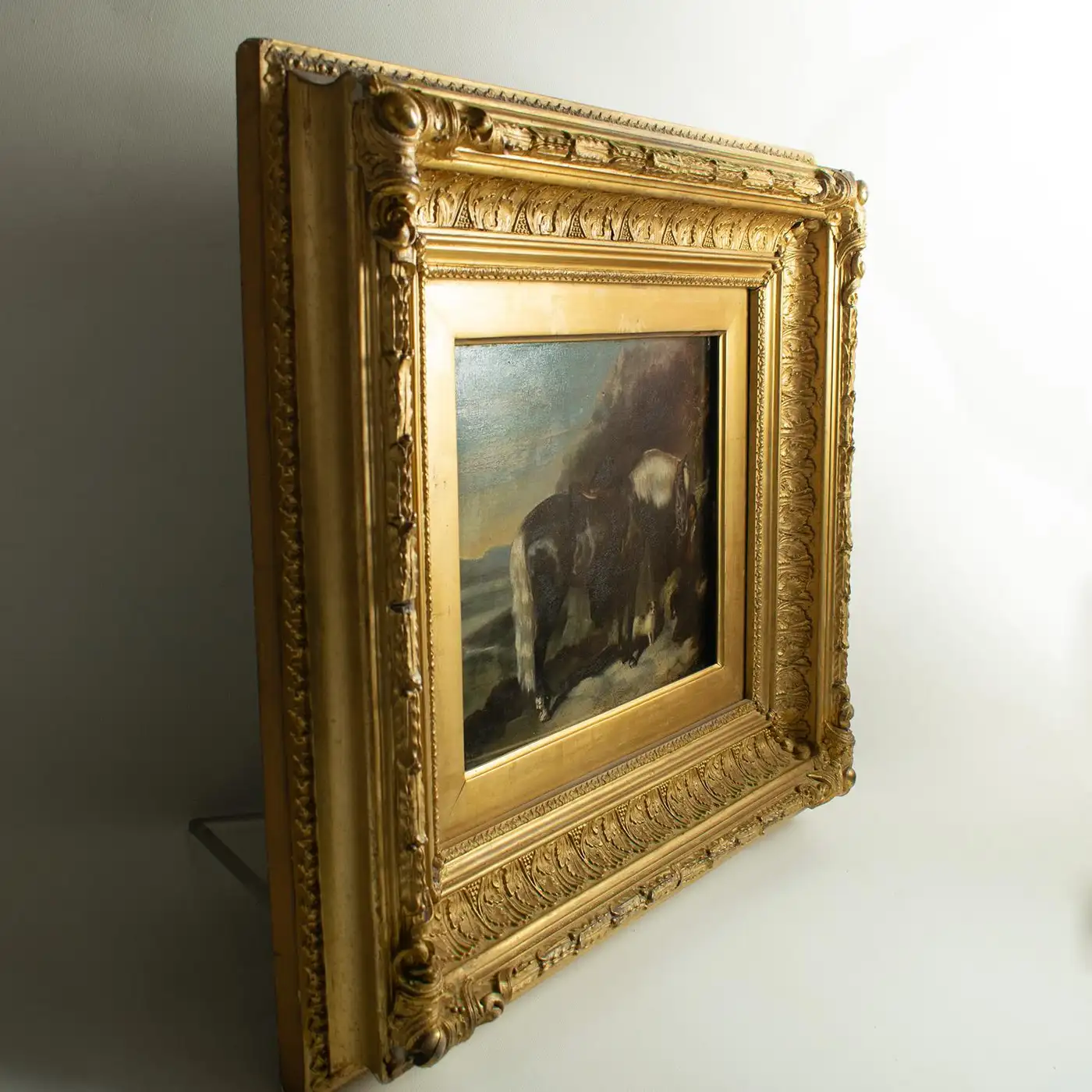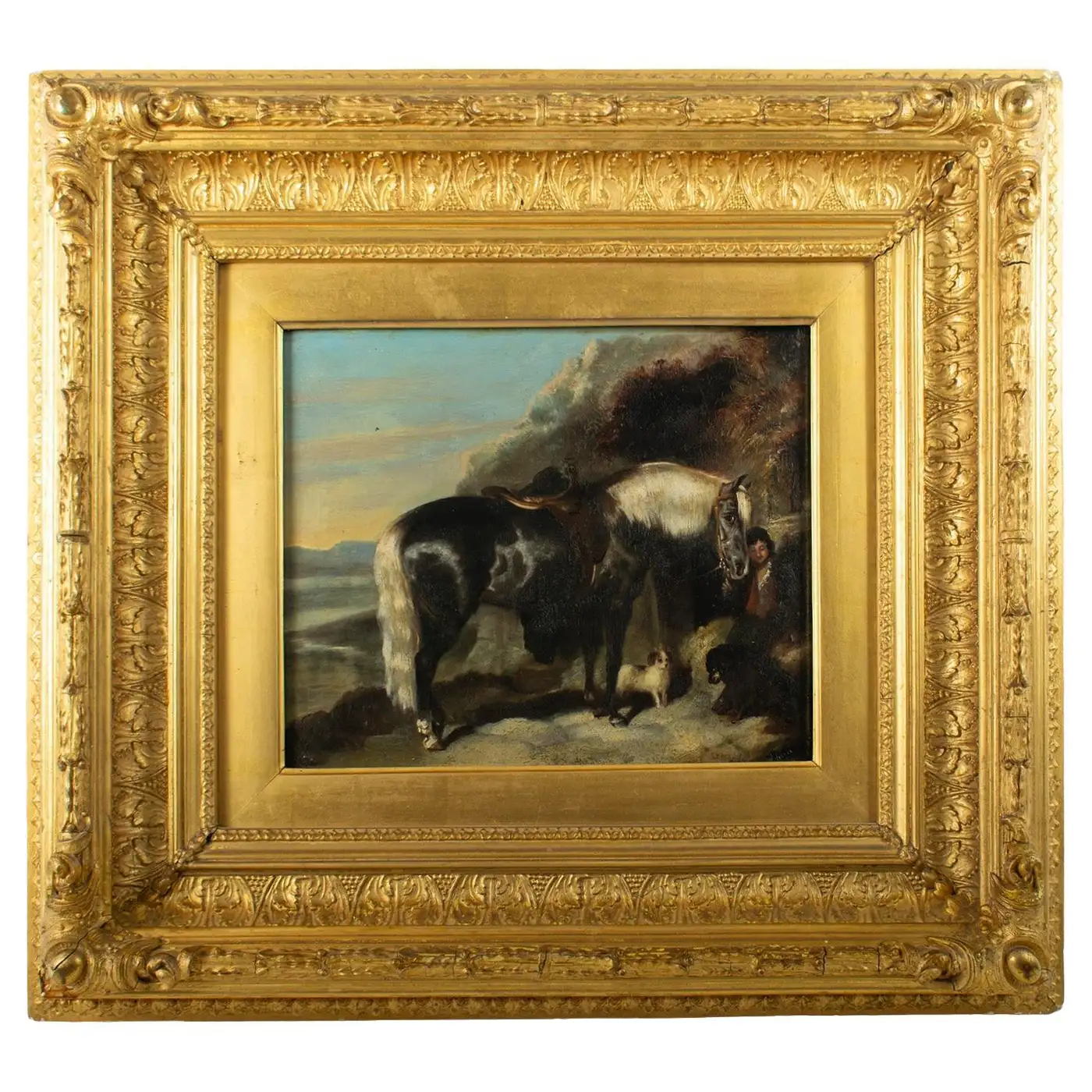 Framed 55 x 49cm. John Frederick Herring Jr. (1820–1907) was an English painter known for his equestrian and sporting scenes, much like his father, John Frederick Herring Sr. Herring Jr. followed in his father’s footsteps and became a successful artist in his own right. Born in Doncaster, England, in 1820, John Frederick Herring Jr. was the son of the renowned artist John Frederick Herring Sr. He was brought up in a family with a strong artistic tradition, and from an early age, he showed talent and interest in painting. Herring Jr. received artistic training from his father, who was a prominent painter of equestrian and animal subjects. He adopted a similar style to his father, specialising in sporting and hunting scenes, as well as landscapes with horses and other animals. His works often depicted lively action and detailed depictions of horses and their riders. Like his father, Herring Jr. achieved considerable success as an artist during his lifetime. He exhibited his works at prestigious venues such as the Royal Academy in London and the British Institution. His paintings were well-received by both critics and patrons, and he garnered a reputation for his skilful portrayal of horses and sporting scenes. Herring Jr. sometimes signed his works as J. F. Herring Jr. or J. F. Herring Fraser. The addition of “Fraser” to his signature is believed to have been a reference to his mother’s maiden name. John Frederick Herring Jr.’s works continue to be admired by art enthusiasts and collectors today. His paintings are sought after for their vibrant compositions, technical proficiency, and depiction of equestrian and sporting subjects. John Frederick Herring Jr. made a significant contribution to the tradition of British sporting art, following in the footsteps of his father while also establishing his own distinctive style and reputation as an artist.