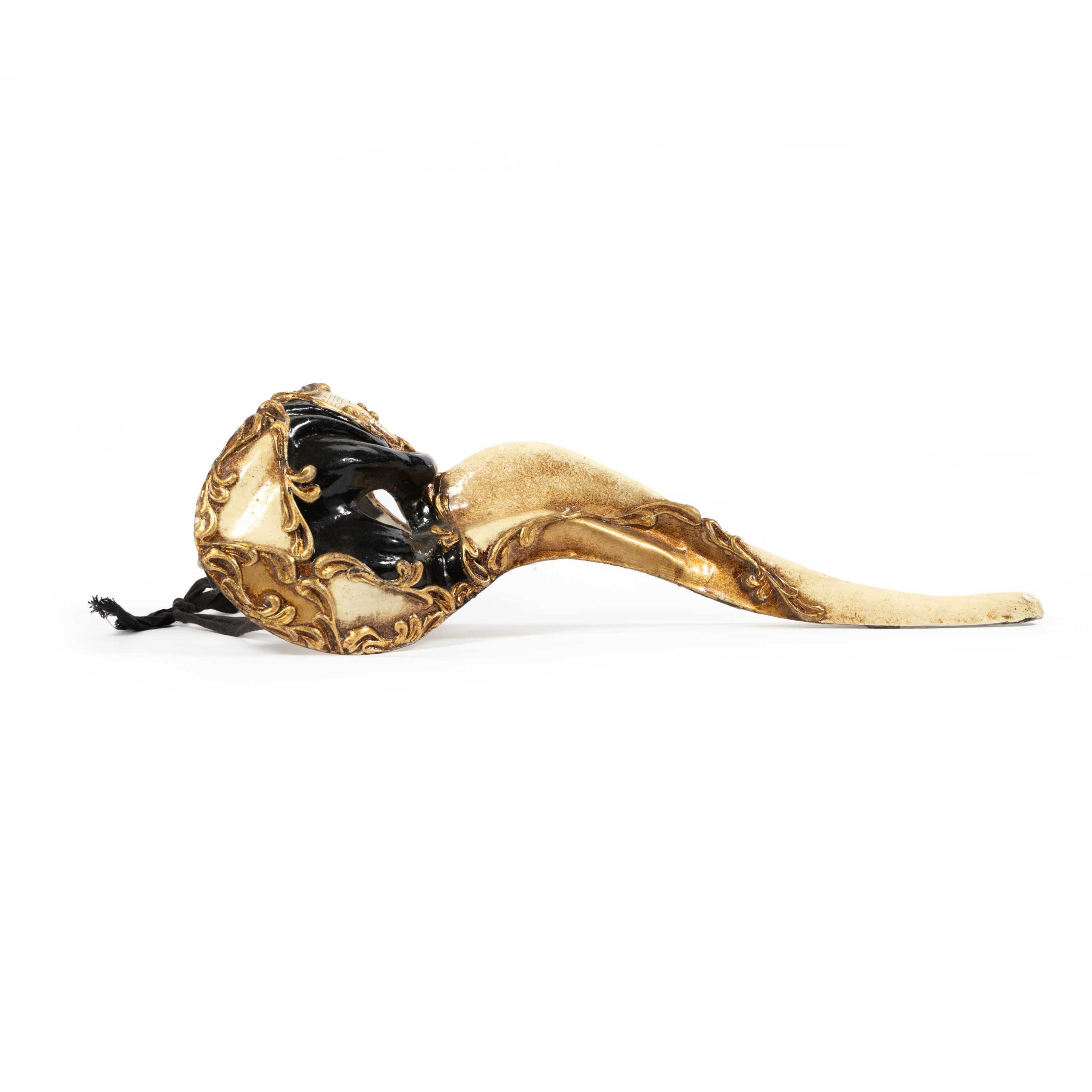 The mask’s sculptural form and elegant colour palette of gold, cream, and black evoke the mystery and grandeur of Venice’s Carnevale. Richly detailed with raised baroque-style flourishes and musical notes, it makes a captivating decorative accent for a wall, a collector’s cabinet, or as a unique wearable art piece for masquerade events. A rare find for enthusiasts of Venetian art, theatre, and historical costume, this mask embodies timeless craftsmanship and the allure of the city’s storied traditions.