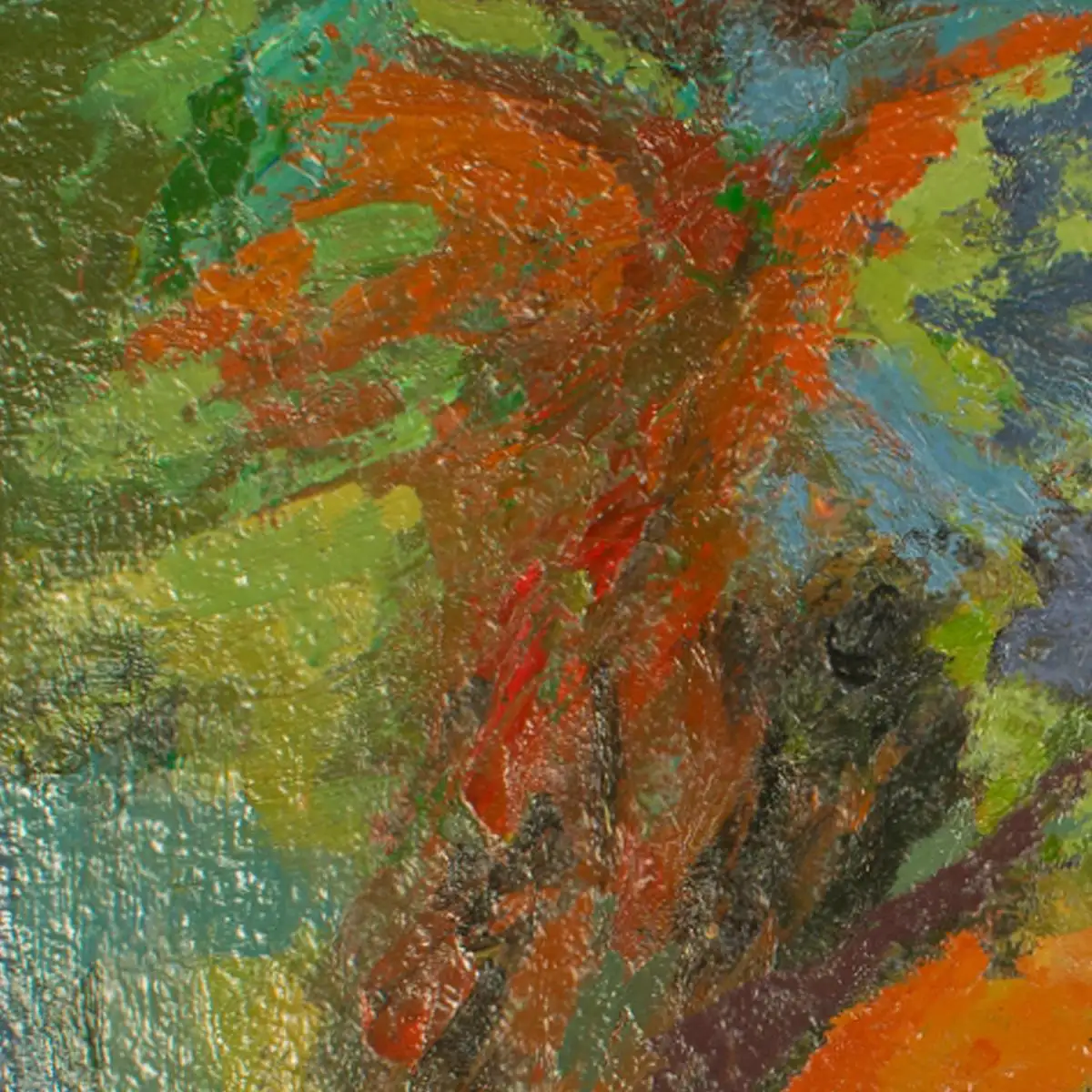 Nicole Devraigne – French – Signed oil on wood panel – The Cat on the Window Ledge. Size: 46 x 55 unframed A bold and vibrant abstract painting of a cat sitting on a window ledge. Signed bottom right.