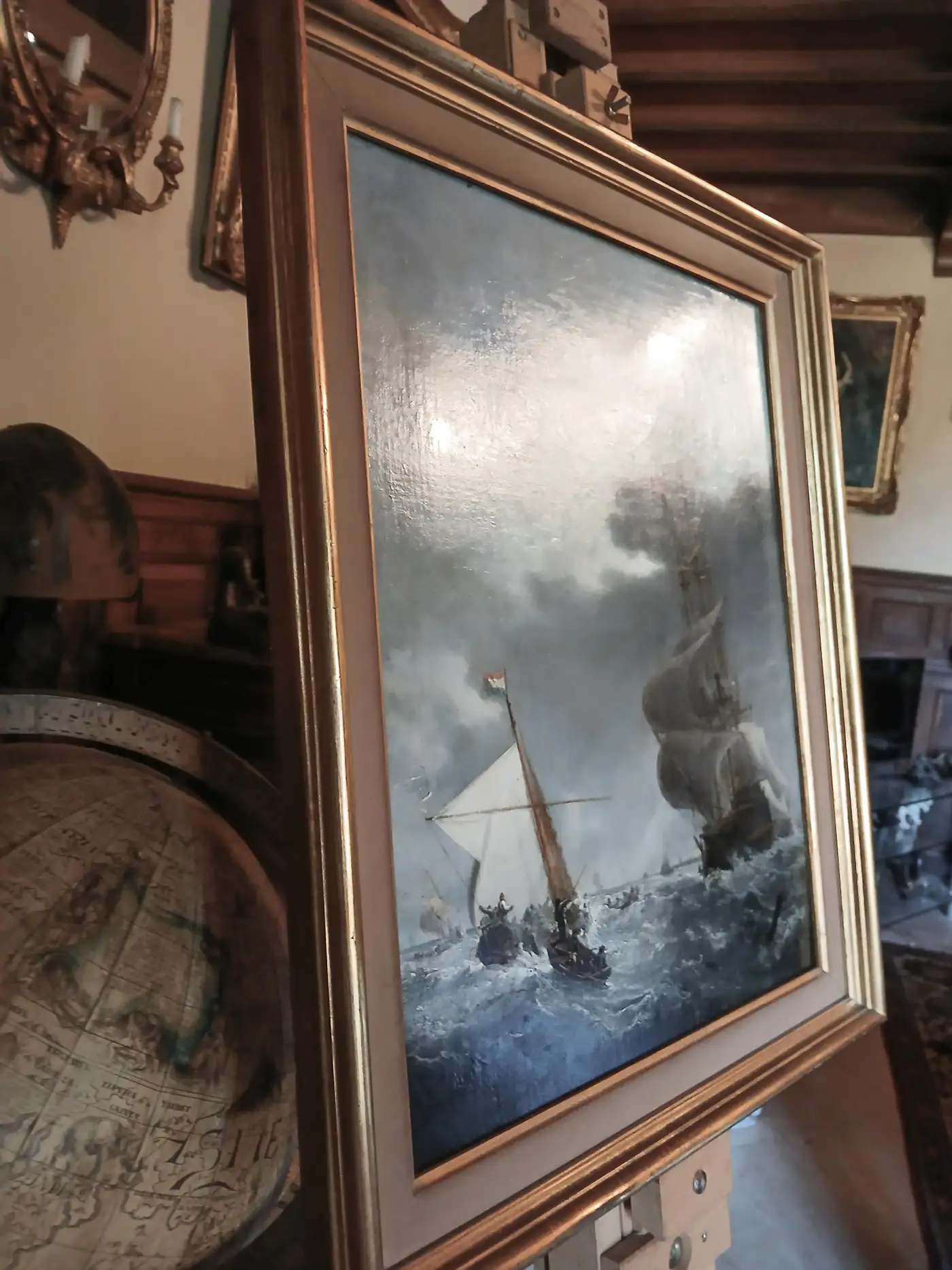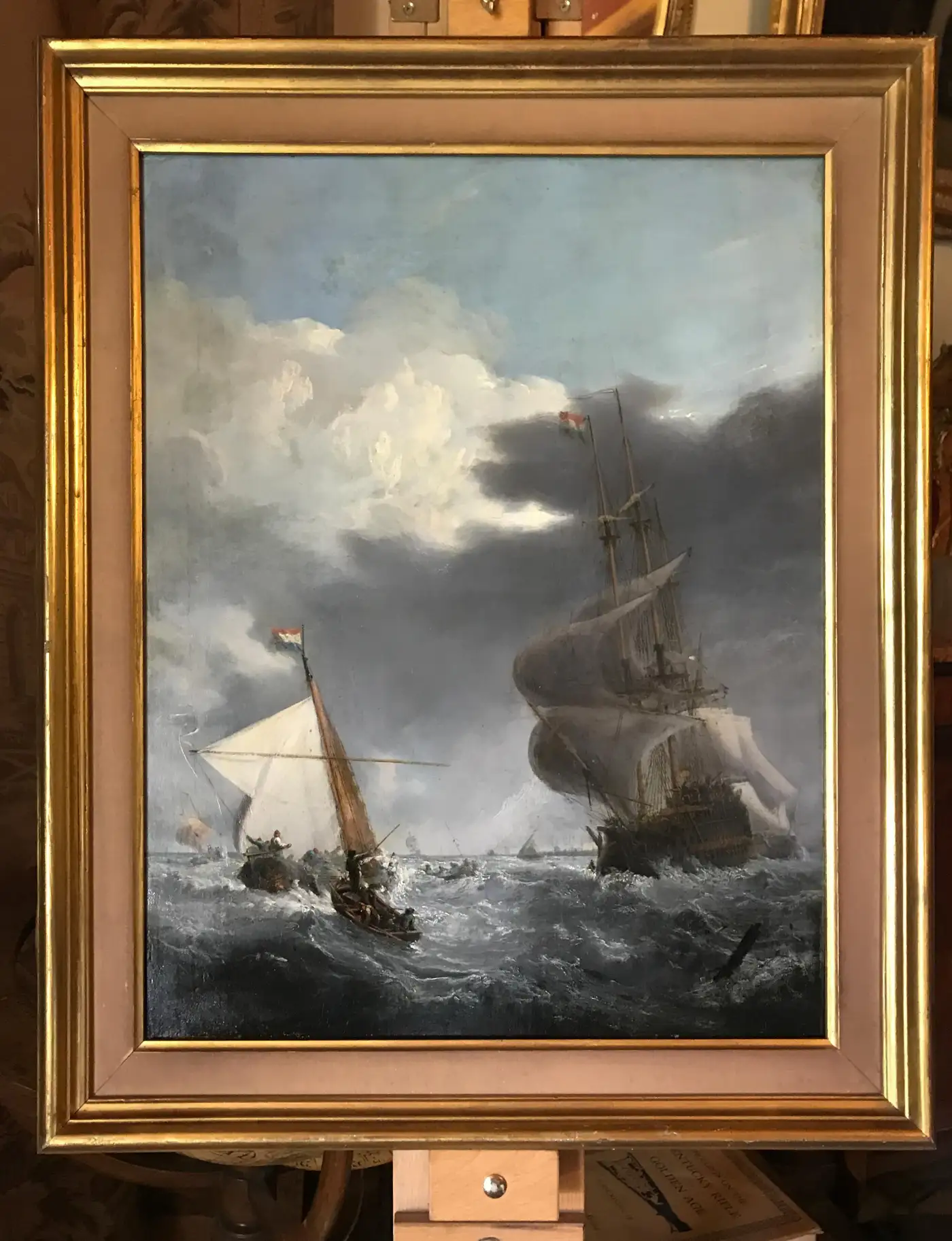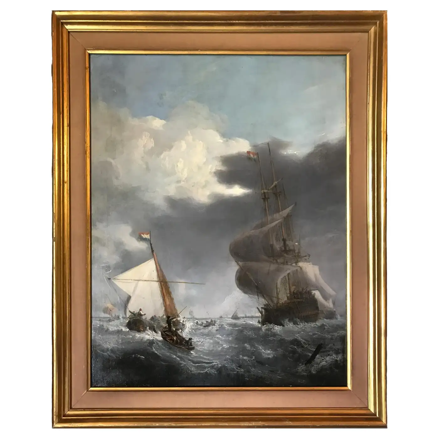 Expertly painted with great attention to the movement of water and atmosphere, this piece conveys both the power of nature and the timeless romance of seafaring life. The dark, moody palette, dynamic composition, and realistic rigging details place it firmly in the Romantic tradition of 19th-century marine art. Oil on canvas Canvas size: 55 x 44 cm (approx. 21.7 x 17.3 inches) Original stretcher with period annotations on reverse Fine gilded frame with canvas insert. In very good antique condition with minor craquelure consistent with age. Relined in antiquity. Condition report: Original canvas in stable condition, relined in antiquity; colours remain rich with fine details visible. Frame shows minor wear appropriate to age.