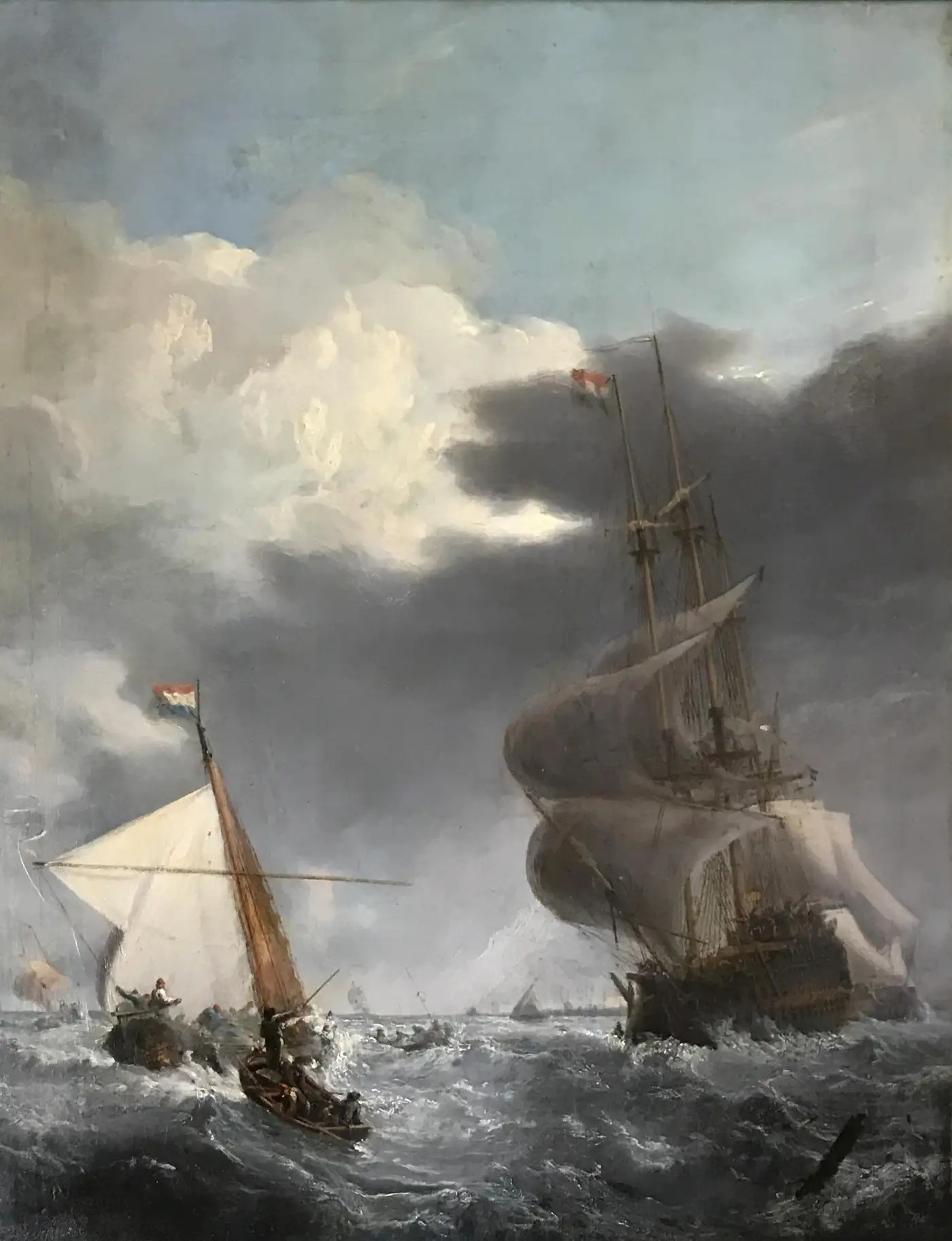 This striking 19th-century oil painting captures the intense drama of Dutch sailing vessels navigating heavy seas under a stormy sky. Inspired by the seascapes of 17th-century Dutch masters like Willem van de Velde, this work features a large three-masted ship with billowing sails and smaller boats in the foreground, all caught in the swirling energy of wind and waves. The vessels fly the classic Dutch tricolor flags, adding historical authenticity and maritime significance.