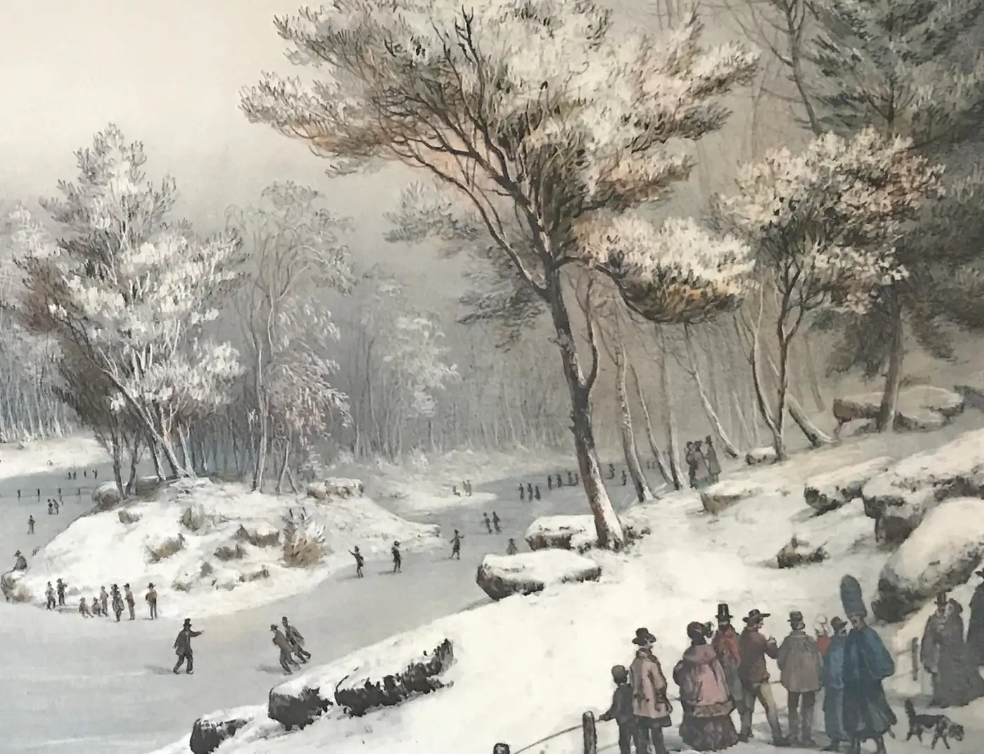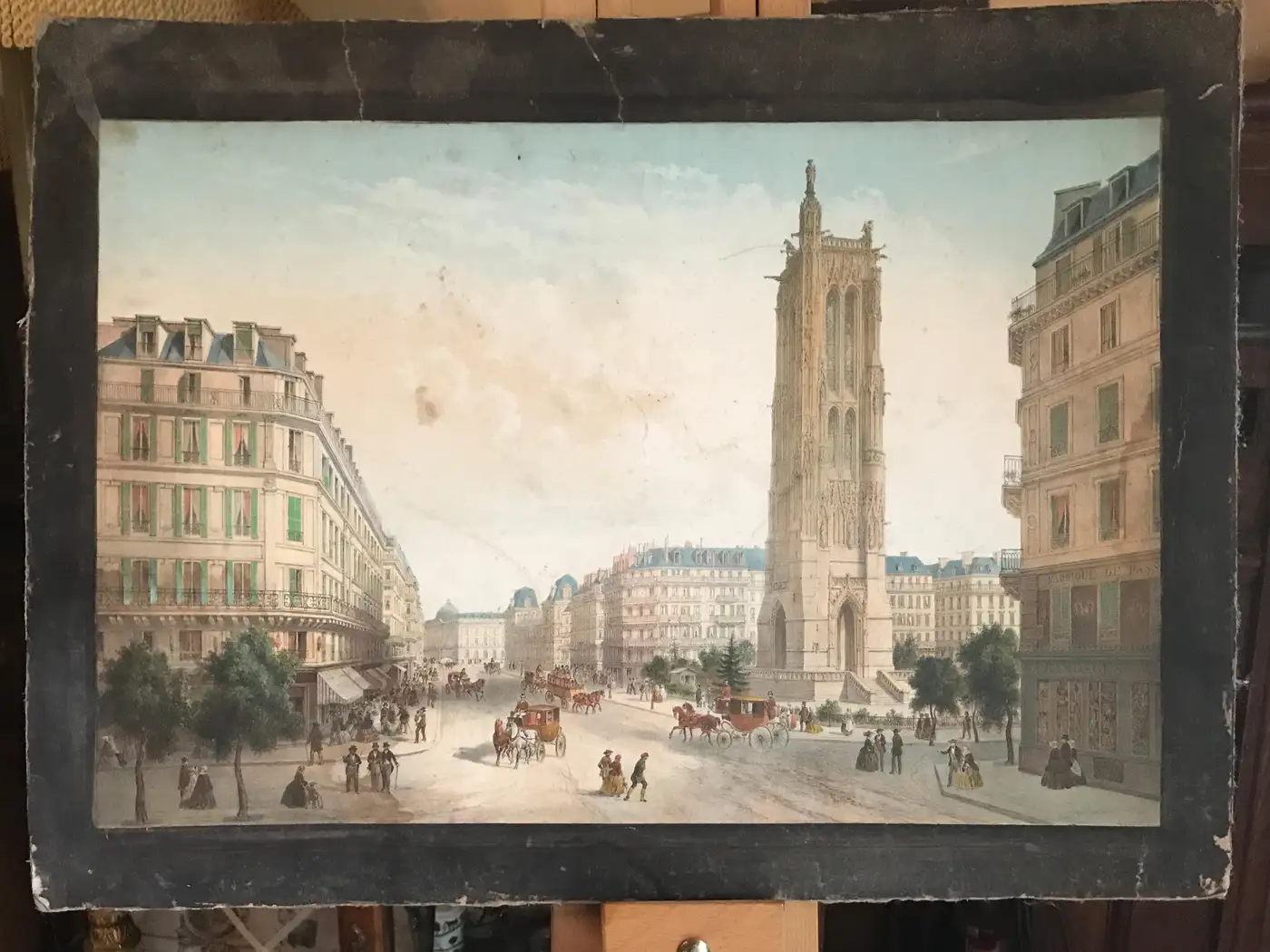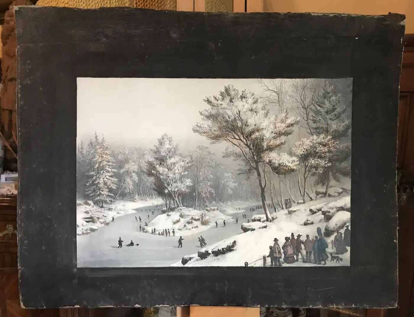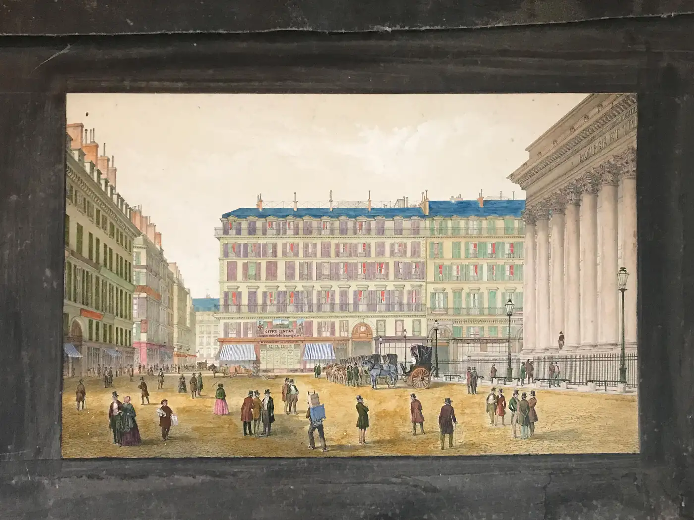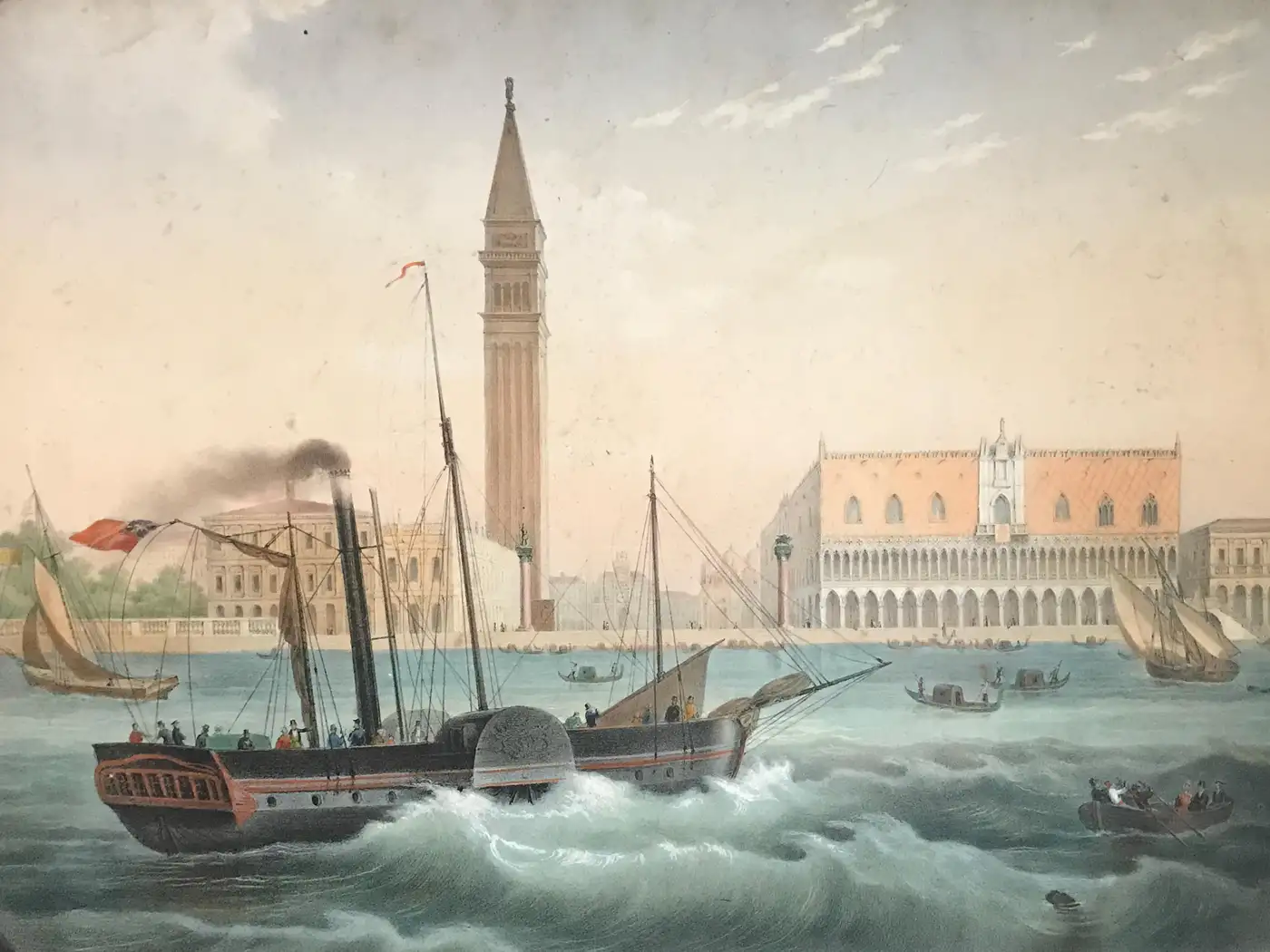 One sheet presents a romantic winter scene in the Bois de Boulogne, where Parisians ice-skate beneath snow-dusted trees, while the reverse offers a striking view of the Bourse de Paris, bustling with life and horse-drawn carriages under the neoclassical colonnade. The second sheet captures a lively 19th century Parisian square dominated by the Tour Saint-Jacques, while the reverse transports the viewer to Venice, where a steam-powered paddleboat surges past the Doge’s Palace and Campanile. This maritime scene balances Venice’s historic elegance with industrial-era dynamism. These are not prints or copies, but finely executed original compositions — delicate, observational, and rich with architectural and social detail. The double-sided format and hand-painted borders confirm their origin in a portable sketchbook, likely intended for private reflection or presentation. Medium: Watercolour and graphite on paper Dimensions (each sheet): approximately 53 x 40 cms. Images vary in size. Condition: Minor wear and foxing consistent with age; black borders scuffed in places but original. Some mild discolouration and staining. Sold unframed for float mounting to display both sides. Provenance: French private collection A rare and poetic glimpse into 19th century European city life, travel, and visual culture.