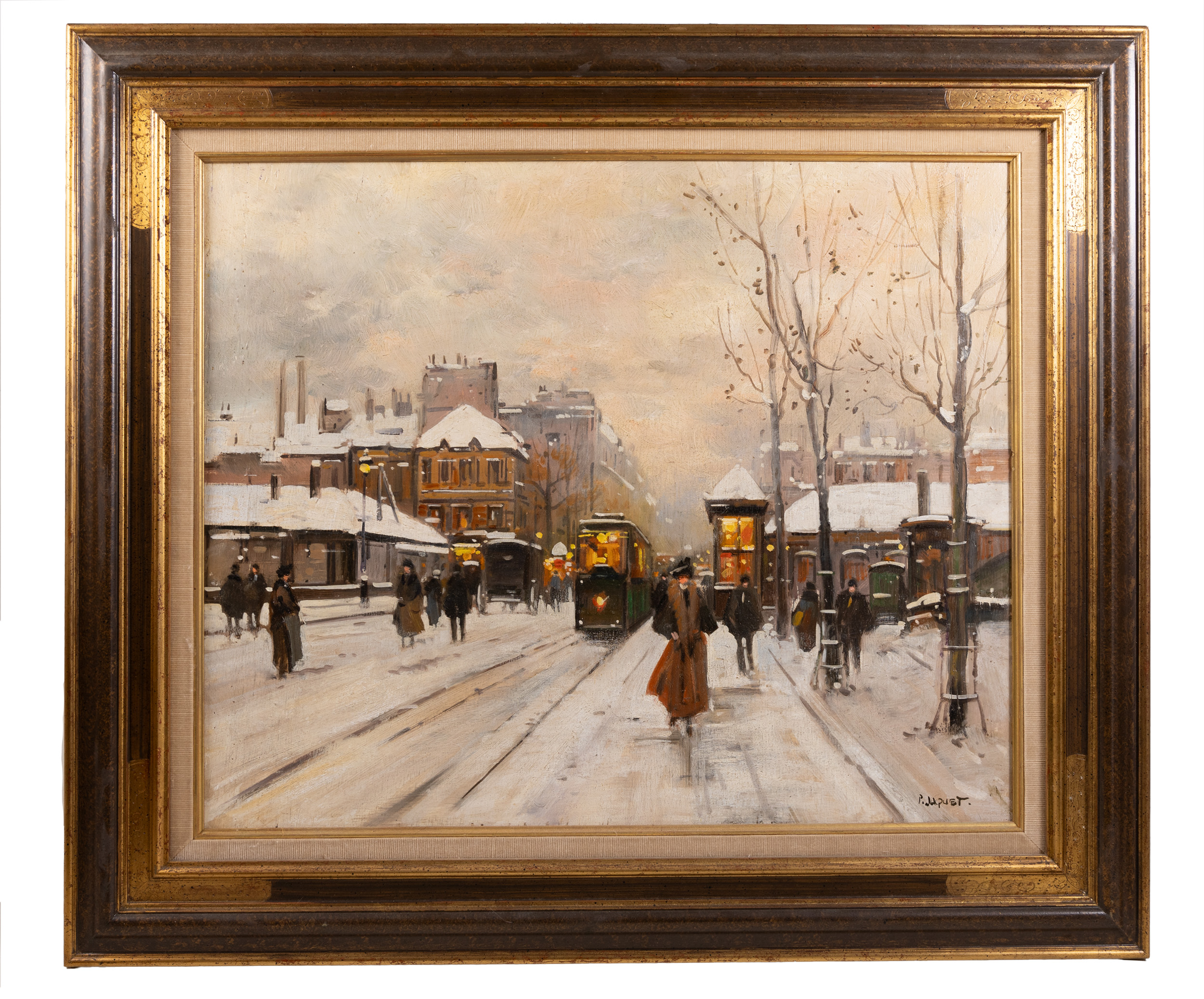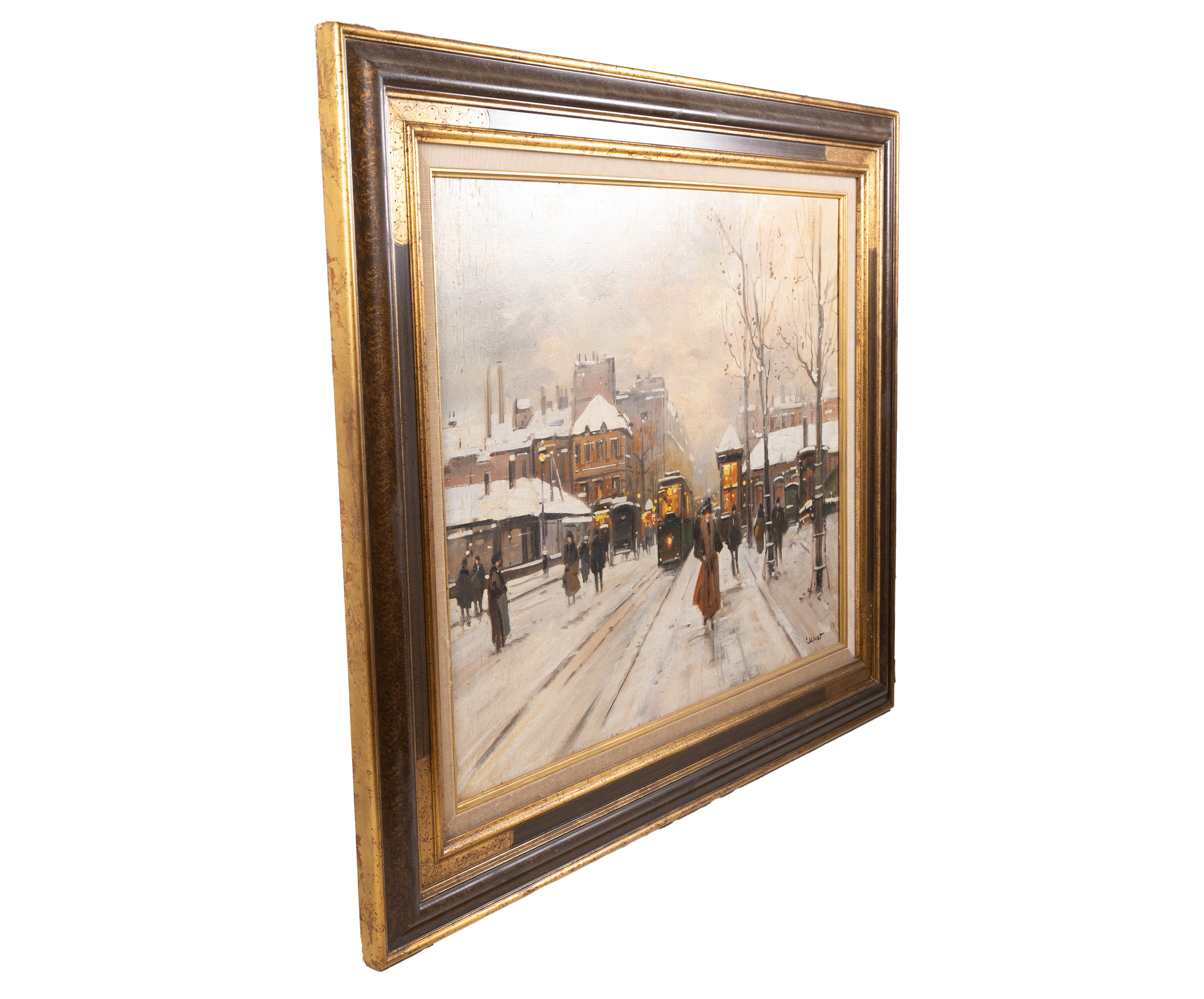 This charming oil on panel by the French artist Pierre Jacquet captures the “Ville Lumière” (City of Light) during a serene winter snowfall. Titled Paris, les boulevards sous la neige, the work is a quintessential example of the 20th-century Parisian school, focusing on the atmosphere, movement, and nostalgic architecture of the French capital.