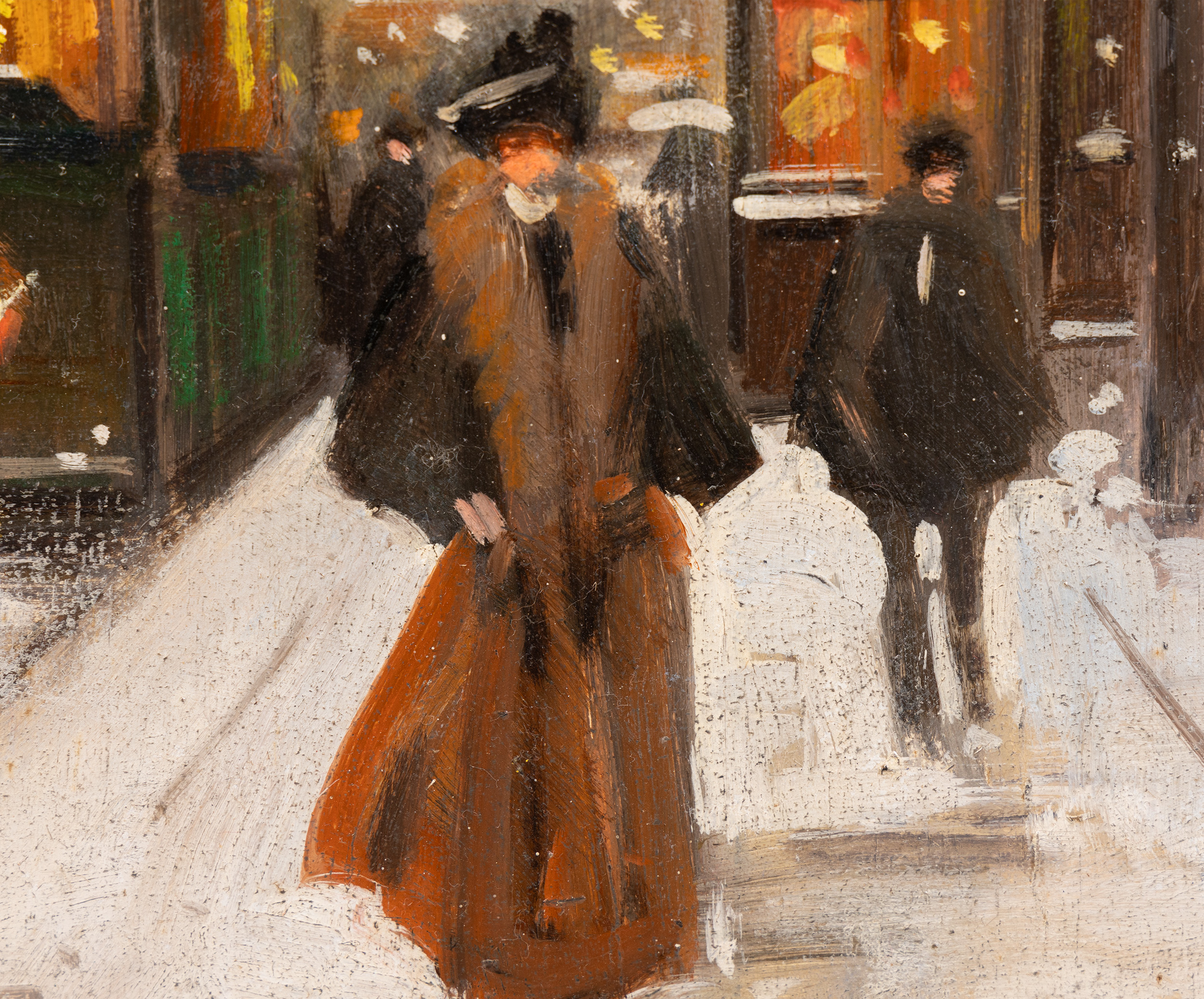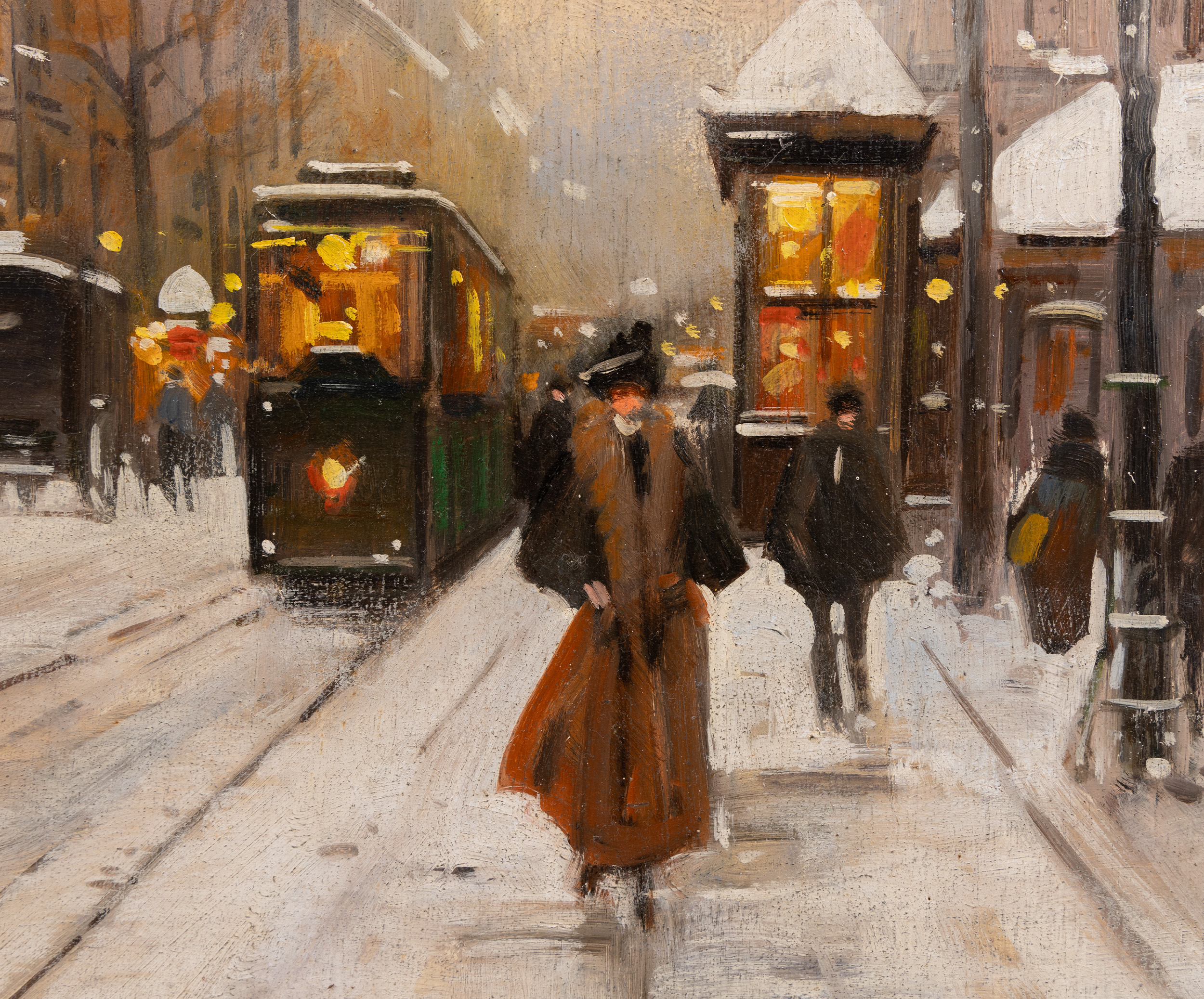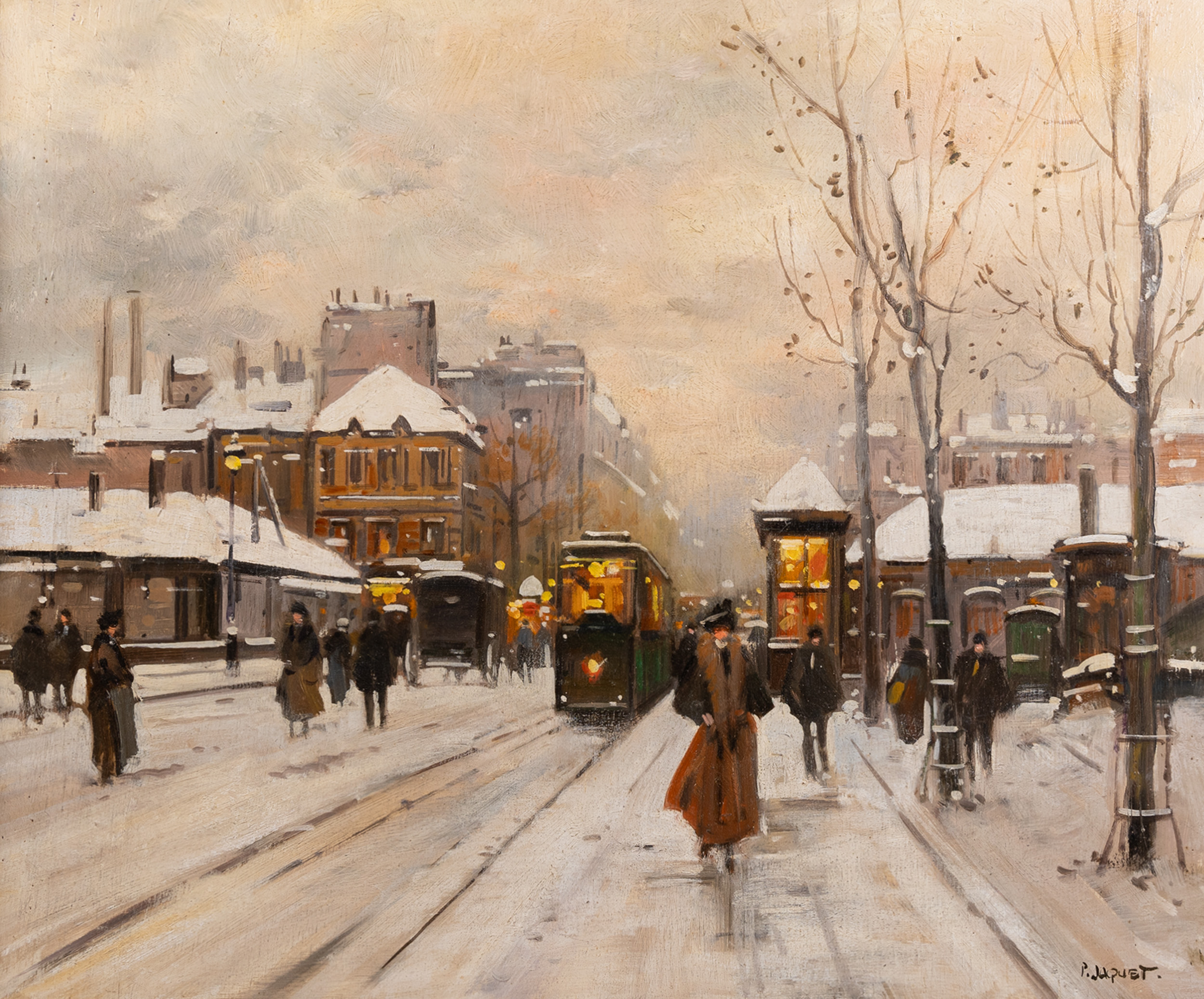 His style is characterized by a fluid, painterly touch that prioritizes atmosphere and light over rigid architectural detail. By using a panel support, Jacquet was able to achieve a smooth, luminous surface that perfectly suits the misty, reflective qualities of a city under snow. His works are highly collectible for those seeking to capture the timeless, romantic spirit of the Belle Époque as it transitioned into the modern era.