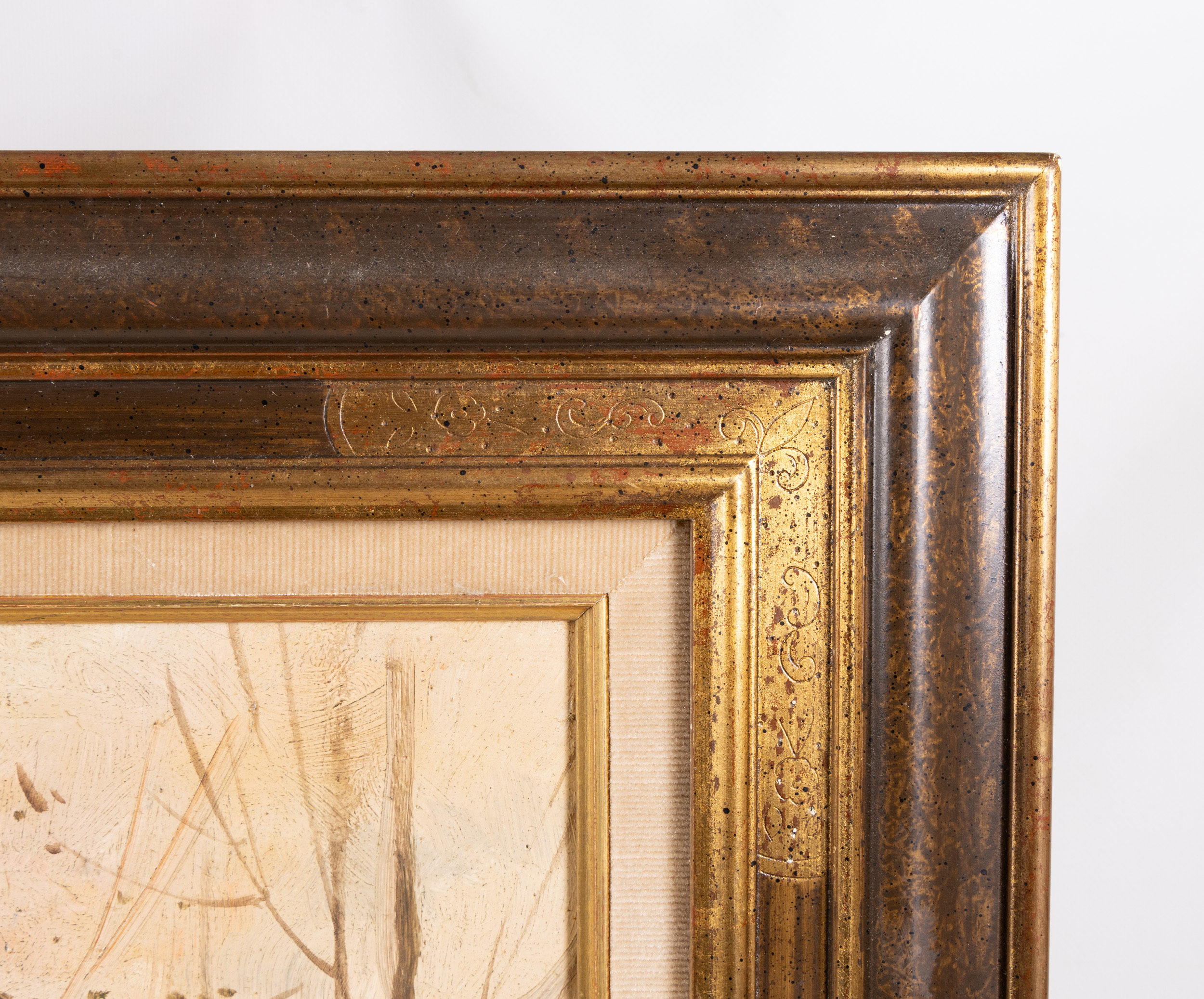 The painting is presented in a sophisticated, wide-profile mid-century style frame. The presentation features: A dark, chocolate-toned wood outer molding. A luxurious gilded inner bevel that draws the eye toward the light within the painting. A traditional linen/fabric slip, providing a soft transition between the artwork and the frame.