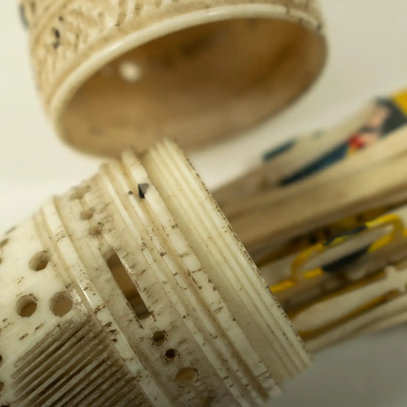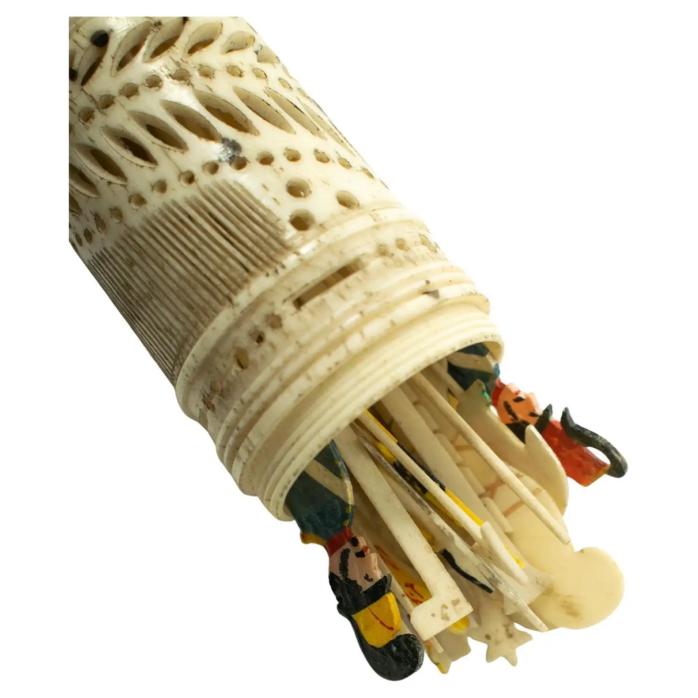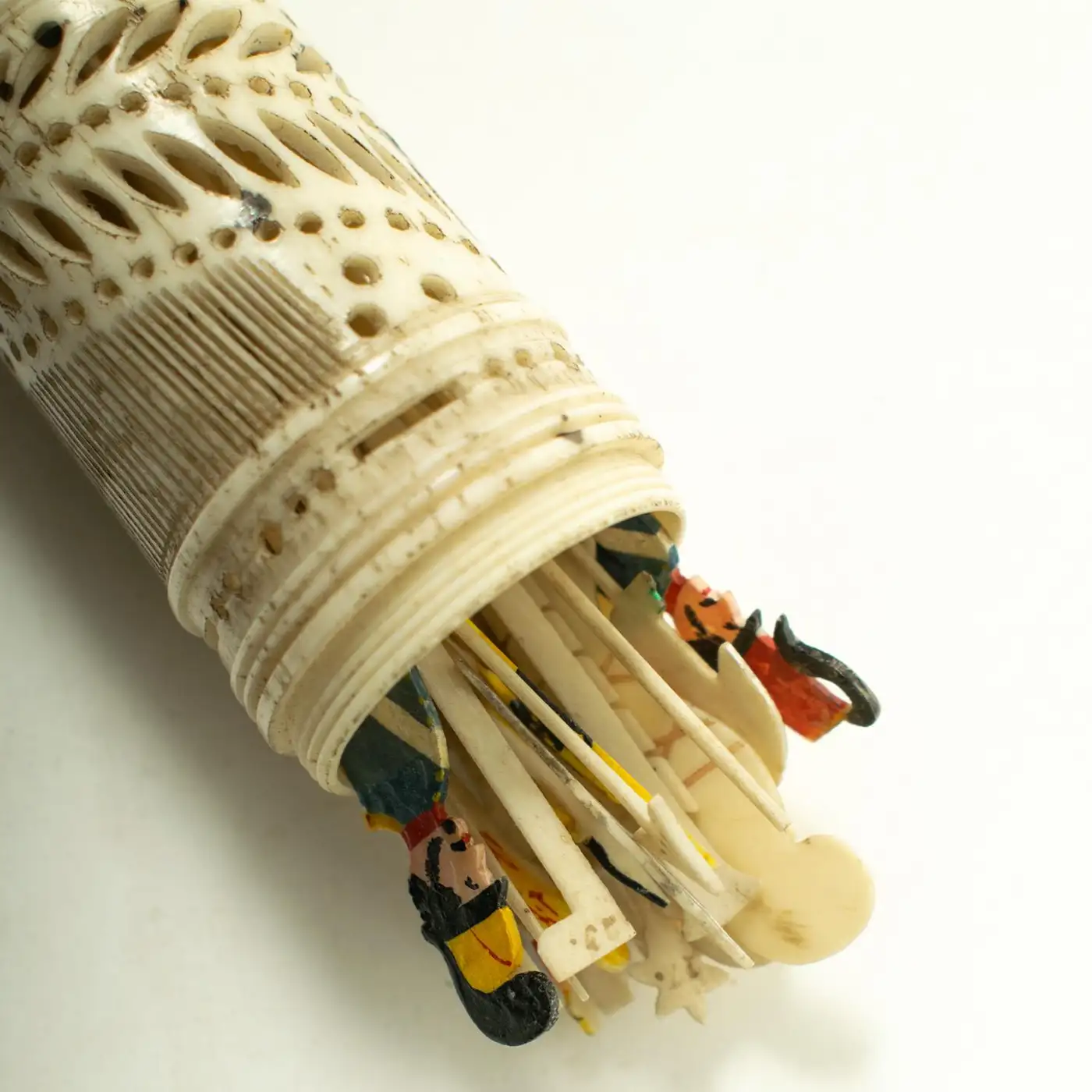 Made of bone, ornately pierced with spiral latticework and geometric patterns. Finely threaded screw-top lid, carved in a matching decorative style. Contents: Assortment of approximately 33 bone gaming sticks or tokens, each hand-carved and painted. Some shaped as soldiers, muskets, pikes, trumpets, and other musical instruments. Several pieces are numbered, suggesting use in a game or form of scoring.