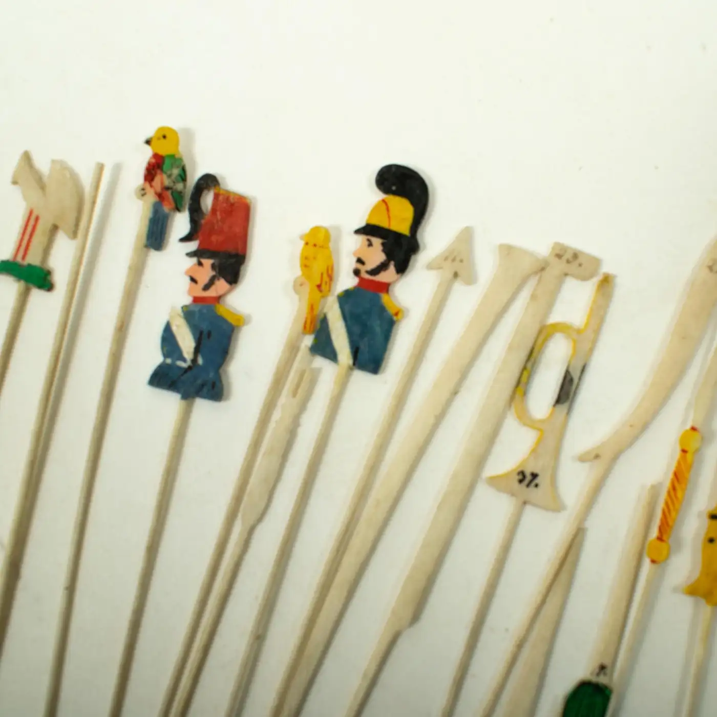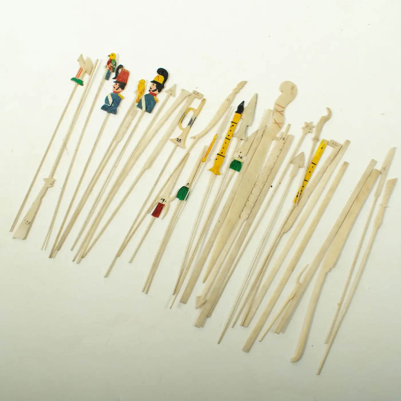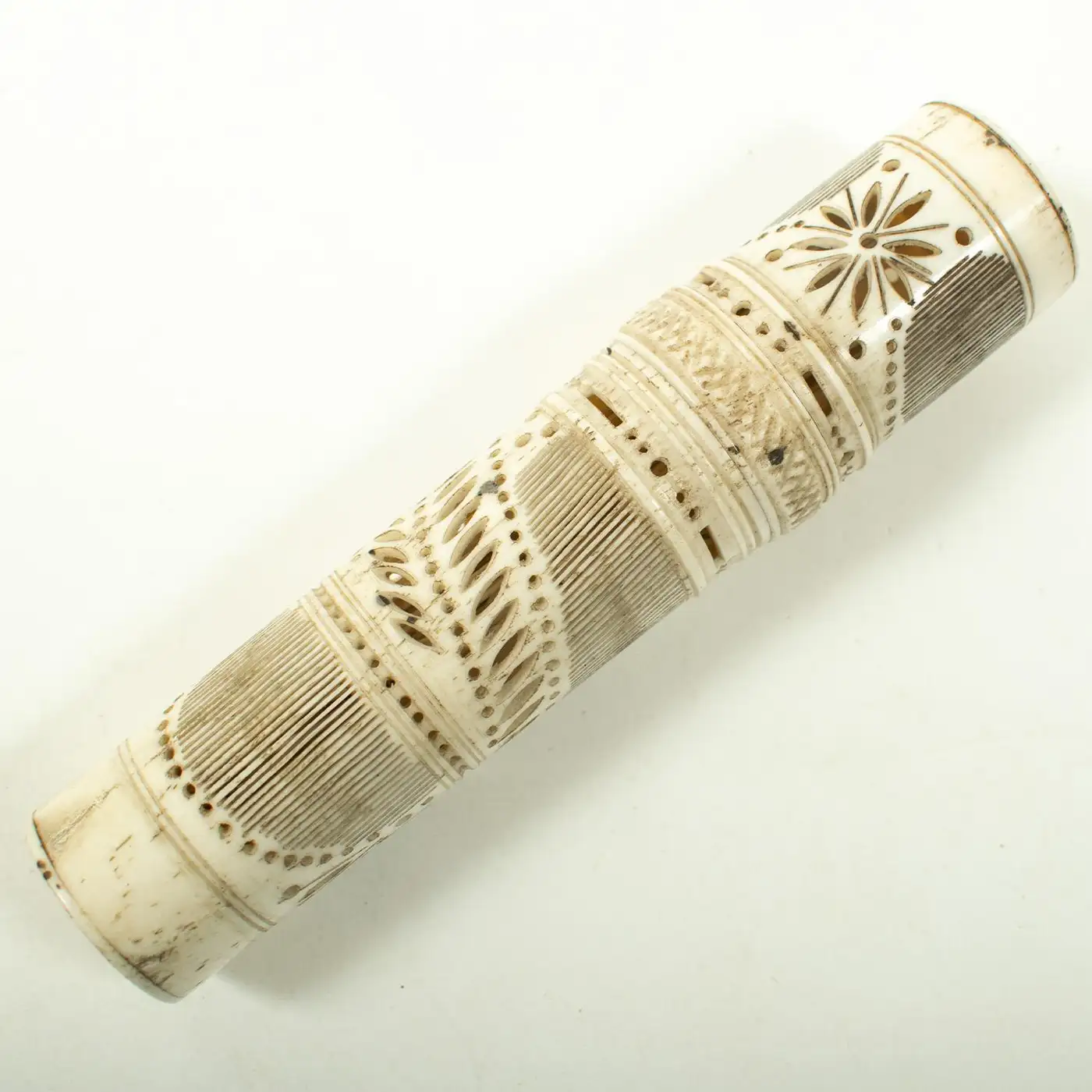 Made of bone, ornately pierced with spiral latticework and geometric patterns. Finely threaded screw-top lid, carved in a matching decorative style. Contents: Assortment of approximately 33 bone gaming sticks or tokens, each hand-carved and painted. Some shaped as soldiers, muskets, pikes, trumpets, and other musical instruments. Several pieces are numbered, suggesting use in a game or form of scoring.