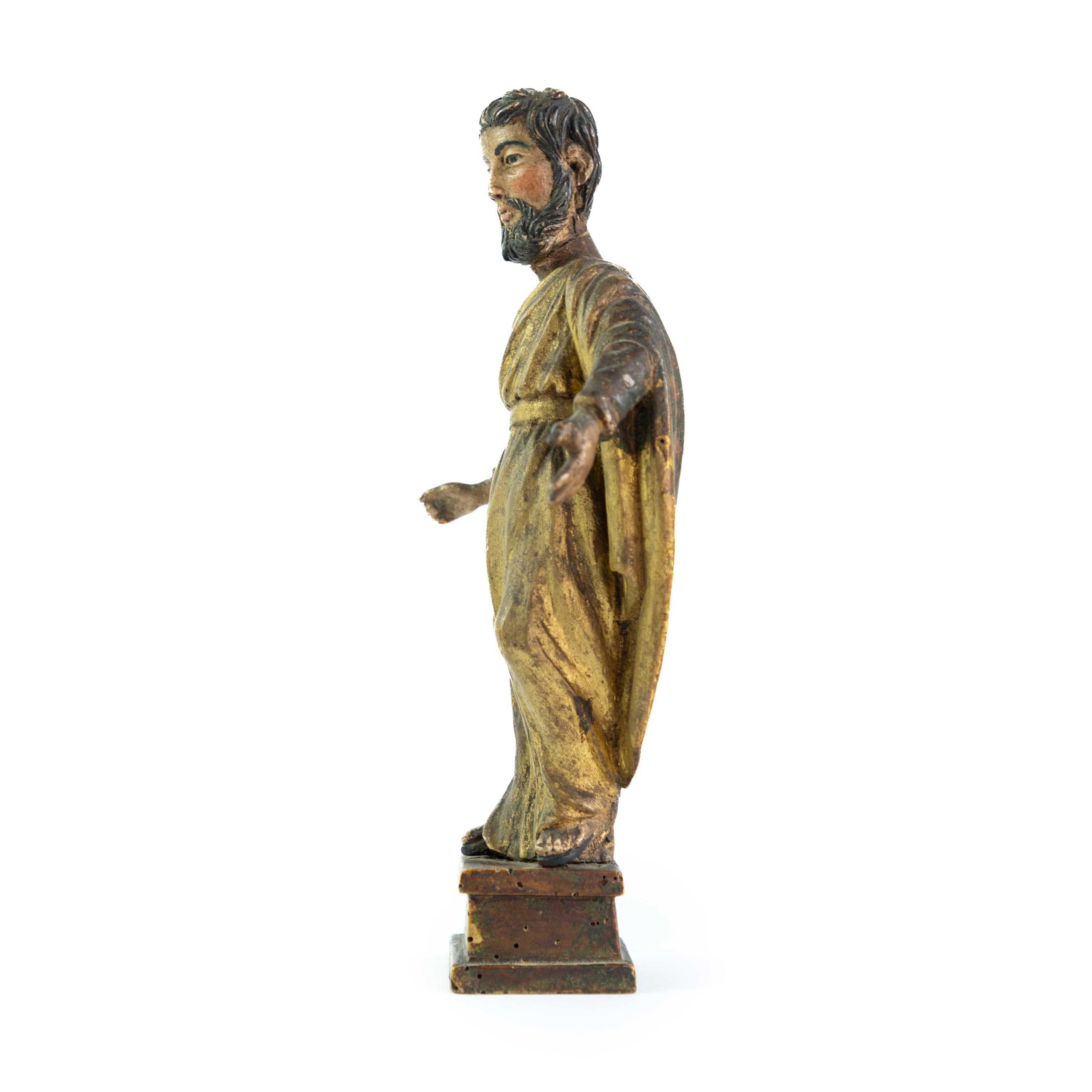 SAINT PAUL: Statuette in carved and gilded polychrome wood, Late 18th century. Saint Paul, also known as the Apostle Paul, was an important figure in early Christianity and is often depicted in various forms of religious art. Height: 29.5cm The statuette has suffered the ravages of time and displays a crack around the neck possibly following an old repair. Areas of gilding and polychrome finish are missing. There are also worm holes in the wooden pedestal base. It. still remains however an attractive piece.