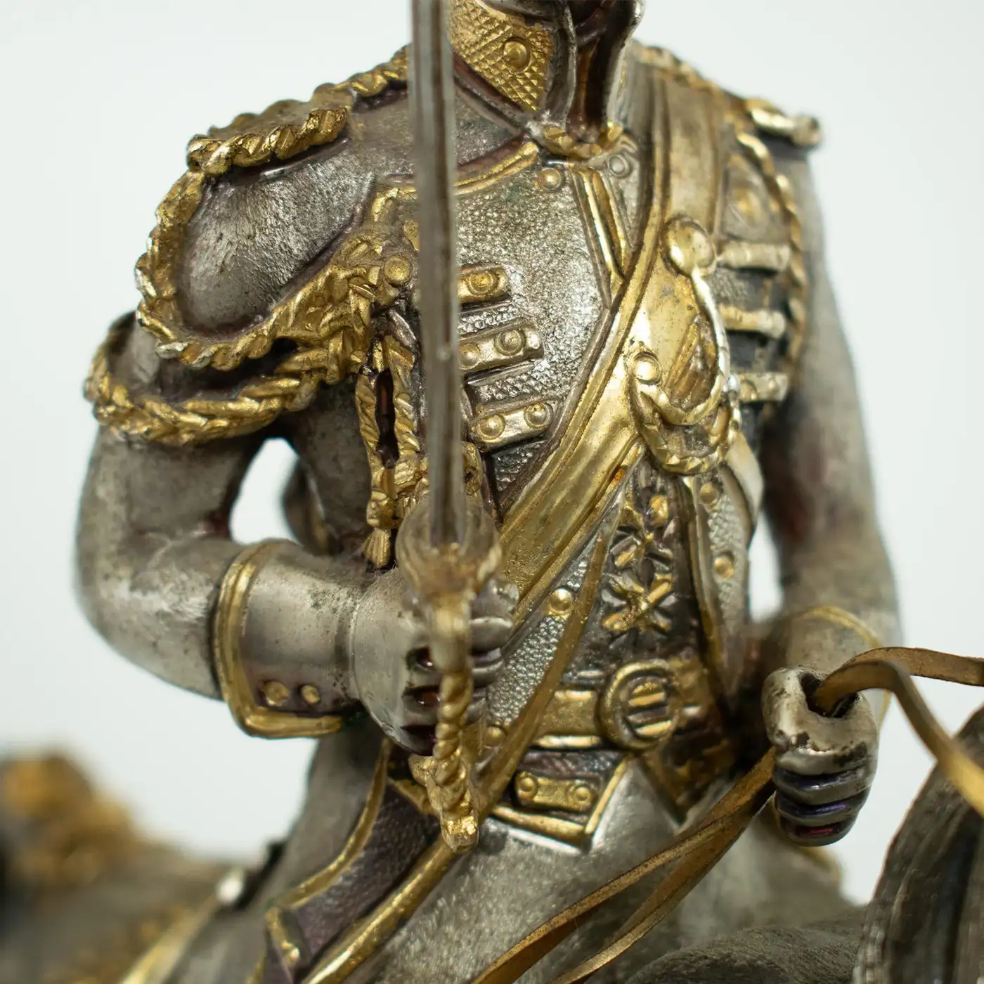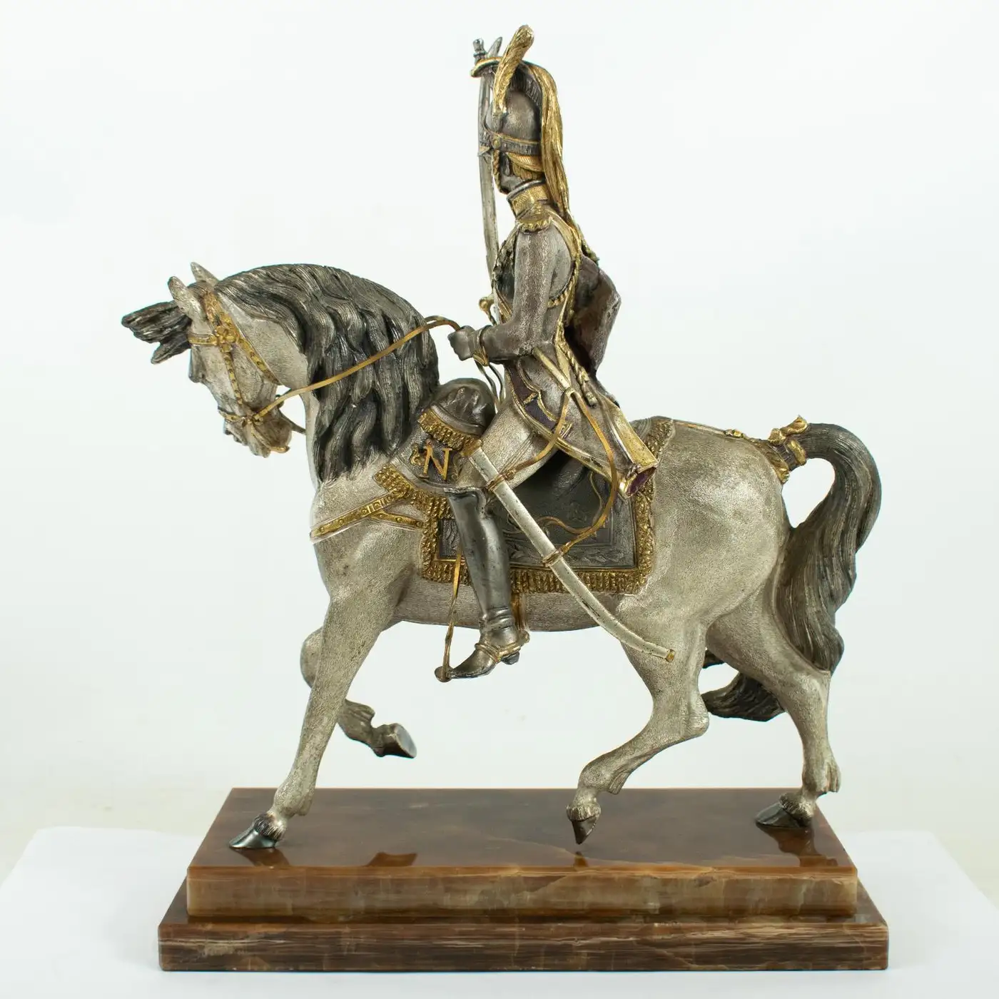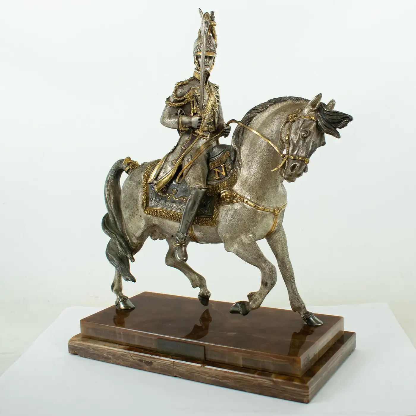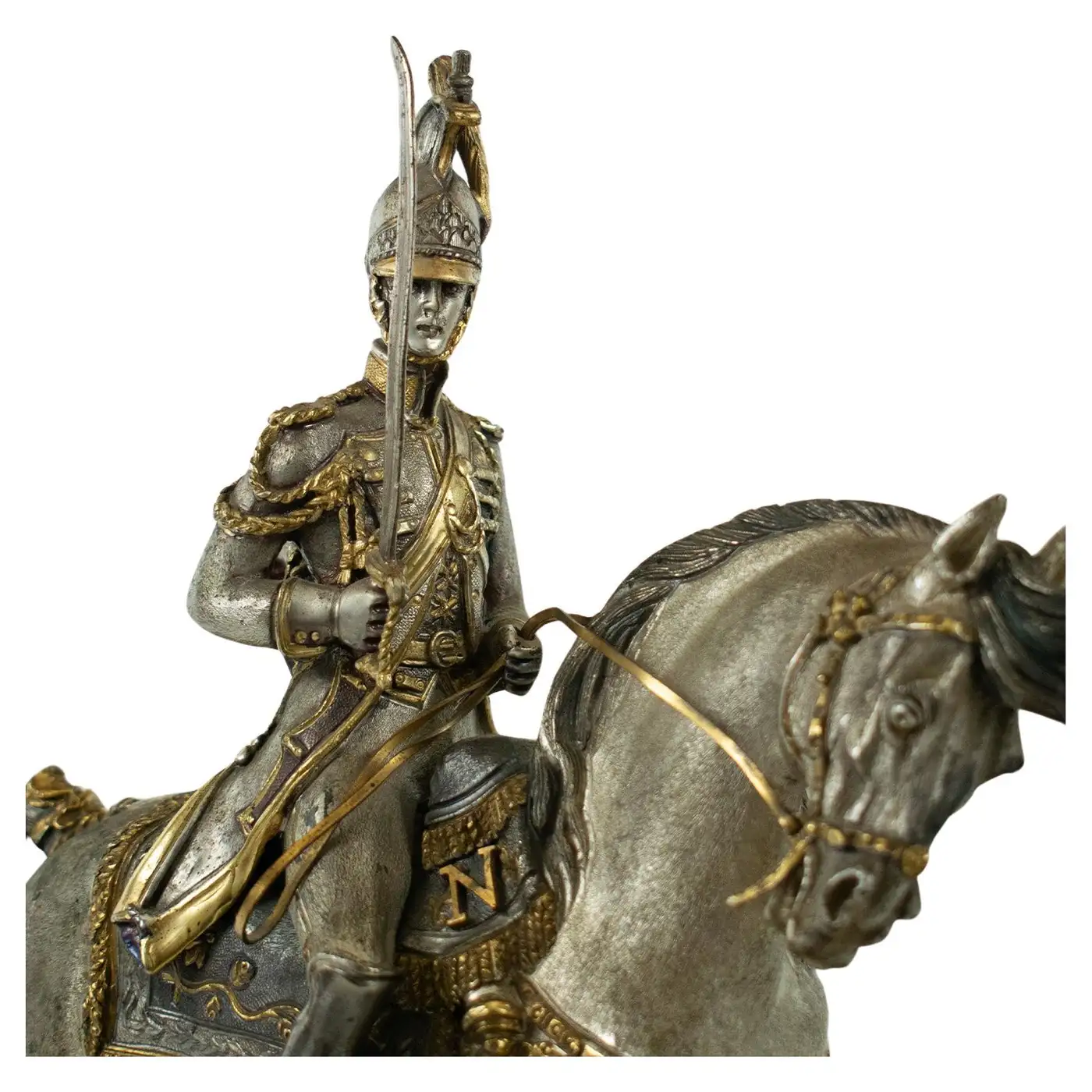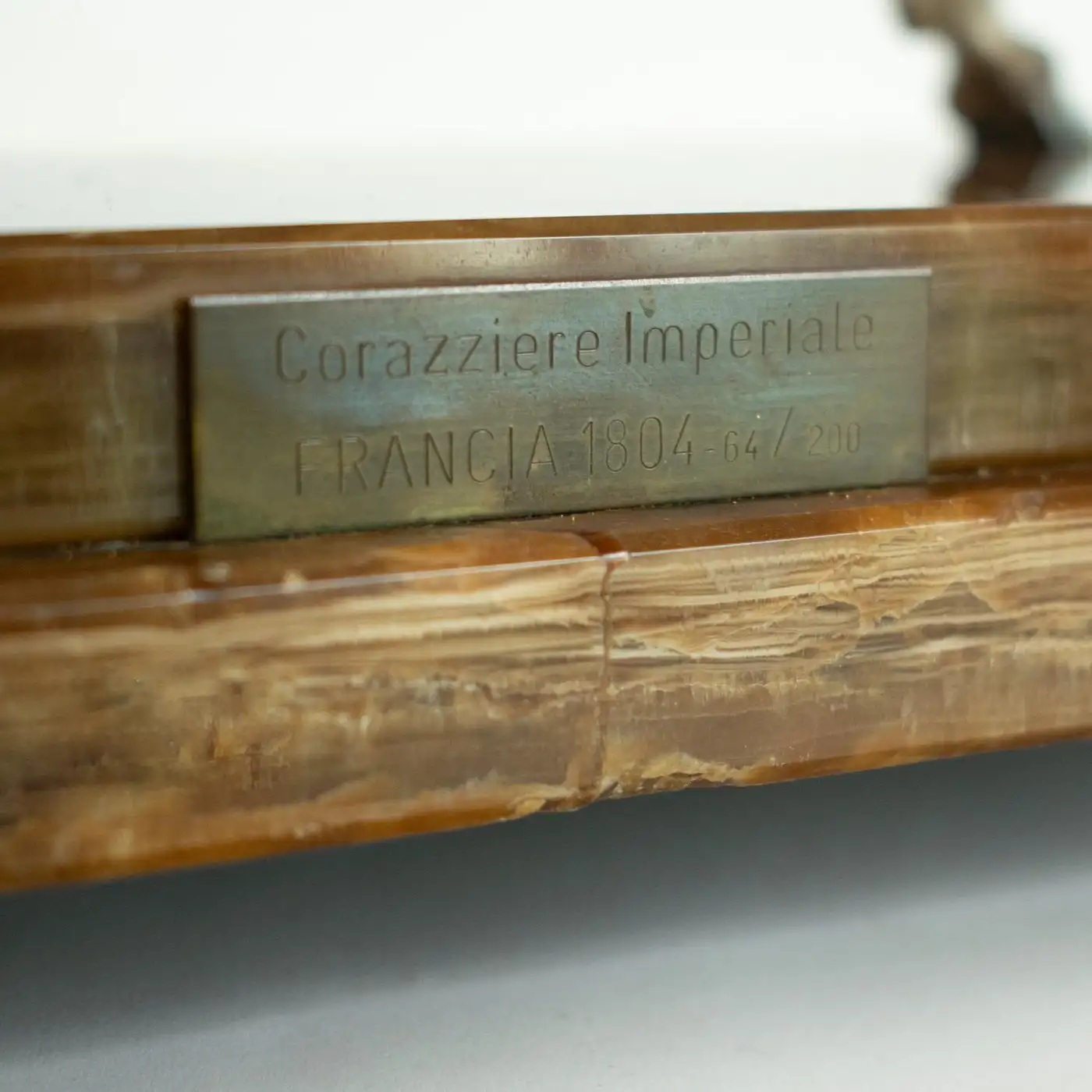 A beautifully detailed bronze sculpture of a soldier mounted on his horse bearing the insignia of Napoleon with silver and gold gilt and polychrome patina. On an onyx base (some small losses and chips). Plate mentioning “Corazziere Imperiale Francia 1804 64/200”. This piece is a limited edition and numbered 64 out of 200 made. The phrase “Corazziere Imperiale Francia 1804” appears to be Italian. It translates to “Imperial French Cuirassier 1804” in English.
