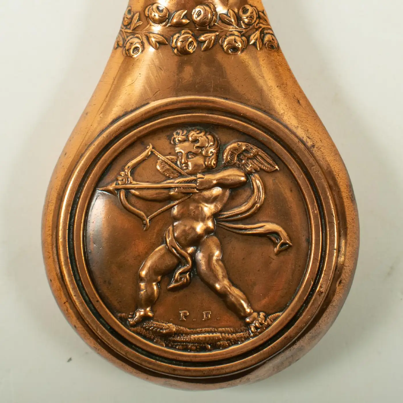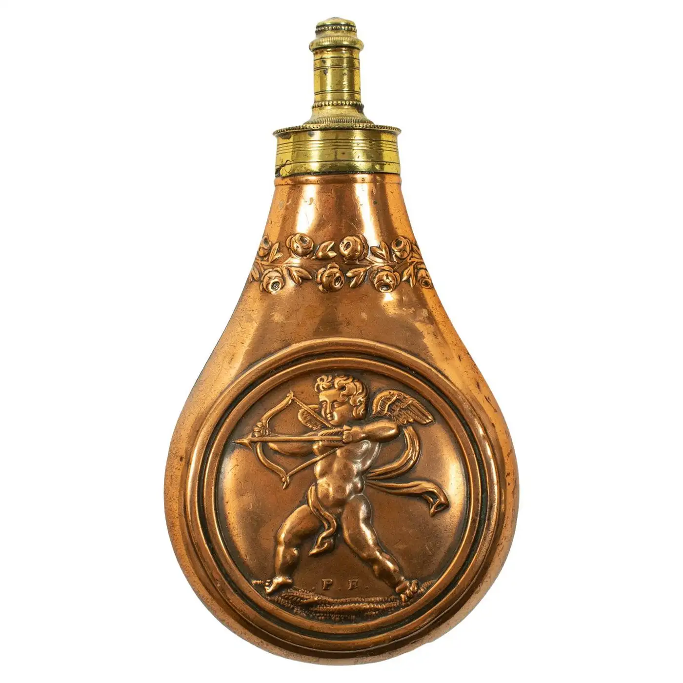 A finely crafted brass and copper flask, measuring 11.5 cm overall, featuring a heavily embossed design of a Cupid with bow and arrow within a circle and garnished with a ring of embossed rosies towards the nozzle. The flask is equipped with a removable measuring cap, adding both functionality and charm. In good condition, it shows only a few minor marks and dents, consistent with age. This distinctive flask would be an ideal complement to a set of pistols, offering both practicality and decorative appeal.
