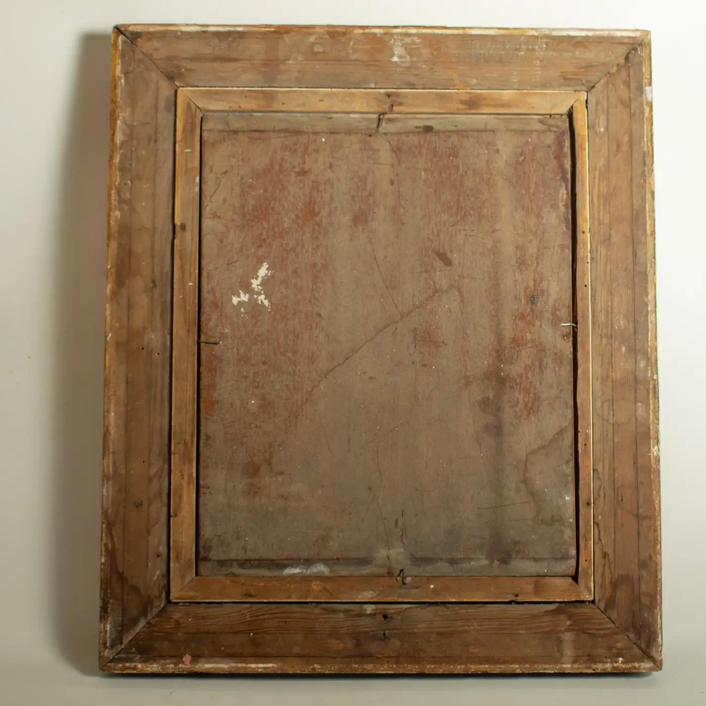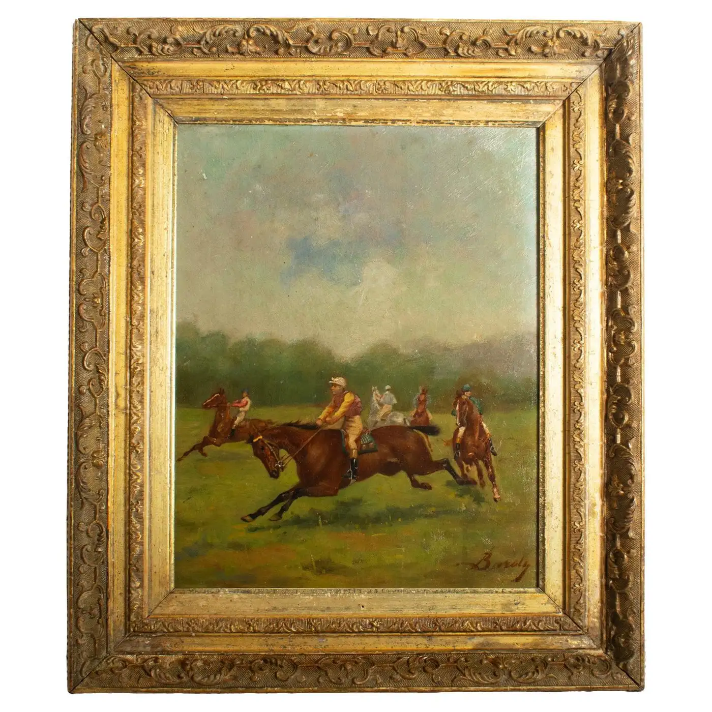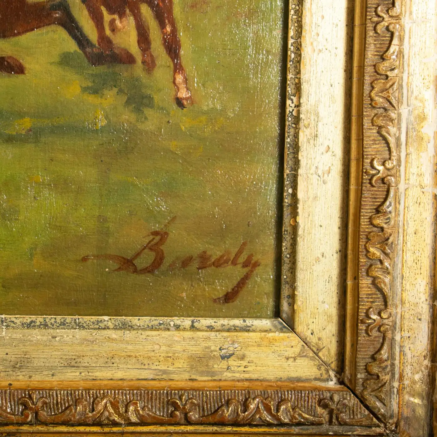 A skilful and colourful depiction by the artist of the start of a horse race – the painting shows several horses proving to be almost too much to handle as their jockey’s grapple with the reins to maintain control. The painting is signed bottom right. The painting is in good condition, showing only a few tiny losses to the painted surface. The frame has undergone some simple restoration and is complete, but remains in a distressed condition. Panel size: 28 x 35 cm, Framed size: 41 x 49 cm