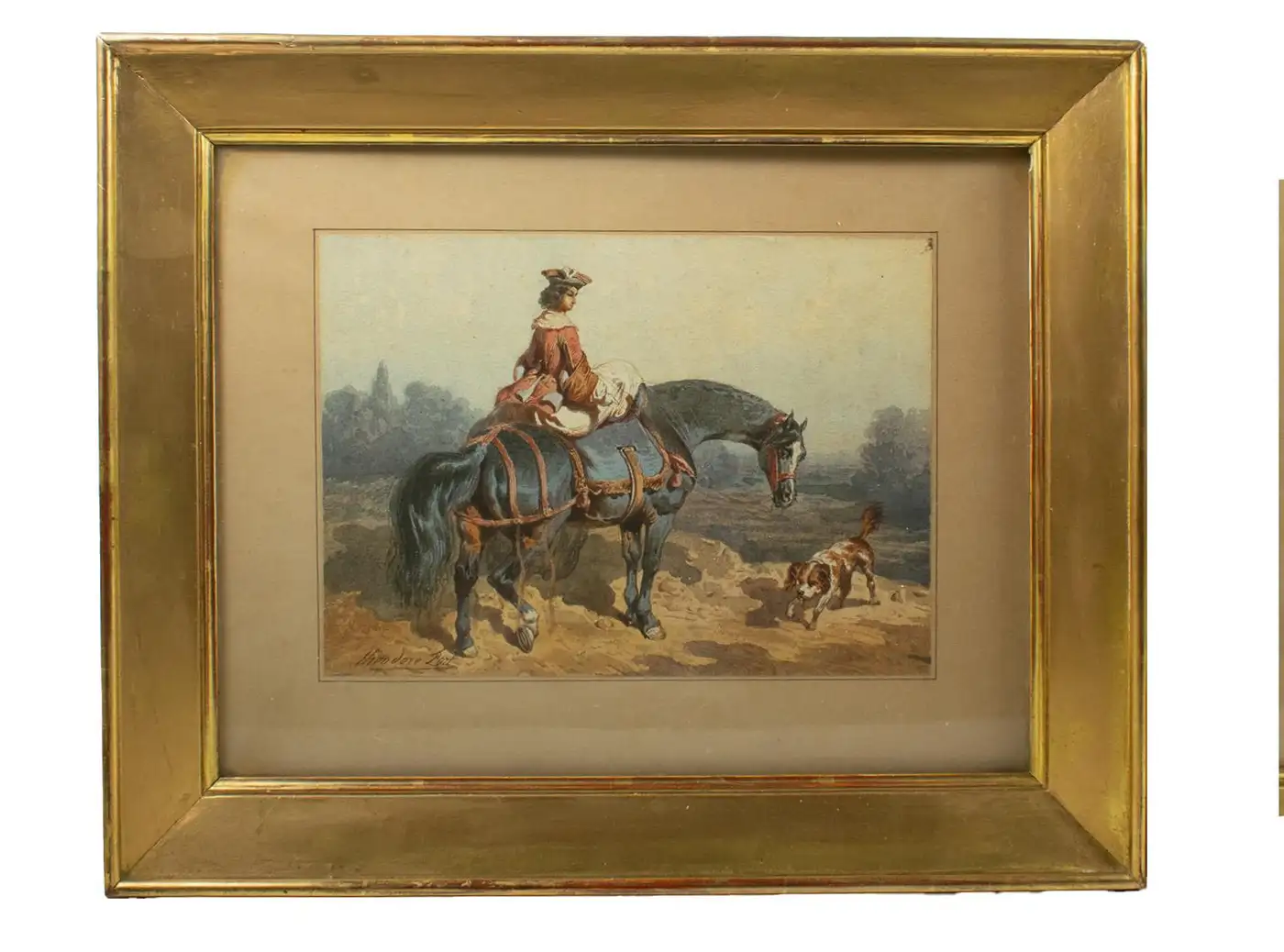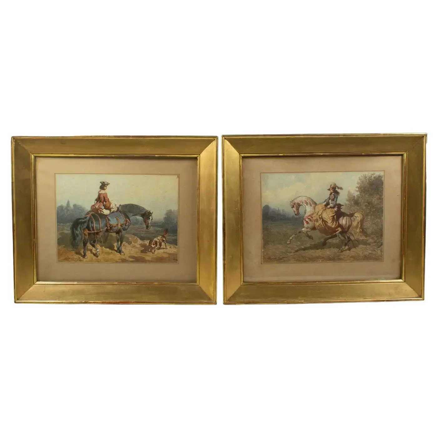 The figures and horses are rendered with precision, yet the atmospheric backgrounds retain a painterly softness, evoking the romanticism of the hunt. Signed in the lower left of each sheet and presented in period gilt frames with mounts. About the Artist: Théodore Fort (1810–1896) was a French painter and watercolourist celebrated for his equestrian and military subjects. He exhibited at the Paris Salon from 1842 onwards and gained a reputation for his accurate yet expressive depictions of horses and riders, often in hunting or cavalry contexts. His works appealed to both French and British collectors during the 19th century, with examples held in public and private collections. This pair offers a rare opportunity to acquire two companion pieces by an accomplished 19th-century French sporting artist, perfect for collectors of equestrian art and lovers of the hunt.