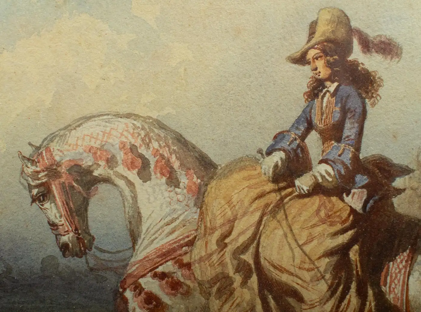 A charming pair of equestrian hunting scenes by Théodore Fort, depicting elegantly dressed women on horseback during a chasse à courre (French stag or fox hunt). One composition shows a rider on a dark bay horse accompanied by a hunting dog, set in a soft rural landscape. The other captures a dynamic side view of a rider on a spirited, dappled grey mount, executing a lively movement across a field. Executed in delicate watercolour, both works display Fort’s refined draughtsmanship and sensitivity to light, equine anatomy, and 19th-century sporting fashion.