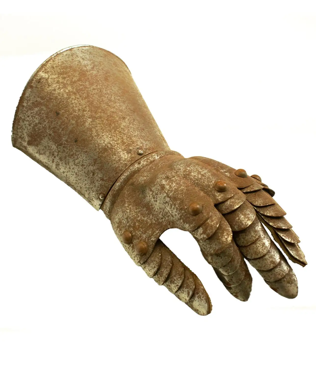 A left handed gauntlet with all fingers and thumb present, jointed and riveted with leather inserts along the inside of each finger. Showing signs of age and rust throughout.