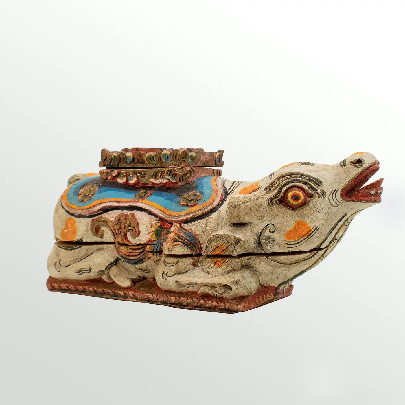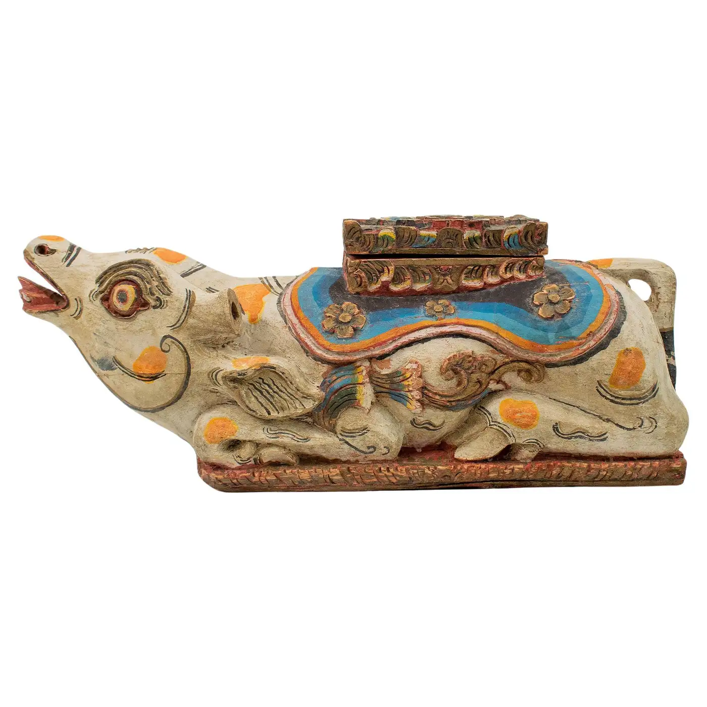 A colourful carved wood, painted and decorated Holy cow and trinket box – India, circa 1910. Naively carved and painted with a sliding wooden lid to the box. Some shrinkage cracks and signs of wear overall. In Hinduism, the cow is revered as sacred, and depictions of cows are common in religious art. A highly decorated wooden cow could represent the divine attributes associated with cows in Hindu mythology. The cow holds immense cultural significance in India beyond its religious connotations. It symbolises fertility, abundance, and prosperity. A decorated wooden cow could be a representation of these cultural values, serving as a decorative piece in homes or temples. The lidded box on the back of the wooden cow suggests a practical function, perhaps as a container for storing precious items, offerings, or even household essentials. In this sense, the wooden cow combines artistic expression with utility, reflecting the fusion of aesthetics and functionality often seen in traditional Indian craftsmanship. Highly decorated wooden sculptures are a hallmark of Indian artistic tradition. Such a piece would have been crafted by skilled artisans using traditional techniques passed down through generations. Its colourful decoration would showcase the craftsmanship and artistry inherent in Indian woodworking. Overall, the significance of an Indian wooden cow with a lidded box lies in its potential to embody religious, cultural, artistic, and functional dimensions, reflecting the multifaceted nature of Indian heritage and craftsmanship.